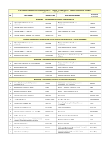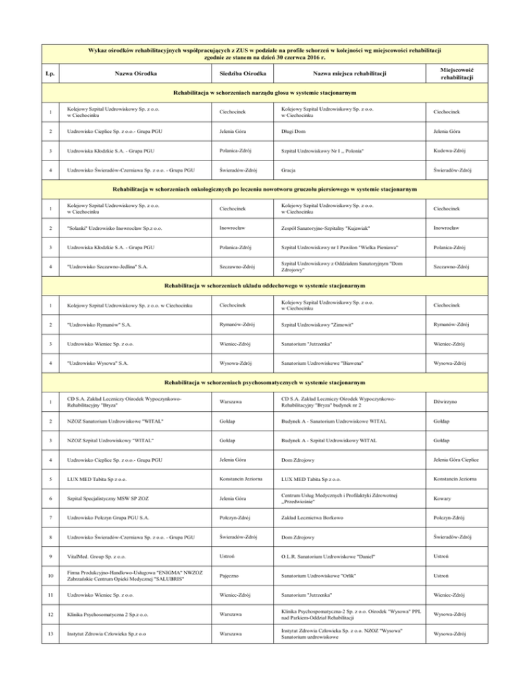 Wykaz ośrodków rehabilitacyjnych współpracujących z ZUS w podziale na profile schorzeń w kolejności wg miejscowości rehabilitacji zgodnie ze stanem na dzień 30 czerwca 2016 r. Lp. Nazwa Ośrodka Siedziba Ośrodka Nazwa miejsca rehabilitacji Miejscowość rehabilitacji Rehabilitacja w schorzeniach narządu głosu w systemie stacjonarnym 1 Kolejowy Szpital Uzdrowiskowy Sp. z o.o. w Ciechocinku Ciechocinek Kolejowy Szpital Uzdrowiskowy Sp. z o.o. w Ciechocinku Ciechocinek 2 Uzdrowisko Cieplice Sp. z o.o.- Grupa PGU Jelenia Góra Długi Dom Jelenia Góra 3 Uzdrowiska Kłodzkie S.A. - Grupa PGU Polanica-Zdrój Szpital Uzdrowiskowy Nr I ,, Polonia" Kudowa-Zdrój 4 Uzdrowisko Świeradów-Czerniawa Sp. z o.o. - Grupa PGU Świeradów-Zdrój Gracja Świeradów-Zdrój Rehabilitacja w schorzeniach onkologicznych po leczeniu nowotworu gruczołu piersiowego w systemie stacjonarnym 1 Kolejowy Szpital Uzdrowiskowy Sp. z o.o. w Ciechocinku Ciechocinek Kolejowy Szpital Uzdrowiskowy Sp. z o.o. w Ciechocinku Ciechocinek 2 "Solanki" Uzdrowisko Inowrocław Sp.z o.o. Inowrocław Zespół Sanatoryjno-Szpitalny "Kujawiak" Inowrocław 3 Uzdrowiska Kłodzkie S.A. - Grupa PGU Polanica-Zdrój Szpital Uzdrowiskowy nr I Pawilon "Wielka Pieniawa" Polanica-Zdrój 4 "Uzdrowisko Szczawno-Jedlina" S.A. Szczawno-Zdrój Szpital Uzdrowiskowy z Oddziałem Sanatoryjnym "Dom Zdrojowy" Szczawno-Zdrój Rehabilitacja w schorzeniach układu oddechowego w systemie stacjonarnym 1 Kolejowy Szpital Uzdrowiskowy Sp. z o.o. w Ciechocinku Ciechocinek Kolejowy Szpital Uzdrowiskowy Sp. z o.o. w Ciechocinku Ciechocinek 2 "Uzdrowisko Rymanów" S.A. Rymanów-Zdrój Szpital Uzdrowiskowy "Zimowit" Rymanów-Zdrój 3 Uzdrowisko Wieniec Sp. z o.o. Wieniec-Zdrój Sanatorium "Jutrzenka" Wieniec-Zdrój 4 "Uzdrowisko Wysowa" S.A. Wysowa-Zdrój Sanatorium Uzdrowiskowe "Biawena" Wysowa-Zdrój Rehabilitacja w schorzeniach psychosomatycznych w systemie stacjonarnym 1 CD S.A. Zakład Leczniczy Ośrodek WypoczynkowoRehabilitacyjny "Bryza" Warszawa CD S.A. Zakład Leczniczy Ośrodek WypoczynkowoRehabilitacyjny "Bryza" budynek nr 2 Dźwirzyno 2 NZOZ Sanatorium Uzdrowiskowe "WITAL" Gołdap Budynek A - Sanatorium Uzdrowiskowe WITAL Gołdap 3 NZOZ Szpital Uzdrowiskowy "WITAL" Gołdap Budynek A - Szpital Uzdrowiskowy WITAL Gołdap 4 Uzdrowisko Cieplice Sp. z o.o.- Grupa PGU Jelenia Góra Dom Zdrojowy Jelenia Góra Cieplice 5 LUX MED Tabita Sp z o.o. Konstancin Jeziorna LUX MED Tabita Sp z o.o. Konstancin Jeziorna 6 Szpital Specjalistyczny MSW SP ZOZ Jelenia Góra Centrum Usług Medycznych i Profilaktyki Zdrowotnej ,,Przedwiośnie" Kowary 7 Uzdrowisko Połczyn Grupa PGU S.A. Połczyn-Zdrój Zakład Lecznictwa Borkowo Połczyn-Zdrój 8 Uzdrowisko Świeradów-Czerniawa Sp. z o.o. - Grupa PGU Świeradów-Zdrój Dom Zdrojowy Świeradów-Zdrój 9 VitalMed. Group Sp. z o.o. Ustroń O.L.R. Sanatorium Uzdrowiskowe "Daniel" Ustroń 10 Firma Produkcyjno-Handlowo-Usługowa "ENIGMA" NWZOZ Zabrzańskie Centrum Opieki Medycznej "SALUBRIS" Pajęczno Sanatorium Uzdrowiskowe "Orlik" Ustroń 11 Uzdrowisko Wieniec Sp. z o.o. Wieniec-Zdrój Sanatorium "Jutrzenka" Wieniec-Zdrój 12 Klinika Psychosomatyczna 2 Sp.z o.o. Warszawa Klinika Psychospomatyczna-2 Sp. z o.o. Ośrodek "Wysowa" PPL nad Parkiem-Oddział Rehabilitacji Wysowa-Zdrój 13 Instytut Zdrowia Człowieka Sp.z o.o Warszawa Instytut Zdrowia Człowieka Sp. z o.o. NZOZ "Wysowa" Sanatorium uzdrowiskowe Wysowa-Zdrój Wykaz ośrodków rehabilitacyjnych współpracujących z ZUS w podziale na profile schorzeń w kolejności wg miejscowości rehabilitacji zgodnie ze stanem na dzień 30 czerwca 2016 r. 14 Warszawa Klinika Psychosomatyczna Sp. z o.o. Klinika Psychosomatyczna Sp. z o.o. Ośrodek "Wysowa" NZOZOddział Rehabilitacji Wysowa-Zdrój Rehabilitacja w schorzeniach układu krążenia w systemie stacjonarnym 1 ProCardia Sp.j. Z.Kasprowicz, A. Ziółek Białystok NZOZ "Procardia" Augustów 2 RUTKOWSKI LTD. Sp.z o o. Toruń NZOZ - St.George Ciechocinek-Sanatorium Ciechocinek 3 "Solanki" Uzdrowisko Inowrocław Sp.z o.o. Inowrocław Zespół Sanatoryjno-Szpitalny "Kujawiak" Inowrocław 4 "Uzdrowisko Szczawno-Jedlina" S.A. Szczawno-Zdrój Szpital Uzdrowiskowy z Oddziałem Sanatoryjnym Nr 7 w Jedlinie Zdroju "Dom Zdrojowy" Jedlina-Zdrój 5 Przedsiębiorstwo Handlowo-Turystyczne "LEMAX-TOUR" Sp. z o.o. Stegna Sanatorium "Zefir" Krynica Morska 6 Sanatorium Uzdrowiskowe ZNP - ZG NZOZ Nałęczów NZOZ Sanatorium Uzdrowiskowe ZNP Nałęczów 7 Uzdrowiska Kłodzkie S.A. - Grupa PGU Polanica-Zdrój Szpital Uzdrowiskowy NR I Pawilon "Wielka Pieniawa" Polanica-Zdrój 8 "Uzdrowisko-Rabka" S.A. Rabka-Zdrój Szpital Kardiologiczny Rabka-Zdrój 9 "Uzdrowisko Rymanów" S.A. Rymanów-Zdrój Szpital Uzdrowiskowy "Eskulap" Rymanów-Zdrój 10 Zakład Handlowo-Usługowo-Gastronomiczny "LEMAX" Stegna Sanatorium "Fala" Stegna 11 Przedsiębiorstwo Uzdrowiskowe "Ustroń" S.A. Ustroń Sanatorium i Szpital Uzdrowiskowy ,,Równica" Ustroń 12 Uzdrowisko Wieniec Sp. z o.o. Wieniec-Zdrój Sanatorium "Jutrzenka" Wieniec-Zdrój Rehabilitacja w schorzeniach układu krążenia w systemie ambulatoryjnym 1 Wojewódzki Szpital Specjalistyczny im. Stefana Kardynała Wyszyńskiego SP ZOZ Lublin Wojewódzki Szpital Specjalistyczny im. Stefana Kardynała Wyszyńskiego SP ZOZ Blok A Lublin 2 Centrum Rehabilitacji "KRASZEWSKIEGO" Łódź Intermedicus Centrum Rehabilitacji dr. Anny Błaszczyk Łódź 3 I-Kar Sp. z o.o. Poznań NZOZ I-KAR Centrum Chorób Serca i Układu Krążenia Poznań Rehabilitacja w schorzeniach układu krążenia monitorowana telemedycznie w systemie ambulatoryjnym 1 Uniwersyteckie Centrum Kliniczne Gdańsk Uniwersyteckie Centrum Kliniczne Gdańsk 2 Krakowski Szpital Specjalistyczny im. Jana Pawła II Kraków Ośrodek Rehabilitacji-Oddział Rehabilitacji Kardiologicznej Kraków 3 Instytut Kardiologii im. Prymasa Tysiąclecia Stefana Kardynała Wyszyńskiego Warszawa Centrum Telekardiologii Warszawa 4 Centrum Kardiologiczne "PRO CORDE" Sp. z o.o. W