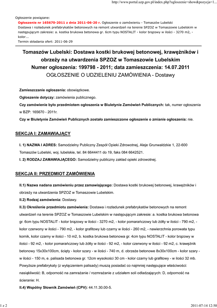 1z2 http://www.portal.uzp.gov.pl/index.php?ogloszenie=show&pozycja=1... Ogłoszenie powiązane: Ogłoszenie nr 165670-2011 z dnia 2011-06-20 r. Ogłoszenie o zamówieniu - Tomaszów Lubelski Dostawa i rozładunek prefabrykatów betonowych na remont utwardzeń na terenie SPZOZ w Tomaszowie Lubelskim w następującym zakresie: a. kostka brukowa betonowa gr. 6cm typu NOSTALIT - kolor brązowy w ilości - 3270 m2, kolor... Termin składania ofert: 2011-06-29 Tomaszów Lubelski: Dostawa kostki brukowej betonowej, krawężników i obrzeży na utwardzenia SPZOZ w Tomaszowie Lubelskim Numer ogłoszenia: 199798 - 2011; data zamieszczenia: 14.07.2011 OGŁOSZENIE O UDZIELENIU ZAMÓWIENIA - Dostawy Zamieszczanie ogłoszenia: obowiązkowe. Ogłoszenie dotyczy: zamówienia publicznego. Czy zamówienie było przedmiotem ogłoszenia w Biuletynie Zamówień Publicznych: tak, numer ogłoszenia w BZP: 165670 - 2011r. Czy w Biuletynie Zamówień Publicznych zostało zamieszczone ogłoszenie o zmianie ogłoszenia: nie. SEKCJA I: ZAMAWIAJĄCY I. 1) NAZWA I ADRES: Samodzielny Publiczny Zespół Opieki Zdrowotnej, Aleje Grunwaldzkie 1, 22-600 Tomaszów Lubelski, woj. lubelskie, tel. 84 6644411 do 19, faks 084 6642521. I. 2) RODZAJ ZAMAWIAJĄCEGO: Samodzielny publiczny zakład opieki zdrowotnej. SEKCJA II: PRZEDMIOT ZAMÓWIENIA II.1) Nazwa nadana zamówieniu przez zamawiającego: Dostawa kostki brukowej betonowej, krawężników i obrzeży na utwardzenia SPZOZ w Tomaszowie Lubelskim. II.2) Rodzaj zamówienia: Dostawy. II.3) Określenie przedmiotu zamówienia: Dostawa i rozładunek prefabrykatów betonowych na remont utwardzeń na terenie SPZOZ w Tomaszowie Lubelskim w następującym zakresie: a. kostka brukowa betonowa gr. 6cm typu NOSTALIT - kolor brązowy w ilości - 3270 m2, - kolor pomarańczowy lub żółty w ilości - 790 m2, kolor czerwony w ilości - 790 m2, - kolor grafitowy lub czarny w ilości - 260 m2, - nawierzchnia porowata typu kornik, kolor czarny w ilości - 10 m2, b. kostka brukowa betonowa gr. 4cm typu NOSTALIT - kolor brązowy w ilości - 92 m2, - kolor pomarańczowy lub żółty w ilości - 92 m2, - kolor czerwony w ilości - 92 m2, c. krawężnik betonowy 15x30x100cm, ścięty - kolor szary - w ilości - 740 m, d. obrzeże betonowe 8x30x100cm - kolor szary w ilości - 150 m, e. palisada betonowa gr. 12cm wysokości 30 cm - kolor czarny lub grafitowy - w ilości 32 mb. Powyższe prefabrykaty (z wyłączeniem palisady) muszą posiadać co najmniej następujące właściwości: nasiąkliwość: B, odporność na zamrażanie / rozmrażanie z udziałem soli odladzających: D, odporność na ścieranie: H. II.4) Wspólny Słownik Zamówień (CPV): 44.11.30.00-5. 2011-07-14 12:50 2z2 http://www.portal.uzp.gov.pl/index.php?ogloszenie=show&pozycja=1... SEKCJA III: PROCEDURA III.1) TRYB UDZIELENIA ZAMÓWIENIA: Przetarg nieograniczony III.2) INFORMACJE ADMINISTRACYJNE Zamówienie dotyczy projektu/programu finansowanego ze środków Unii Europejskiej: nie SEKCJA IV: UDZIELENIE ZAMÓWIENIA IV.1) DATA UDZIELENIA ZAMÓWIENIA: 11.07.2011. IV.2) LICZBA OTRZYMANYCH OFERT: 5. IV.3) LICZBA ODRZUCONYCH OFERT: 0. IV.4) NAZWA I ADRES WYKONAWCY, KTÓREMU UDZIELONO ZAMÓWIENIA: ZAKŁAD WAPIENNO - PIASKOWY BEŁŻEC Sp. z o.o., Wąska 121, 22-670 Bełżec, kraj/woj. lubelskie. IV.5) Szacunkowa wartość zamówienia (bez VAT): 306156,35 PLN. IV.6) INFORMACJA O CENIE WYBRANEJ OFERTY ORAZ O OFERTACH Z NAJNIŻSZĄ I NAJWYŻSZĄ CENĄ Cena wybranej oferty: 162007,20 Oferta z najniższą ceną: 162007,20 / Oferta z najwyższą ceną: 181824,80 Waluta: PLN. 2011-07-14 12:50