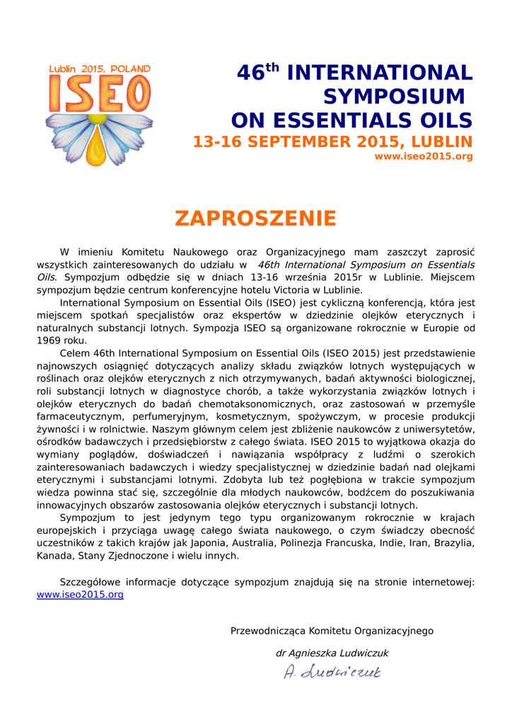 46th INTERNATIONAL SYMPOSIUM ON ESSENTIALS OILS 13-16 SEPTEMBER 2015, LUBLIN www.iseo2015.org ZAPROSZENIE W imieniu Komitetu Naukowego oraz Organizacyjnego mam zaszczyt zaprosić wszystkich zainteresowanych do udziału w 46th International Symposium on Essentials Oils. Sympozjum odbędzie się w dniach 13-16 września 2015r w Lublinie. Miejscem sympozjum będzie centrum konferencyjne hotelu Victoria w Lublinie. International Symposium on Essential Oils (ISEO) jest cykliczną konferencją, która jest miejscem spotkań specjalistów oraz ekspertów w dziedzinie olejków eterycznych i naturalnych substancji lotnych. Sympozja ISEO są organizowane rokrocznie w Europie od 1969 roku. Celem 46th International Symposium on Essential Oils (ISEO 2015) jest przedstawienie najnowszych osiągnięć dotyczących analizy składu związków lotnych występujących w roślinach oraz olejków eterycznych z nich otrzymywanych, badań aktywności biologicznej, roli substancji lotnych w diagnostyce chorób, a także wykorzystania związków lotnych i olejków eterycznych do badań chemotaksonomicznych, oraz zastosowań w przemyśle farmaceutycznym, perfumeryjnym, kosmetycznym, spożywczym, w procesie produkcji żywności i w rolnictwie. Naszym głównym celem jest zbliżenie naukowców z uniwersytetów, ośrodków badawczych i przedsiębiorstw z całego świata. ISEO 2015 to wyjątkowa okazja do wymiany poglądów, doświadczeń i nawiązania współpracy z ludźmi o szerokich zainteresowaniach badawczych i wiedzy specjalistycznej w dziedzinie badań nad olejkami eterycznymi i substancjami lotnymi. Zdobyta lub też pogłębiona w trakcie sympozjum wiedza powinna stać się, szczególnie dla młodych naukowców, bodźcem do poszukiwania innowacyjnych obszarów zastosowania olejków eterycznych i substancji lotnych. Sympozjum to jest jedynym tego typu organizowanym rokrocznie w krajach europejskich i przyciąga uwagę całego świata naukowego, o czym świadczy obecność uczestników z takich krajów jak Japonia, Australia, Polinezja Francuska, Indie, Iran, Brazylia, Kanada, Stany Zjednoczone i wielu innych. Szczegółowe informacje dotyczące sympozjum znajdują się na stronie internetowej: www.iseo2015.org Przewodnicząca Komitetu Organizacyjnego dr Agnieszka Ludwiczuk Organizatorzy Uniwersytet Medyczny w Lublinie Katedra i Zakład Farmakognozji z Pracownią Roślin Leczniczych, Uniwersytet Medyczny w Lublinie Polska Akademia Nauk Komitet Organizacyjny Przewodnic ząca: Sekretarz: Członkowie: Agnieszka Ludwiczuk Krystyna SkalickaWoźniak Kazimierz Głowniak Tomasz Baj Magdalena Bartnik Aleksandra Józefczyk Małgorzata Kozyra Wirginia Kukuła-Koch Marek Kwietniewski Tomasz Mroczek Elwira Sieniawska Jarosław Widelski Grażyna Zgórka Stały Komitet Naukowy Yoshinori Asakawa (Tokushima, Japonia) Nicolas Baldovini (Nicea, Francja) K. Hüsnü Can Baser (Eskisehir, Turcja) Carlo Bicchi (Turyn, Włochy) Gerhard Buchbauer (Wiedeń, Austria) Alain Chaintreau (Genewa, Szwajcaria) Fatih Demirci (Eskisehir, Turcja) Jan Demyttenaere (Bruksela, Belgia) Ana Cristina Figueiredo (Lizbona, Portugalia) Chlodwig Franz (Wiedeń, Austria) Jan Karlsen (Oslo, Norwegia) Karl-Heinz Kubeczka (Margetshoechheim, Niemcy) Stanislaw Lochyński (Wrocław, Polska) Agnieszka Ludwiczuk (Lublin, Polska) Luigi Mondello (Mesyna, Włochy) Johannes Novak (Wiedeń, Austria) Patrizia Rubiolo (Turyn, Włochy) Hans Scheffer (Lejda, Holandia) Alvaro Viljoen (Pretoria, Republika Południowej Afryki) Éva Németh-Zámboriné (Budapeszt, Węgry) Harmonogram sympozjum 13 14 15 16 września września września września (niedziela): Rejestracja uczestników; koktajl powitalny (poniedziałek): Sesje naukowe i pierwsza sesja posterowa; czas wolny (wtorek): Sesje naukowe i pierwsza sesja posterowa; uroczysta kolacja (środa): Sesje naukowe, Podsumowanie i zamknięcie Sympozjum, wycieczka WAŻNE DATY! 31 marzec 2015 nadsyłanie streszczeń 25 maj 2015 powiadomienie o przyjęciu abstraktów 30 czerwiec 2015 opłata rejestracyjna Język konferencji Oficjalnym językiem sympozjum jest język angielski Opłaty konferencyjne: Uczestnicy Studenci Osoby towarzyszące przed 30 czerwca 2015 350 EUR 250 EUR 130 EUR Po 30 czerwca 2015 400 EUR 300 EUR 150 EUR Opłata na miejscu 450 EUR 350 EUR 150 EUR opłata konferencyjna dla uczestników i studentów obejmuje: wstęp na wszystkie sesje naukowe drukowane materiały sympozjalne wraz z teczką koktajl powitalny przerwy kawowe obiady opłata konferencyjna dla osób towarzyszących obejmuje: koktajl powitalny obiady wycieczka w trakcie sympozjum DANE KONTAKTOWE Przewodnicząca: dr Agnieszka Ludwiczuk Sekretarz: dr Krystyna SkalickaWozniak Katedra i zakład Farmakognozji z Pracownią Roślin Leczniczych Uniwersytet Medyczny w Lublinie ul. Chodźki 1, 20-093 Lublin tel.: 81 7423710 faks: 81 7423809 e-mail: [email protected] Katedra i zakład Farmakognozji z Pracownią Roślin Leczniczych Uniwersytet Medyczny w Lublinie ul. Chodźki 1, 20-093 Lublin tel.: 81 7423807 faks: 81 7423809 e-mail: [email protected]