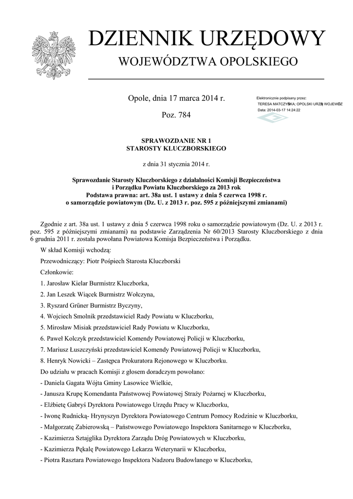 DZIENNIK URZĘDOWY WOJEWÓDZTWA OPOLSKIEGO Opole, dnia 17 marca 2014 r. Elektronicznie podpisany przez: TERESA MATCZYŃSKA; OPOLSKI URZĄD WOJEWÓDZKI Poz. 784 Data: 2014-03-17 14:24:22 SPRAWOZDANIE NR 1 STAROSTY KLUCZBORSKIEGO z dnia 31 stycznia 2014 r. Sprawozdanie Starosty Kluczborskiego z działalności Komisji Bezpieczeństwa i Porządku Powiatu Kluczborskiego za 2013 rok Podstawa prawna: art. 38a ust. 1 ustawy z dnia 5 czerwca 1998 r. o samorządzie powiatowym (Dz. U. z 2013 r. poz. 595 z późniejszymi zmianami) Zgodnie z art. 38a ust. 1 ustawy z dnia 5 czerwca 1998 roku o samorządzie powiatowym (Dz. U. z 2013 r. poz. 595 z późniejszymi zmianami) na podstawie Zarządzenia Nr 60/2013 Starosty Kluczborskiego z dnia 6 grudnia 2011 r. została powołana Powiatowa Komisja Bezpieczeństwa i Porządku. W skład Komisji wchodzą: Przewodniczący: Piotr Pośpiech Starosta Kluczborski Członkowie: 1. Jarosław Kielar Burmistrz Kluczborka, 2. Jan Leszek Wiącek Burmistrz Wołczyna, 3. Ryszard Grűner Burmistrz Byczyny, 4. Wojciech Smolnik przedstawiciel Rady Powiatu w Kluczborku, 5. Mirosław Misiak przedstawiciel Rady Powiatu w Kluczborku, 6. Paweł Kolczyk przedstawiciel Komendy Powiatowej Policji w Kluczborku, 7. Mariusz Łuszczyński przedstawiciel Komendy Powiatowej Policji w Kluczborku, 8. Henryk Nowicki – Zastępca Prokuratora Rejonowego w Kluczborku. Do udziału w pracach Komisji z głosem doradczym powołano: - Daniela Gagata Wójta Gminy Lasowice Wielkie, - Janusza Krupę Komendanta Państwowej Powiatowej Straży Pożarnej w Kluczborku, - Elżbietę Gabryś Dyrektora Powiatowego Urzędu Pracy w Kluczborku, - Iwonę Rudnicką- Hrynyszyn Dyrektora Powiatowego Centrum Pomocy Rodzinie w Kluczborku, - Małgorzatę Zabierowską – Państwowego Powiatowego Inspektora Sanitarnego w Kluczborku, - Kazimierza Sztajglika Dyrektora Zarządu Dróg Powiatowych w Kluczborku, - Kazimierza Pękalę Powiatowego Lekarza Weterynarii w Kluczborku, - Piotra Rasztara Powiatowego Inspektora Nadzoru Budowlanego w Kluczborku, Dziennik Urzędowy Województwa Opolskiego –2– Poz. 784 - Józefa Maciołka Prezesa Powiatowego Centrum Zdrowia S.A. NZOZ Szpital Powiatowy w Kluczborku, - Rozalię Słoniowską Naczelnika Wydziału Edukacji i Sportu Starostwa Powiatowego w Kluczborku, - Norberta Barcza Naczelnika Wydziału Komunikacji i Transportu Starostwa Powiatowego w Kluczborku, - Mieczysława Zalecińskiego Naczelnika Wydziału Spraw Obywatelskich, Zarządzania Kryzysowego i Promocji Zdrowia Starostwa Powiatowego w Kluczborku. Komisja została powołana w celu realizacji zadań Starosty w zakresie zwierzchnictwa nad powiatowymi służbami, inspekcjami i strażami oraz zadań określonych w ustawach w zakresie porządku publicznego i bezpieczeństwa obywateli. Powołana Komisja przejęła cele działalności i zadania do realizacji Komisji powołanych wcześniej tzn. realizację „Powiatowego Programu Zapobiegania Przestępczości oraz Ochrony Bezpieczeństwa Obywateli Porządku Publicznego na lata 2013 – 2018”. Celem Komisji jest zwiększenie aktywności podmiotów działających w sferze bezpieczeństwa i porządku publicznego, a także szeroko pojętego wychowania młodzieży. Powiatowy Program Zapobiegania Przestępczości oraz Ochrony Bezpieczeństwa Obywateli Porządku Publicznego nałożył wiele zadań na samorządy, podmioty zajmujące się bezpieczeństwem i porządkiem publicznym, szkoły i wszystkich tych, którym drogie jest bezpieczeństwo naszego powiatu. W dniu 19.12.2013 roku odbyło się wspólne posiedzenie członków Powiatowego Zespołu Zarządzania Kryzysowego oraz Powiatowej Komisji Bezpieczeństwa i Porządku, które otworzył Pan Piotr Pośpiech - Starosta Kluczborski - Przewodniczący Komisji Bezpieczeństwa i Porządku oraz Pan Mieczysław Czapliński Wicestarosta Kluczborski - Szef Powiatowego Zespołu Zarządzania Kryzysowego. Po przywitaniu przybyłych uczestników przystąpiono do realizacji planu posiedzenia: 1. Przygotowanie i funkcjonowanie powiatu kluczborskiego w warunkach zagrożeń okresu zimowego 2013/2014, w tym: - przygotowanie służb odpowiedzialnych za zimowe utrzymanie dróg, - przygotowanie służb energetycznych, ciepłowniczych, gazowniczych oraz wodociągowych do okresu zimowego; - przedsięwzięcia w zakresie pomocy potrzebującym wsparcia w warunkach niskich temperatur, - nadzór nad obiektami wielkopowierzchniowymi w sytuacji wystąpienia dużych opadów śniegu, - bezpieczeństwo dzieci i młodzieży w okresie ferii zimowych w 2014 r. 2. Przedstawienie informacji o zrealizowanych zadaniach w 2013 roku oraz planowanych zamierzeniach drogowych w 2014 roku na terenie powiatu kluczborskiego przez Generalną Dyrekcję Dróg Krajowych i Autostrad Oddziału Opole, Rejon w Kluczborku oraz Zarząd Dróg Wojewódzkich Oddział Terenowy w Oleśnie. 3. Przedstawienie przez Pana Piotra Pośpiecha - Starostę Kluczborskiego informacji o zrealizowanych zadaniach zmierzających do poprawy bezpieczeństwa obywateli na terenie powiatu w 2013 r. 4. Przedstawienie przez Starostę Kluczborskiego informacji o przeznaczeniu środków finansowych z budżetu powiatu na zadania związane z poprawą bezpieczeństwa obywateli na terenie powiatu w 2014 roku. 5. Wyrażenie opinii przez członków Powiatowej Komisji Bezpieczeństwa i Porządku na temat przeznaczenia środków finansowych z budżetu na zadania związane z poprawą bezpieczeństwa obywateli na terenie powiatu w 2014 roku. Pan Piotr Pośpiech Starosta Kluczborski po przywitaniu przybyłych, tytułem formalności względem obecności członków Powiatowej Komisji Bezpieczeństwa i Porządku zwrócił uwagę, że w związku z obecnością sześciu z dziewięciu członków Komisji Bezpieczeństwa i Porządku głosowanie jest możliwe, a podejmowane decyzje będą miały moc wiążącą. ad. 1 przygotowanie i funkcjonowanie powiatu kluczborskiego w warunkach zagrożeń okresu zimowego 2013/2014; Bezpieczeństwo dzieci 