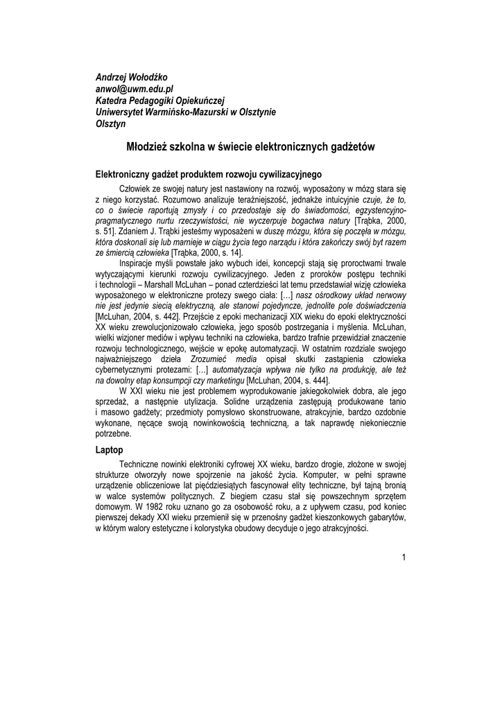 Andrzej Wołodźko [email protected] Katedra Pedagogiki Opiekuńczej Uniwersytet Warmińsko-Mazurski w Olsztynie Olsztyn Młodzież szkolna w świecie elektronicznych gadżetów Elektroniczny gadżet produktem rozwoju cywilizacyjnego Człowiek ze swojej natury jest nastawiony na rozwój, wyposażony w mózg stara się z niego korzystać. Rozumowo analizuje teraźniejszość, jednakże intuicyjnie czuje, że to, co o świecie raportują zmysły i co przedostaje się do świadomości, egzystencyjnopragmatycznego nurtu rzeczywistości, nie wyczerpuje bogactwa natury [Trąbka, 2000, s. 51]. Zdaniem J. Trąbki jesteśmy wyposażeni w duszę mózgu, która się poczęła w mózgu, która doskonali się lub marnieje w ciągu życia tego narządu i która zakończy swój byt razem ze śmiercią człowieka [Trąbka, 2000, s. 14]. Inspiracje myśli powstałe jako wybuch idei, koncepcji stają się proroctwami trwale wytyczającymi kierunki rozwoju cywilizacyjnego. Jeden z proroków postępu techniki i technologii – Marshall McLuhan – ponad czterdzieści lat temu przedstawiał wizję człowieka wyposażonego w elektroniczne protezy swego ciała: […] nasz ośrodkowy układ nerwowy nie jest jedynie siecią elektryczną, ale stanowi pojedyncze, jednolite pole doświadczenia [McLuhan, 2004, s. 442]. Przejście z epoki mechanizacji XIX wieku do epoki elektryczności XX wieku zrewolucjonizowało człowieka, jego sposób postrzegania i myślenia. McLuhan, wielki wizjoner mediów i wpływu techniki na człowieka, bardzo trafnie przewidział znaczenie rozwoju technologicznego, wejście w epokę automatyzacji. W ostatnim rozdziale swojego najważniejszego dzieła Zrozumieć media opisał skutki zastąpienia człowieka cybernetycznymi protezami: […] automatyzacja wpływa nie tylko na produkcję, ale też na dowolny etap konsumpcji czy marketingu [McLuhan, 2004, s. 444]. W XXI wieku nie jest problemem wyprodukowanie jakiegokolwiek dobra, ale jego sprzedaż, a następnie utylizacja. Solidne urządzenia zastępują produkowane tanio i masowo gadżety; przedmioty pomysłowo skonstruowane, atrakcyjnie, bardzo ozdobnie wykonane, nęcące swoją nowinkowością techniczną, a tak naprawdę niekoniecznie potrzebne. Laptop Techniczne nowinki elektroniki cyfrowej XX wieku, bardzo drogie, złożone w swojej strukturze otworzyły nowe spojrzenie na jakość życia. Komputer, w pełni sprawne urządzenie obliczeniowe lat pięćdziesiątych fascynował elity techniczne, był tajną bronią w walce systemów politycznych. Z biegiem czasu stał się powszechnym sprzętem domowym. W 1982 roku uznano go za osobowość roku, a z upływem czasu, pod koniec pierwszej dekady XXI wieku przemienił się w przenośny gadżet kieszonkowych gabarytów, w którym walory estetyczne i kolorystyka obudowy decyduje o jego atrakcyjności. 1 Pozbawione mechanizmów ruchomych notebooki klasy Ultra-Mobile PC (ASUS Eee) powoli stają się podręczną zabawką, przydatną do nauki, pracy i rozrywki, dostarczającą wspaniałych doznań korzystania z Internetu. Zaciera się granica między tym, co jest uznawane jako zabawka, a tym, co jest „poważnym” urządzeniem przeznaczonym tylko dla dorosłych. Przewidując, można stwierdzić, że za kilka lat laptopa będzie można kupić w dworcowym kiosku, jak to jest dzisiaj z kalkulatorami, trzydzieści lat temu traktowanymi jako niedostępny dla każdego ze względu na cenę sprzęt zastępujący suwak logarytmiczny. Już teraz są tworzone światowe programy stawiające sobie za cel wyposażenie każdego dziecka na świecie w laptop, umożliwiający dostęp do zasobów wiedzy i oświaty. Ogólnoświatowe przedsięwzięcie „laptop dla każdego dziecka” zakłada wyprodukowanie urządzenia za cenę jednostkową do stu dolarów, sprzedawanego rządom różnych krajów, które z kolei bezpłatnie przekażą je dzieciom w szkołach. Idea komputeryzacji świata na wzór podjętej w XX wieku alfabetyzacji czytelniczej krajów trzeciego świata jest przedsięwzięciem śmiałym, moim zdaniem z trudnymi do przewidzenia w skutkach przemianami społeczno-kulturowymi. Pomysły upowszechnienia techniki „laptopowej” w Polsce na razie skupiają się na środowisku gimnazjalistów. Podjęto już prace nad wyposażeniem każdego ucznia gimnazjum w osobisty laptop do 2011 roku. Ta medialna rewolucja zapewne wymusi zmianę systemu edukacyjnego. Szkoła straci status miejsca, gdzie przekazywana jest wiedza, a funkcja wychowawcza zdominuje proces kształtowania młodego człowieka, wprowadzania w dorosłość. Nasuwa się refleksja powstania wymuszonej technologicznie adolescencji kulturowej uczniów, w której – niestety – ludzie dorośli niewiele mogą pomóc, gdyż sami spotykają się z problemami techniki po raz pierwszy i wymagają wsparcia, być może większego niż ich dzieci. Telefon komórkowy Innym gadżetem, bez którego już sobie nie wyobrażamy dzisiejszego życia jest telefon komórkowy z multimedialnymi dodatkami. Telefon komórkowy od momentu jego powstania został zaprojektowany z myślą, że będzie używany w dowolnym miejscu, jest urządzeniem „pozapokojowym” [Levinson, 2006]. Producenci aparatów komórkowych doskonale orientują się w trendach mody, kulturowych obciążeniach klienta nie tylko dorosłego, ale też subkulturach młodzieżowych. Już małych dzieci wieku przedszkolnego nie interesuje plastikowa kolorowa atrapa, domagają się urządzeń prawdziwych, takich, jakimi posługują się ich rodzice. Powszechnym jest korzystanie z promocyjnych zakupów nowych telefonów za korzystanie z tej samej sieci i oddawanie ich dzieciom. Ten elektroniczny gadżet oddawany dziecku nakręca spiralę pogoni za czymś nowym, ładnym, niekoniecznie potrzebnym. Dla operatorów ważny jest segment rynku. Początkowe wizje wprowadzenia aparatów w formie zabawek nie zakończyły się sukcesem, dzieci zdecydowanie wybierają sprzęt o jak najlepszych parametrach technicznych, wyp