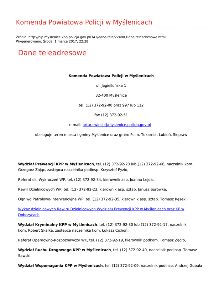 Komenda Powiatowa Policji w Myślenicach Źródło: http://bip.myslenice.kpp.policja.gov.pl/341/dane-tele/22480,Dane-teleadresowe.html Wygenerowano: Środa, 1 marca 2017, 22:38 Dane teleadresowe Komenda Powiatowa Policji w Myślenicach ul. Jagiellońska 1 32-400 Myślenice tel. (12) 372-92-00 oraz 997 lub 112 fax (12) 372-92-51 e-mail: [email protected] obsługuje teren miasta i gminy Myślenice oraz gmin: Pcim, Tokarnia, Lubień, Siepraw Wydział Prewencji KPP w Myślenicach, tel. (12) 372-92-20 lub (12) 372-92-66, naczelnik kom. Grzegorz Zając, zastępca naczelnika podinsp. Krzysztof Pyzio, Referat ds. Wykroczeń WP, tel. (12) 372-92-34, kierownik asp. Joanna Lejda, Rewir Dzielnicowych WP, tel. (12) 372-92-23, kierownik asp. sztab. Janusz Surówka, Ogniwo Patrolowo-Interwencyjne WP, tel. (12) 372-92-35, kierownik asp. sztab. Tomasz Kęsek Wykaz dzielnicowych Rewiru Dzielnicowych Wydziału Prewencji KPP w Myślenicach oraz KP w Dobczycach Wydział Kryminalny KPP w Myślenicach, tel. (12) 372-92-30 lub (12) 372-92-17, naczelnik kom. Robert Skałka, zastępca naczelnika kom. Łukasz Cichoń, Referat Operacyjno-Rozpoznawczy WK, tel. (12) 372-92-19, kierownik podkom. Tomasz Żądło, Wydział Ruchu Drogowego KPP w Myślenicach, tel. (12) 372-92-40, naczelnik podinsp. Tomasz Sawski. Wydział Wspomagania KPP w Myślenicach, tel. (12) 372-92-09, naczelnik podinsp. Andrzej Gubała Komisariat Policji w Dobczycach ul. Jagiellońska 4 32-410 Dobczyce tel. (12) 271-12-01 Komendant Komisariatu Policji w Dobczycach podinsp. Krzysztof Mięsowski, tel. (12) 271-12-01, zastępca komendanta komisariatu nadkom. Marcin Kaczmarek, tel. (12) 271-12-01. Metryczka Data publikacji 27.11.2015 Data modyfikacji 21.10.2016 Rejestr zmian Podmiot udostępniający informację: Biuletyn Informacji Publicznej Osoba wytwarzająca/odpowiadająca za informację: Szymon Sala Osoba udostępniająca informację: Szymon Sala asystent jednoosobowego stanowiska ds. prasowo-informacyjnych Komendy Powiatowej Policji w Myślenicach Osoba modyfikująca informację: Szymon Sala