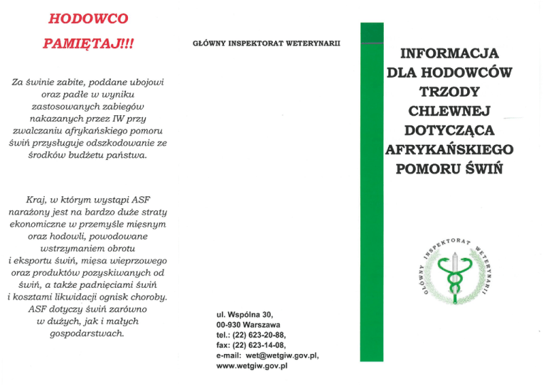 HODOWCO PAMIĘTAJ!!! GŁÓWNY INSPEKTORAT WETERYNARII INFORMACJA DLA HODOWCÓ TRZODY CHLEWNEJ DOTYCZĄCA AFRYKAŃSKIEGO Za świnie zabite, poddane ubojowi oraz padłe w wyniku zastosowanych zabiegów nakazanych przez IW przy zwalczaniu afrykańskiego pomoru świń przysługuje odszkodowanie ze środków budżetu państwa. POMORU ŚWIŃ Kraj, w którym wystąpi ASF narażony jest na bardzo duże straty ekonomiczne w przemyśle mięsnym oraz hodowli, powodowane wstrzymaniem obrotu i eksportu świń, mięsa wieprzowego oraz produktów pozyskiwanych od świń, a także padmęciami świń ; kosztami likwidacji ognisk choroby. ASF dotyczy świń zarówno w dużych, jak i małych gospodarstwach. .<.t°<Af. -.y ul. Wspólna 30, 00-930 Warszawa tel.: (22) 623-20-88, fax: (22) 623-14-08, e-mail: [email protected], www.wetgiw.gov.pl Co to Jest afrykański pomór świń? Afrykański pomór świń (ASF) to szybko szerząca się choroba wirusowa, na którą podatne są świnie domowe oraz dziki. Jak rozpoznać afrykański pomór świń? Posiadacz zwierząt, który zauważył objawy U śwłń mogą pojawić się następujące objawy: . wysoka gorączka, z tym że gorączkujące świnie Ludzie nie są wrażliwi na zakażenie wirusem ASF w związku, z czym choroba ta nie stwarza zagrożenia dla ich zdrowia i życia. mają początkowo zachowany apetyt i zachowują się normalnie; . liczne padnięcia świń w każdym wieku; . słnica skóry uszu, brzucha i boków ciała, drobne, lecz liczne wybroczyny w skórze; Najczęściej wprowadzenie wirusa ASF do kraju wolnego od choroby następuje poprzez transport, mięso, produkty mięsne, odpadki kuchenne i poubojowe, pochodzące od chorych świń . biegunka, często z domieszką krwi. Jak zapobiegać afrykańskiemu pomorowi świń? lub zakażonymi odpadkami żywnościowymi. nasuwające podejrzenie choroby zakaźnej, jest zobowiązany do natychmiastowego zgłoszenia podejrzenia choroby (obowiązek ustawowy obwarowany sankcją karną*). Zgłoszenie należy przekazać do powiatowego lekarza weterynarii bezpośrednio, albo za pośrednictwem lekarza weterynarii opiekującego się gospodarstwem lub właściwego miejscowo organu samorządu terytorialnego (wójta, . duszność, pienisty lub krwisty wypływ z nosa; i dzików. Najczęstszą przyczyną zakażenia świń jest bezpośredni kontakt ze zwierzętami zakażonymi Podejrzewasz wystąpienie afrykańskiego pomoru świń? burmistrza). Zgłosiłeś podejrzenie afrykańskiego pomoru - co dalej? Po dokonaniu zgłoszenia - do czasu przybycia urzędowego lekarza weterynarii hodowca zwierząt zobowiązany jest do: . Ograniczyć dostęp osobom postronnym do pomieszczeń lub miejsc, w których znajdują się zwierzęta, w szczególności osobom, które w ostatnim czasie przebywały na terytorium . izolacji i strzeżenia w gospodarstwie wszystkich przebywających tam zwierząt; Federacji Rosyjskiej lub Białorusi; . wstrzymania się od wywożenia, W przypadku terenów o wysokim zagęszczeniu gospodarstw utrzymujących świnie, rozprzestrzenianie się wirusa między gospodarstwami jest łatwe, za pośrednictwem osób odwiedzających gospodarstwo lub zakażonej paszy, wody, czy narzędzi. Liczne ogniska ASF zanotowano na terytorium Kaukazu i Federacji Rosyjskiej, l na terytorium Ukrainy, a od czerwca 2013 roku 2 ogniska na Białorusi, w odległości zaledwie 170 km od granicy z Polską. 4 Zabezpieczyć swoje gospodarstwo przed przedostaniem słę dzików, zabezpieczyć paszę przed dostępem zwierząt wolno żyjących; . Stosować w gospodarstwie procedury sanitarne utrzymywać gospodarstwo w czystości, dbać o czystość sprzętu używanego w gospodarstwie, stosować odkażanie bieżące, używać osobnego obuwia, odzieży ochronnej oraz narzędzi do obsługi zwierząt: . Nie wprowadzać do gospodarstwa zwierząt niewiadomego pochodzenia - bez świadectwa zdrowia lub wykazujących jakiekolwiek objawy osłabienia; wynoszenia i zbywania produktów z gospodarstwa, w szczególności mięsa, zwłok zwierzęcych, środków żywienia zwierząt, wody, ściółki, nawozów naturalnych; . uniemożliwienia dostępu osobom postronnym do pomieszczeń lub miejsc, w których znajdują się zwierzęta podejrzane o zakażenie lub chorobę. zgodnie z ustawą z dnia 11 marca 2004 roku o ochronie zdrowio. zwierząt oraz zwalczaniu chorób zakaźnych zwierząt (Dz. U. z 2008 roku Nr 213 póz. 1342zezm..) . Nie skarmiać zwierząt odpadkami żywności.