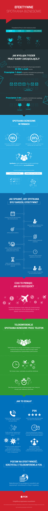 EFEKTYWNE SPOTKANIA BIZNESOWE Prowadzenie firmy to dziś niezliczona ilość: spotkań e-maili telefonów podróży służbowych JAK WYGLĄDA TYDZIEŃ PRACY KADRY ZARZĄDZAJĄCEJ? Osoby na stanowiskach zarządczych otrzymują przeciętnie 30 000 e-maili rocznie. Przeciętnie 1 dzień w tygodniu menedżerowie poświęcają na zarządzanie skrzynką mailową. ZARZĄDZANIE SKRZYNKĄ MAILOWĄ Przeciętnie 2 dni w tygodniu menedżerowie spędzają na spotkaniach biznesowych. SPOTKANIE SPOTKANIE SPOTKANIA BIZNESOWE W FIRMACH Czasu pracy w badanych organizacjach poświęcanych jest na spotkania. Brak skupienia na temacie spotkania może wydłużyć jego czas nawet o 20%. Spotkania często organizowane są bez wyraźnego powodu przez co są nieefektywne. Uczestnicy spotkań przyznają że podczas spotkań: porządkują skrzynkę e-mail wysyłają od 1 do 3 e-maili co 30 minut JAK SPRAWIĆ, ABY SPOTKANIA BYŁY BARDZIEJ EFEKTYWNE? przygotuj przejrzystą agendę tematów, które zostaną poruszone zaproś na spotkanie wyłącznie osoby, których udział jest niezbędny zdefiniuj jasny cel spotkania przygotuj niezbędne materiały dla uczestników zadbaj o optymalne warunki spotkania (czyste, dobrze przewietrzone pomieszczenie, temp. ok 20°C) maksymalnie ogranicz długość spotkania, np. do 30 minut zadbaj o punktualność uczestników (np. spóźnieni dorzucają się do karnej skarbonki) ustal w firmie zasady dotyczące tego kto może zwoływać spotkania CZAS TO PIENIĄDZ. JAK GO OSZCZĘDZIĆ? Spotkania biznesowe często wiążą się z koniecznością wyjazdów służbowych. W ten sposób tracimy czas na dojazdy i ponosimy koszty podróży. TELEKONFERENCJE SPOTKANIA BIZNESOWE PRZEZ TELEFON Telekonferencje to usługa umożliwiająca przeprowadzenie wielostronnego połączenia telefonicznego nawet z kilkudziesięcioma użytkownikami jednocześnie. Nie tracisz czasu i pieniędzy na podróże służbowe. Skonfigurowanie pokoju konferencyjnego trwa mniej niż minutę i jest całkowicie darmowe. JAK TO DZIAŁA? Zadzwoń pod numer 801 00 95 95 lub 22 18 81 000 i postępuj zgodnie z instrukcjami lektora. Ustal PIN dla pokoju telekonferencyjnego oraz zapisz numer telekonferencji. Prześlij uczestnikom spotkania dane dostępowe i numer, na który należy dzwonić. Rozpocznij telekonferencję w dogodnym terminie (pokój telekonferencyjny dostępny jest przez 7 dni od momentu założenia) Połączenie z numerem telekonferencji jest całkowicie darmowe dla użytkowników FCN (dla pozostałych naliczane jest wg stawek operatora jak za poł. z nr stacjonarnym) Możliwe jest stworzenie spersonalizowanych pokoi telekonferencyjnych z dedykowanym numerem oraz komunikatami głosowymi. POSTAW NA EFEKTYWNOŚĆ. KORZYSTAJ Z TELEKONFERENCJI FCN. Telekonferencje FCN są dostępne ze wszystkich sieci stacjonarnych i komórkowych w Polsce i za granicą. Infografika przygotowana na podstawie: http://www.bain.com/about/press/press-releases/Busy-ceos-spend-nearly-one-day-each-week-managing-communications.aspx http://www.ekonomia.rp.pl/artykul/1130578.html?p=1