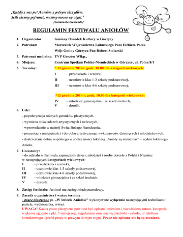 „Każdy z nas jest Aniołem z jednym skrzydłem. Jeśli chcemy pofrunąć, musimy mocno się objąć.” /Luciano De Crescendo/ REGULAMIN FESTIWALU ANIOŁÓW 1. Organizator: Gminny Ośrodek Kultury w Górzycy 2. Patronat: Marszałek Województwa Lubuskiego Pani Elżbieta Polak Wójt Gminy Górzyca Pan Robert Stolarski 3. Patronat medialny: TVP Gorzów Wlkp., 4. Miejsce: Centrum Spotkań Polsko-Niemieckich w Górzycy, ul. Polna 8/1 5. Terminy: * 11 grudnia 2014r. godz. 10.00 dla kategorii wiekowych: I – przedszkola i zerówki, II – uczniowie klas 1-3 szkoły podstawowej, III – uczniowie klas 4-6 szkoły podstawowej, *12 grudnia 2014 r. godz. 10.00 dla kategorii wiekowych: IV V – młodzież gimnazjalna i ze szkół średnich, – dorośli. 6. Cele: - popularyzacja różnych gatunków plastycznych, - wymiana doświadczeń artystycznych i twórczych, - wprowadzanie w nastrój Świąt Bożego Narodzenia, - prezentacja umiejętności i dorobku artystycznego wykonawców dziecięcych i młodzieżowych, - dostrzeżenie dobra wspólnego w społeczności lokalnej „Anioły są wśród nas” – wybór lokalnego Anioła. 7. Uczestnicy: - do udziału w festiwalu zapraszamy dzieci, młodzież i osoby dorosłe z Polski i Niemiec w następujących kategoriach wiekowych: I – przedszkola i zerówki, II – uczniowie klas 1-3 szkoły podstawowej, III – uczniowie klas 4-6 szkoły podstawowej, IV – młodzież gimnazjalna i ze szkół średnich, V – dorośli. 8. Zasięg festiwalu: festiwal ma zasięg międzynarodowy. 9. Zasady uczestnictwa i ważne terminy: - prace plastyczne pt. ,,W świecie Aniołów” wykonywane wyłącznie następującymi technikami: pastele, wydzieranka, witraż. UWAGA! Każda praca plastyczna powinna być opisana imieniem i nazwiskiem autora, kategorią wiekową zgodnie z pkt. 7 niniejszego regulaminu oraz nazwą placówki - szkoły, nr telefonu kontaktowego (przód pracy w prawym dolnym rogu). Prace nie opisane nie będą oceniane. - prace techniczne pt. ,,Przepyszny (wyborny, smakowity) Anioł” wykonane wyłącznie z artykułów spożywczych i surowców naturalnych. UWAGA! Każda praca techniczna powinna być opisana imieniem i nazwiskiem autora, kategorią wiekową zgodnie z pkt. 7 niniejszego regulaminu oraz nazwą placówki – szkoły, nr telefonu kontaktowego (kartka, kartonik itp., dobrze przymocowane do pracy). Prace nie opisane nie będą oceniane. Prace plastyczne i techniczne należy przesłać lub dostarczyć osobiście do Gminnego Ośrodka Kultury w Górzycy w terminie do dn. 1 grudnia 2014r. Oceny prac technicznych i plastycznych dokona Komisja powołana przez Dyrektora GOK w dn. 4 grudnia 2014r. Protokół z posiedzenia komisji konkursowych wraz z imienną listą zwycięzców zostanie zamieszczony na stronie internetowej Gminnego Ośrodka Kultury www.sport.kultura.gorzyca.pl w dn. 8 grudnia 2014r. - scenka rodzajowa pt. „Diabelsko-anielskie przepychanki” – czas trwania 10 min., liczba występujących max 6 osób, - wymagane pisemne zgłoszenie wg załączonego wzoru; Karty zgłoszeń należy przesyłać na adres organizatora w terminie do dn. 1 grudnia 2014r. - piosenka o tematyce anielskiej – czas trwania max. 3 min., uczestnicy będą rywalizować w dwóch grupach: soliści i zespoły. (UWAGA! Uczestnicy przesyłają płytę CD z muzyką w formacie mp3 opisaną tytułem wykonywanej piosenki wraz z kartą zgłoszenia do dnia 01.12.2014r.) - wymagane pisemne zgłoszenie wg załączonego wzoru; - własna aranżacja (kompozycja), tekst oraz żywe instrumenty będą dodatkowo punktowane. - konkurs „Anioły są wśród nas – wybieramy lokalnego Anioła” - zgłoszenia kandydatów do konkursu można dokonać do dnia 20.11.2014r.: * telefonicznie pod nr tel. 957591236, 957591584, * mailowo: [email protected], [email protected]. * poprzez portal społecznościowy facebook pn. „Gminny Ośrodek Kultury”; * osobiście w Gminnym Ośrodku Kultury ul. Polna 8/1, Górzyca. Organizator przewiduje wśród głosujących wylosowanie nagrody niespodzianki. Ogłoszenie zdobywcy tytułu „Lokalnego Anioła” oraz wręczenie nagród nastąpi podczas drugiego dnia „Festiwalu Aniołów” tj. 12.12.2014r. o godz. 10.00. 10. Nagrody: - ocenie podlegać będą walory artystyczne, kreatywność i pomysł, estetyka wykonania, - podział nagród leży w gestii odpowiedniej komisji, - werdykt komisji jest ostateczny, - laureaci otrzymają nagrody rzeczowe oraz pamiątkowe dyplomy, które odbierają osobiście w dniu festiwalu, nie przewiduje się przesyłania nagród, - nagrodzone prace przechodzą na własność organizatora i zostaną wystawione w Centrum Spotkań Polsko-Niemieckich. 11. Sprawy organizacyjne: - zgłoszenie prac jest jednoznaczne z akceptacją niniejszego regulaminu, - w sprawach nie uregulowanych regulaminem decyduje organizator, - wystawa rękodzieł lokalnych artystów, - organizator przewiduje interaktywny program dla dzieci – spotkanie ze Śnieżynką oraz Świętym Mikołajem w dniu 11.12.2014r. - organizator przewiduje możliwość wzięcia udziału w ,,warsztatach anielskich” w dniu 12.12.2014r. - organizator zaprasza do ,,Cafe Aniołek”, - w trakcie festiwalu wystawa nagrodzonych prac, ogłoszenie wyników konkursu na lokalnego anioła. 12. Miejsce składania prac: Gminny Ośrodek Kultury ul. Polna 8/1 69-113 Górzyca. Z anielskim pozdrowieniem Organizator