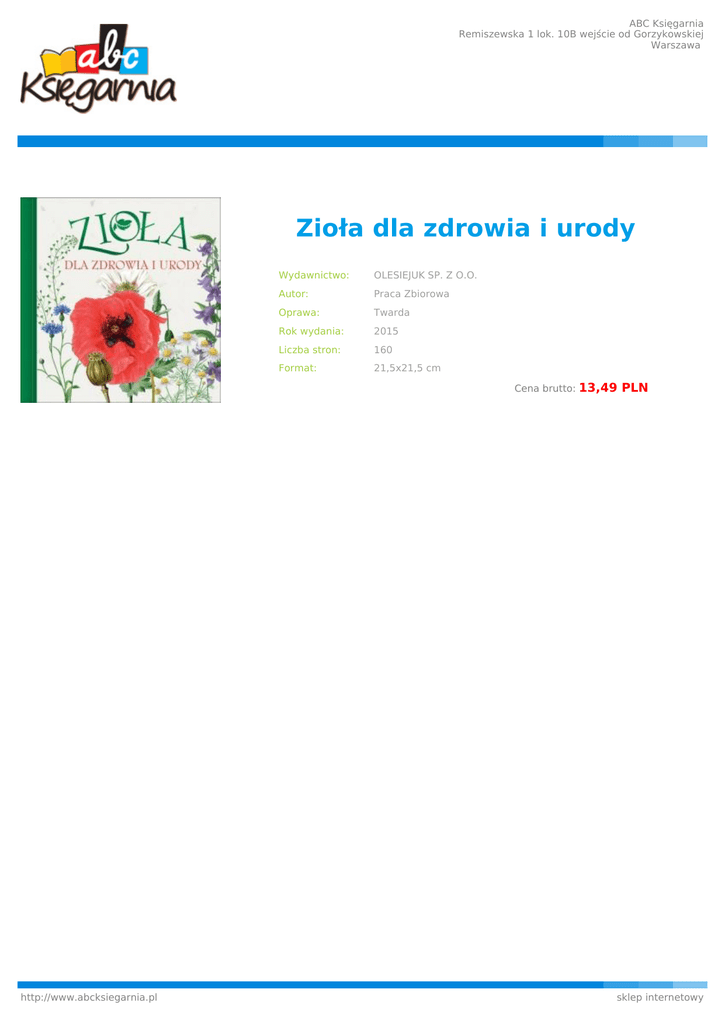 ABC Księgarnia Remiszewska 1 lok. 10B wejście od Gorzykowskiej Warszawa Zioła dla zdrowia i urody Wydawnictwo: OLESIEJUK SP. Z O.O. Autor: Praca Zbiorowa Oprawa: Twarda Rok wydania: 2015 Liczba stron: 160 Format: 21,5x21,5 cm Cena brutto: http://www.abcksiegarnia.pl 13,49 PLN sklep internetowy