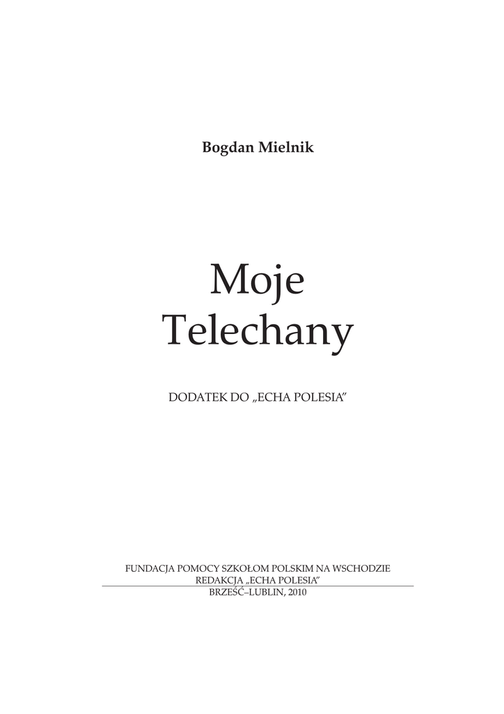 Bogdan Mielnik Moje Telechany DODATEK DO „ECHA POLESIA” FUNDACJA POMOCY SZKOŁOM POLSKIM NA WSCHODZIE REDAKCJA „ECHA POLESIA” BRZEŚĆ–LUBLIN, 2010 © Copyright by Fundacja Pomocy Szkoäom Polskim na Wschodzie im. Tadeusza Goniewicza Redakcja „Echa Polesia” dziökuje Senatowi RP oraz Fundacji „Pomoc Polakom na Wschodzie” za dofinansowanie wydania ksiñĔki B. Mielnika pt. „Moje Telechany” ISBN 978-83-60845-40-0 Fundacja Pomocy Szkoäom Polskim na Wschodzie im. Tadeusza Goniewicza 20-611 Lublin, ul. Kazimierza Wielkiego 9/60 [email protected]; telefony: (81) 747-6163; (81) 525-7160; albo 605-828-137 Druk POLIHYMNIA, Lublin CZĘŚĆ PIERWSZA: POWRÓT, RETROSPEKCJE, REFLEKSJE ROZDZIAŁ 1 W słonecznym lipcowym dniu 1967 roku, niewygodny i hałaśliwy autobus wiezie mnie kiepską szosą przez równinę sowieckiej Białorusi. Ten zabużański teren Polesia przed wybuchem drugiej światowej wojny, stanowił polskie kresy wschodnie. Szosa biegnie przez szaro-rude łąki pocięte melioracyjnymi rowami, wokół których zieleń jest żywsza i są jakieś zarośla. W innych miejscach, szosę otaczają wielkie zachwaszczone pola ziemniaków, albo słabego żyta. Od czasu do czasu, autobus mija sosnowe młodniki, poprzetykane gdzie niegdzie starymi drzewami. Patrzę na przesuwające się za oknem krajobrazy i nie ma tu nic z fotografii, zapisanej przed dwudziestu trzema laty w mojej wówczas dziecięcej pamięci. Zanim wojna wyrzuciła nas z poleskiej ziemi, szosy tutaj nie było. Biegła tędy bita droga przez niekończący się wiekowy bór, tylko w kilku miejscach poprzerywany rozległymi soczystymi łąkami, albo przylegającymi do nielicznych tutaj wsi poletkami. Droga ta łączyła miasto Pińsk, z miasteczkiem Telechany. Miasteczko było niewielkie, z niebrukowanymi ulicami, zabudowane drewnianymi domami. Na pół-chrześcijańskie, na pół-żydowskie, ot, takie, jakich na Polesiu było sporo. Żadne jednak nie nosiło tak egzotycznej nazwy. Podobno to dziwne imię miasteczka upamiętnia mogiłę tatarskiego chana, pochowanego tutaj w zamierzchłej przeszłości. Miejscowe podanie mówi, że podczas jednego z tatarskich najazdów na Ruś, napastnicy zapędzili się aż na Polesie. Mongolscy najeźdźcy jako mieszkańcy bezkresnych stepów, na otwartych przestrzeniach byli niezwyciężonymi wojownikami. Jednak w zetknięciu się z poleską przyrodą, trafiwszy na bagna i leśną głusz, nie potrafili skutecznie walczyć. Jeźdźców razem z końmi masowo pochłaniały zdradzieckie bagienne topiele, a w przepastnych borach wojowie kniazia i dzielni Poleszucy, wycinali w pień oddziały stepowych wojowników. Podczas jednej z takich potyczek, zabity został chan tatarskiej ordy. Tatarzy pochowali swojego wodza i nad mogiłą usypali kopiec. Sami zaś, wynieśli się ze śmiercionośnej dla nich poleskiej krainy, na swoje dalekie stepy. Wiele lat po tamtych wydarzeniach, w lesie nieopodal kurhanu z mogiłą chana, osiedlili się ludzie. Ta nowa osada powstała w czasach, kiedy wśród mieszkańców Polesia żywa jeszcze była pamięć o zwycięstwie ich pradziadów nad tatarskimi najeźdźcami, bowiem ustny przekaz o tym wydarzeniu, 3 przechodził z pokolenia na pokolenie. To też o nowej osadzie ludzie mówili, że leży ona tam, gdzie jest pochowane ciało chana. Ponieważ w miejscowym narzeczu słowo „ciało” brzmi „tieło”, mówiło się, że osada leży tam, gdzie Tieło-chana. Z latami przeobraziło się to w Telechany. Pierwsze zapiski o istnieniu tej miejscowości, pojawiły się w dokumentach z szesnastego wieku. Faktem jest, że na północnym skraju miasteczka już w lesie, znajduje się spory ziemny kopiec. Jeden jedyny na niekończącej się leśnej równinie. Ten kopiec według miejscowego podania, jest właśnie kurhanem kryjącym w sobie ciało tatarskiego chana. Ludzie nazywają kopiec „Łysą Górą”. Przed wojną Telechany różniły się od innych poleskich mieścin jeszcze i tym, że miały jak na ówczesne czasy świetne połączenie ze światem. A więc, była rzeczona już bita droga do Pińska, a trzy razy w tygodniu przemierzał ją regularnie autobus telechańskiego przedsiębiorcy, pana Pigulewskiego. Był także trakt wodny, w postaci kanału Ogińskiego. Od wiosennego spłynięcia lodów, aż do późnej jesieni między Pińskiem i Telechanami kursował dwa razy w tygodniu statek. Przewoził ludzi i towary. Pamiętam, że jeden ze statków przypływających do Telechan, nosił dziwaczne imię „Sekunda”. Statek ten należał do przedsiębiorcy z Pińska, Żyda Westera. Z tej wodnej komunikacji bardzo chętnie korzystali Poleszucy zamieszkujący bagienne bezdroża, przyległe do tego wodnego szlaku. Stanowiły go rzeki Prypeć, Jasiołda i kanał Ogińskiego. Uwieńczeniem komunikacyjnego komfortu Telechan była jeszcze wąskotorowa kolej, która łączyła je z Iwacewiczami i Janowem, skąd można było już jechać normalnymi pociągami w świat. Był, była, było...Koniec grzebania się w czasie przeszłym. Wracam do rzeczywistości, bo właśnie mój autobusik wjechał pomiędzy zabudowania Telechan. – Prijechali! – Kierowca gramoli się ze swojego siedziska. Z dziwnym uczuciem schodzę ze stopni autobusu na niebrukowany placyk. A więc po nieomal ćwierćwieczu, znowu tu jestem. Witajcie moje Telechany! Moje? Całe otoczenie placyku z autobusowym dworcem, jest mi zupełnie obce. Ale to mnie nie dziwi. Przecież za moich czasów, w Telechanach tego tutaj w ogóle nie było. Mimo to, czuję wewnętrzny niepokój. Co znajomego znajdę w miasteczku, kiedy tam pójdę? Ejże, przecież moje pierwsze kroki mam skierować do jedynej teraz bliskiej mi rodziny w Telechanach, do cioci Katarzyny, nie stercz tutaj! Ruszam przed siebie trochę na chybił trafił po niemal ćwierć wiecznej nieobecności. Idę kilkadziesiąt kroków i oto mgliste wspomnienie przybiera realne kształty. Zatrzymuję się na przeciw parterowego, okazałe