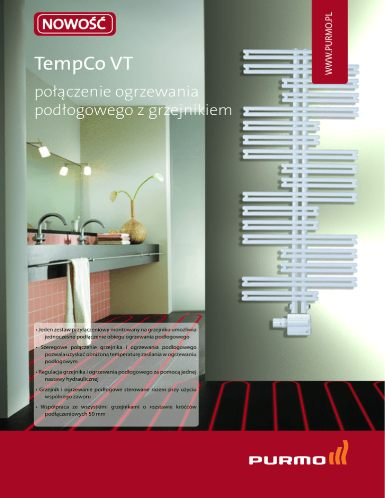 NOWOŚĆ WWW.PURMO.PL TempCo VT NOWOŚĆ TempCo VT Ciepła podłoga w łazience – luksus wcale nie musi być drogi Różnorodność grzejników Podczas planowania nowej łazienki lub gruntownego remontu starej, najważniejsze są oczekiwania związane z nowoczesnym i eleganckim wyglądem oraz komfortem, które możemy zrealizować dzięki najnowszym rozwiązaniom technicznym. Ładny i funkcjonalny grzejnik powinien szybko dostarczać ciepło oraz podgrzewać i suszyć ręczniki. Natomiast ogrzewanie podłogowe zapewnia ciepło dla stóp, co ma korzystny wpływ na zdrowie i samopoczucie. Dzięki zastosowaniu zestawu przyłączeniowego TempCo VT można bez problemu podłączyć jedną pętlę ogrzewania podłogowego do istniejącej instalacji grzejnikowej. Bardzo prosta obsługa zestawu polega na tym, że nastawiona przez użytkownika na jednej głowicy temperatura jest realizowana dla obu systemów razem, na jednym zaworze. Zestaw TempCo VT idealnie pasuje do wielu grzejników z oferty Purmo, które posiadają rozstaw przyłączy 50 mm. Przykładowe zastosowania prezentujemy na zdjęciach poniżej. połączenie ogrzewania podłogowego z grzejnikiem Zestaw TempCo VT – umożliwia właściwą regulację TempCo VT to zestaw zaworów, który został zaprojektowany do współpracy z instalacją stanowiącą połączenie dwóch systemów grzewczych: ogrzewania podłogowego i grzejników. Zaletą, która różni go od zwykłych zaworów ograniczających temperaturę powrotu jest nowatorska konstrukcja. W rozwiązaniu Purmo ogrzewanie podłogowe jest połączone hydraulicznie szeregowo z grzejnikiem, co powoduje, że temperatura zasilania ogrzewania podłogowego jest obniżana przez grzejnik. Dzięki szeregowemu podłączeniu zestaw TempCo VT zapewnia proste zrównoważenie hydrauliczne. Zarówno podłogówkę jak i grzejnik reguluje się kręcąc jednym centralnym zaworem. Zintegrowane zabezpieczenie przed zbyt wysoką temperaturą, wyłącza automatycznie obieg ogrzewania podłogowego w razie przekroczenia temperatury 55oC, bez konieczności odcięcia grzejnika. Jest to możliwe dzięki specjalnemu obejściu w konstrukcji zaworu (tzw. bypass), co odróżnia TempCo VT od popularnych zaworów RTL. • Jeden zestaw przyłączeniowy montowany na grzejniku umożliwia jednoczesne podłączenie obiegu ogrzewania podłogowego Kos V Delta Twin M Kea Ratea Sardinia Ventil Compact ZVLG PRLG Bad-HK Bad-HK • Szeregowe połączenie grzejnika i ogrzewania podłogowego pozwala uzyskać obniżoną temperaturę zasilania w ogrzewaniu podłogowym Z– zasilanie VL = Vorlauf P – powrót • Regulacja grzejnika i ogrzewania podłogowego = Rücklaufza pomocą jednej GRL - grzejnik < 55°C FBH = Fußbodenkreis OP – obieg ogrzewania podłogowego nastawy hydraulicznej Kocioł kotła Kessel– obieg = Kesselkreis STW temperatury STW– =ogranicznik Sicherheits- Zawór term. Th.-Ventil > 55°C • Grzejnik i ogrzewanie podłogowe sterowane razem przy użyciu temperaturwächter wspólnego zaworu STW STW • Współpraca ze wszystkimi grzejnikami o rozstawie króćców Schemat połączenia grzejników i ogrzewania podłogowego w jednej instalacji podłączeniowych 50 mm z użyciem zestawu przyłączeniowego TempCo VT. Po lewej stronie - grzejnik, na którym bezpośrednio montuje się zestaw przyłączeniowy, po prawej - obieg ogrzewania podłogowego. Rettig Heating Sp. z o.o. 02-781 Warszawa, ul. Rotmistrza Pileckiego 91 tel.: 22 643 25 20, fax: 22 643 99 95 e-mail: [email protected] STW ZVL Kessel kocioł RL P OP FBH Szkic podłączenia VL Z OP FBH P RL Kessel kocioł NOWOŚĆ TempCo VT Ciepła podłoga w łazience – luksus wcale nie musi być drogi Różnorodność grzejników Podczas planowania nowej łazienki lub gruntownego remontu starej, najważniejsze są oczekiwania związane z nowoczesnym i eleganckim wyglądem oraz komfortem, które możemy zrealizować dzięki najnowszym rozwiązaniom technicznym. Ładny i funkcjonalny grzejnik powinien szybko dostarczać ciepło oraz podgrzewać i suszyć ręczniki. Natomiast ogrzewanie podłogowe zapewnia ciepło dla stóp, co ma korzystny wpływ na zdrowie i samopoczucie. Dzięki zastosowaniu zestawu przyłączeniowego TempCo VT można bez problemu podłączyć jedną pętlę ogrzewania podłogowego do istniejącej instalacji grzejnikowej. Bardzo prosta obsługa zestawu polega na tym, że nastawiona przez użytkownika na jednej głowicy temperatura jest realizowana dla obu systemów razem, na jednym zaworze. Zestaw TempCo VT idealnie pasuje do wielu grzejników z oferty Purmo, które posiadają rozstaw przyłączy 50 mm. Przykładowe zastosowania prezentujemy na zdjęciach poniżej. Zestaw TempCo VT – umożliwia właściwą regulację TempCo VT to zestaw zaworów, który został zaprojektowany do współpracy z instalacją stanowiącą połączenie dwóch systemów grzewczych: ogrzewania podłogowego i grzejników. Zaletą, która różni go od zwykłych zaworów ograniczających temperaturę powrotu jest nowatorska konstrukcja. W rozwiązaniu Purmo ogrzewanie podłogowe jest połączone hydraulicznie szeregowo z grzejnikiem, co powoduje, że temperatura zasilania ogrzewania podłogowego jest obniżana przez grzejnik. Dzięki szeregowemu podłączeniu zestaw TempCo VT zapewnia proste zrównoważenie hydrauliczne. Zarówno podłogówkę jak i grzejnik reguluje się kręcąc jednym centralnym zaworem. Zintegrowane zabezpieczenie przed zbyt wysoką temperaturą, wyłącza automatycznie obieg ogrzewania podłogowego w razie przekroczenia temperatury 55oC, bez konieczności odcięcia grzejnika. Jest to możliwe dzięki specjalnemu obejściu w konstrukcji zaworu (tzw. bypass), co odróżnia TempCo VT od popularnych zaworów RTL. Kos V Delta Twin M Kea Ratea Sardinia Ventil Compact ZVLG PRLG Bad-HK Bad-HK < 55°C Zawór term. Th.-Ventil > 55°C Z– zasilanie = Vorlauf PVL – powrót = Rücklauf GRL - grzejnik FBH = Fußbodenkreis OP – obieg ogrzewania podłogowego 