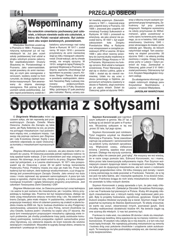 [6] Wspominamy Na osieckim cmentarzu pochowany jest człowiek, o którym niewiele osób wie cokolwiek, a który dla Polski narażał zdrowie. Był żołnierzem obu wojen światowych, powstańcem. Władysław Skorliński urodził się w Poznaniu w 1898 r. Postawę patriotyczną wykazywał już od najmłodszych lat. Już jako uczeń szkoły podstawowej brał udział w strajku szkolnym przeciw zaborcy. Był współzałożycielem Drużyny Skautowej im. Poniatowskiego w Poznaniu. Jako osiemnastolatek. został powołany do armii niemieckiej, po czym jako szeregowiec z cenzusem, wysłany został na front rumuński, do obsługi ciężkich karabinów maszynowych. Tam awansowany do stopnia starszego szeregowca. Rok później był już uczniem szkoły podoficerskiej. Już jako kapral przeniesiony został do I batalionu szturmowego nad rzekę Seret w Rumunii. W 1917 r. został ranny. W lutym 1918 r. ponownie przydzielony do armii niemieckiej skąd po kilku miesiącach zdezerterował. Chciał walczyć, ale ku chwale swojej, nie wrogiej ojczyzny. W 1919 r. wstąpił do tajnej Polskiej Organizacji Wojskowej w Poznaniu. W stopniu aspiranta oficerskiego był łącznikiem na powiaty: Leszno, Kościan, Śmigiel i Rawicz. Brał udział w powstaniu wielkopolskim, dekretem Naczelnej Rady Ludowej mianowany podporucznikiem. Przydzielony do 3 Pułku Strzelców Wlkp. (późniejszy 57 pułk piechoty) jako instruktor. Ranny, uznany zos- PRZEGLĄD OSIECKI tał inwalidą wojennym. Zdemobilizowany w 1921 r., rozpoczął pracę jako urzędnik leśny w Poznaniu. Od 1926 r. pracował jako urzędnik administracji Fundacji Sułkowskich w Rydzynie. W 1932 r. przeszedł na emeryturę, ale jako emeryt nie pozostał bierny. W 1937 r. był współzałożycielem koła Związku Powstańców Wlkp. w Rydzynie oraz wiceprezesem w zarządzie powiatowym ZPW w Lesznie. 20 lipca 1939 r. jako oficer rezerwy powołany do czynnej służby wojskowej w Dowództwie Okręgu Korpusu nr VII w Poznaniu. Wyznaczono mu funkcję cenzora. Brał udział w kampanii wrześniowej. Przez Warszawę dostał się w okolice Lublina, gdzie w 1939 r. dostał się do niewoli niemieckiej. Udało mu się uciec z obozu jenieckiego w Dęblinie, po ponownym schwytaniu osadzony w obozie w Radomiu, skąd zwolniono go po pięciu dniach. Dotarł do Osiecznej, gdzie od stycznia 1940 r. wraz z kilkoma innymi osobami zorganizował grupę konspiracyjną. Zatrudniony był przy pracach drogowych. Następnie wywieziony na roboty przymusowe do Wilhelmshaven, gdzie uczestniczył w ruchu oporu na terenie portu wojennego, za co w kwietniu 1945 został aresztowany. Uwolniony 1945 r. przez wkraczające do miasta i portu oddziały gen. Maczka, do których natychmiast wstąpił. Tam awansowany na stopień porucznika. 20 stycznia 1946 r. na własną prośbę zwolniony z wojska. Drogą morską przez porty w Lubece i Gdyni powrócił do kraju. Zamieszkał w Osiecznej, gdzie zmarł 3 VI 1949 i został pochowany. Odznaczony był m.in. Krzyżem Niepodległości i krzyżami zasługi. Za udostępnienie informacji i pamiątek rodzinnych dziękuję panu Krzysztofowi Skorlińskiemu z Leszna – wnukowi Władysława. Spotkania z sołtysami O Zbigniewie Włodarczaku mówi się czasem sołtys, ale tak naprawdę jest przewodniczącym Zarządu Osiedla Miasta Osieczna. Zadania dla Zarządu są takie same, jak Rady Sołeckiej na wsi, po prostu ma pomagać mieszkańcom i być pośrednikiem między nimi, a władzami miasta. I tak swoją rolę pojmuje zarówno pan Zbigniew, jak i cały 8-osobowy Zarząd. Każdy z jego członków odpowiada za część Osiecznej i za kontakty z mieszkańcami wyznaczonych ulic. Zbigniew Włodarczak pochodzi z Jeziorek, ale jako dziecko trafił z rodzicami do Leszna. W Osiecznej pozostała jednak najbliższa rodzina i to tutaj spędzał każde wakacje. Z tym środowiskiem jest więc związany od zawsze. Nic dziwnego, że po latach wrócił tu do pracy. Zbigniew Włodarczak był policjantem, a w Lesznie dzielnicowym. W 1971 roku przeprowadził się do Osiecznej i przez 20 lat pełnił funkcję komendanta Posterunku Policji. Problemy miasta zna więc jak mało kto. Przez kilka kadencji był też radnym, dwie kadencje wiceburmistrzem, a już drugą kadencję jest przewodniczącym Zarządu Osiedla. Jako emeryt ma dużo czasu i może zajmować się sprawami samorządowymi. A poza tym lubi pracę w ogrodzie, chętnie łowi ryby, chodzi na grzyby, a w domu pasjami rozwiązuje krzyżówki i ogląda telewizyjne programy przyrodnicze. Jest członkiem Towarzystwa Ziemi Osieckiej i OSP. Zbigniew Włodarczak mówi, że Osieczna powinna być coraz ładniejsza i że ważne to jest zarówno dla mieszkańców, jak i turystów, którzy przyjeżdżają tu każdego lata. Powinna też być bezpieczniejsza, dlatego tak wiele uwag mieszkańców dotyczy remontów dróg i ulic. Na ostatnim zebraniu Zarządu, jakie miało miejsce 14 października, członkowie zgłosili propozycje inwestycji, które ich zdaniem powinny się znaleźć w planie budżetu miasta na 2009 rok. Są to: budowa chodników na ulicy Podgórnej i Jeziorkowskiej, ustawienie lamp na ulicy Polnej, remont chodników na ulicy Osiedle, budowa jezdni i chodnika na części ulicy 27 stycznia. Ale poza tymi inwestycyjnymi propozycjami mieszkańcy zgłaszają wiele innych problemów, jak choćby przedłużenie trasy jazdy autobusów komunikacji podmiejskiej, kontrola przejazdów ciężkich samochodów przez ulicę Ogrodową, czy ułatwienie dojazdu do bram kościoła dla wózków dziecięcych i inwalidzkich. Wszystkie te sygnały Zarząd zbiera, omawia na zebraniach i przekazuje do Urzędu. JAROSŁAW WAWRZYNIAK Szymon Koronowski jest najmłodszym sołtysem w gminie. Ma 27 lat, a funkcję tę od dwóch lat pełni w Frankowie. Wcześniej sołtysem w tej wsi ,przez 22 lata, był jego ojciec. Szymon Koronowski jest rolnikiem. Tytuł magistra uzyskał na Akademii Rolniczej w Poznaniu. Teraz zawodowo zajmuje się pokazami i serwisowaniem na polski