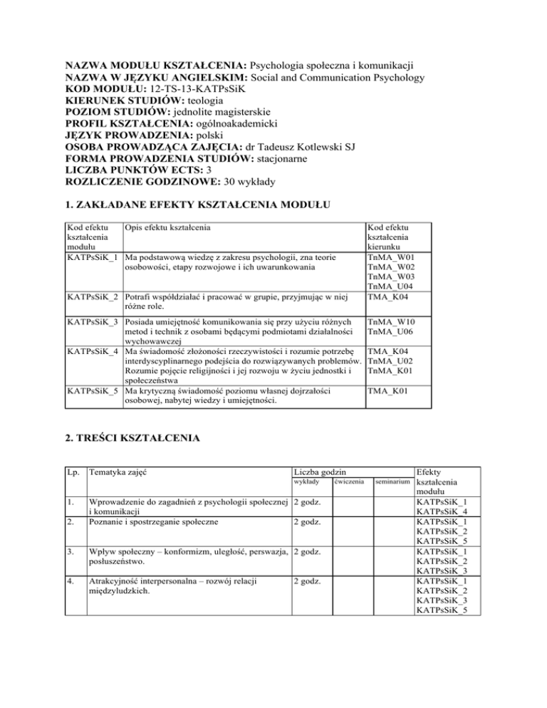NAZWA MODUŁU KSZTAŁCENIA: Psychologia społeczna i komunikacji NAZWA W JĘZYKU ANGIELSKIM: Social and Communication Psychology KOD MODUŁU: 12-TS-13-KATPsSiK KIERUNEK STUDIÓW: teologia POZIOM STUDIÓW: jednolite magisterskie PROFIL KSZTAŁCENIA: ogólnoakademicki JĘZYK PROWADZENIA: polski OSOBA PROWADZĄCA ZAJĘCIA: dr Tadeusz Kotlewski SJ FORMA PROWADZENIA STUDIÓW: stacjonarne LICZBA PUNKTÓW ECTS: 3 ROZLICZENIE GODZINOWE: 30 wykłady 1. ZAKŁADANE EFEKTY KSZTAŁCENIA MODUŁU Kod efektu Opis efektu kształcenia kształcenia modułu KATPsSiK_1 Ma podstawową wiedzę z zakresu psychologii, zna teorie osobowości, etapy rozwojowe i ich uwarunkowania KATPsSiK_2 Potrafi współdziałać i pracować w grupie, przyjmując w niej różne role. KATPsSiK_3 Posiada umiejętność komunikowania się przy użyciu różnych metod i technik z osobami będącymi podmiotami działalności wychowawczej KATPsSiK_4 Ma świadomość złożoności rzeczywistości i rozumie potrzebę interdyscyplinarnego podejścia do rozwiązywanych problemów. Rozumie pojęcie religijności i jej rozwoju w życiu jednostki i społeczeństwa KATPsSiK_5 Ma krytyczną świadomość poziomu własnej dojrzałości osobowej, nabytej wiedzy i umiejętności. Kod efektu kształcenia kierunku TnMA_W01 TnMA_W02 TnMA_W03 TnMA_U04 TMA_K04 TnMA_W10 TnMA_U06 TMA_K04 TnMA_U02 TnMA_K01 TMA_K01 2. TREŚCI KSZTAŁCENIA Lp. Tematyka zajęć Liczba godzin wykłady 1. 2. Wprowadzenie do zagadnień z psychologii społecznej 2 godz. i komunikacji Poznanie i spostrzeganie społeczne 2 godz. 3. Wpływ społeczny – konformizm, uległość, perswazja, 2 godz. posłuszeństwo. 4. Atrakcyjność interpersonalna – rozwój relacji międzyludzkich. 2 godz. ćwiczenia seminarium Efekty kształcenia modułu KATPsSiK_1 KATPsSiK_4 KATPsSiK_1 KATPsSiK_2 KATPsSiK_5 KATPsSiK_1 KATPsSiK_2 KATPsSiK_3 KATPsSiK_1 KATPsSiK_2 KATPsSiK_3 KATPsSiK_5 5. Teorie rozwoju miłości. 2 godz. 6. Zachowania prospołeczne. 2 godz. 7. Agresja, przemoc, władza. 2 godz. 8. Uprzedzenia – przyczyny i środki zaradcze. 2 godz. 9. Komunikacja interpersonalna – podstawy, funkcje i modele. Komunikacja werbalna i niewerbalna – aspekty emocjonalne i poznawcze w komunikacji. 2 godz. 11. Bariery komunikacyjne, spójność i niespójność komunikatów. 2 godz. 12. Słuchanie i otwartość – podstawy dobrej relacji. 2 godz. 13. Rozwój zdolności komunikacyjnych – inteligencja emocjonalna i społeczna. 2 godz. 14. Procesy grupowe – umiejętności prowadzenia i kierowania grupą 2 godz. 15. Konflikt i jego wpływ na relacje międzyludzkie. Umiejętność rozwiązywania konfliktów międzyludzkich. 2 godz. 10. 2 godz. KATPsSiK_1 KATPsSiK_4 KATPsSiK_5 KATPsSiK_1 KATPsSiK_4 KATPsSiK_5 KATPsSiK_2 KATPsSiK_4 KATPsSiK_5 KATPsSiK_1 KATPsSiK_2 KATPsSiK_5 KATPsSiK_2 KATPsSiK_3 KATPsSiK_2 KATPsSiK_3 KATPsSiK_5 KATPsSiK_2 KATPsSiK_3 KATPsSiK_5 KATPsSiK_2 KATPsSiK_3 KATPsSiK_4 KATPsSiK_2 KATPsSiK_3 KATPsSiK_4 KATPsSiK_5 KATPsSiK_2 KATPsSiK_4 KATPsSiK_5 KATPsSiK_2 KATPsSiK_4 KATPsSiK_5 3. FORMY PROWADZENIA ZAJĘĆ: Wykład problemowy Prezentacja wybranego tematu Praca z tekstem Dyskusja 4. SPOSOBY WERYFIKACJI EFEKTÓW KSZTAŁCENIA MODUŁU: przy każdej formie zaliczenia podać kod efektu Przedstawienie wybranego tematu i praca pisemna: KATPsSiK_1, KATPsSiK_4, KATPsSiK_5 Egzamin ustny: KATPsSiK_1, KATPsSiK_2, KATPsSiK_3, KATPsSiK_4, KATPsSiK_5 5. NAKŁAD PRACY STUDENTA Opis Udział w zajęciach dydaktycznych, praca własną z lekturą obowiązkową i dodatkową, opracowanie treści wykładu i przygotowanie do egzaminu Przygotowanie wystąpienia ustnego/prezentacji wybranego tematu i praca pisemna Liczba godzin 60 Liczba ECTS 2 30 1 Nakład pracy studenta w godz.: 90 Liczba punktów ECTS: 3 LITERATURA ARONSON E., Człowiek istota społeczna. Wydawnictwo Naukowe PWN: Warszawa 2001; BRZEZIŃSKA A., Psychologia wychowania, [w:] J. Strelau (red.), Psychologia. Podręcznik akademicki. T. III: Jednostka w społeczeństwie i elementy psychologii stosowanej, Gdańskie Wydawnictwo Psychologiczne: Gdańsk 2000, 227-‐257; BUSS D.M., Zazdrość – niebezpieczna namiętność. Dlaczego zazdrość jest nierozłączna z miłością i seksem. Gdańskie Wydawnictwo Psychologiczne: Gdańsk 2002: CARNES P., Od nałogu do miłości. Jak wyzwolić się z uzależnienia od seksu i odnaleźć prawdziwe uczucie. Media Rodzina Poznań 2001; CIALDINI R., KENRICK D.T., NEUBERG S. L., Psychologia społeczna. Gdańskie Wydawnictwo Psychologiczne: Gdańsk 2002; CIALDINI R., Wywieranie wpływu na ludzi. Teoria i praktyka. Gdańskie Wydawnictwo Psychologiczne: Gdańsk 1996; CELMER Z., Oblicza zazdrości. O związkach, pragnieniach i niespełnieniach. KDC Warszawa 2006; DAVIS M.H., Empatia. O umiejętności odczuwania. Gdańskie Wydawnictwo Psychologiczne: Gdańsk 2001; KOTLEWSKI T., Dynamika grupy i rola lidera, Wydawnictwo M: Kraków 1997; KOTLEWSKI T., Uzdrawianie relacji we wspólnocie. Od grupy do wspólnoty. Ośrodek Odnowy w Duchu Świętym, Łódź 2009; LEARY M., KOWALSKI R. M., Lęk społeczny, Gdańskie Wydawnictwo Psychologiczne: Gdańsk 2002; MACRAE C.N., STANGOR Ch., HEWSTONE M., Stereotypy i uprzedzenia. Najnowsze ujęcie. Gdańskie Wydawnictwo Psychologiczne: Gdańsk 1999; MILLER R.S., Niepewność i zakłopotanie. O pokonywaniu niechcianych uczuć. Gdańskie Wydawnictwo Psychologiczne: Gdańsk 2000; Mosty zamiast murów. O komunikowaniu się miedzy ludźmi. Praca zbiorowa pod redakcją J. Stewarta, Wydawnictwo Naukowe PWN: Warszawa 2002; SCHULZ von Thun F., Sztuka rozmawiania. W porozumieniu z sobą i innymi – komunikacja i kompetencje społeczne. Wydawnictwo WAM: Kraków 2006; SĘDEK G., Psychologia kształcenia, [w:] J. Strelau (red.), Psychologia. Podręcznik akademicki. T. III: Jednostka w społeczeństwie i elementy psychologii stosowanej, Gdańskie Wydawnictwo Psychologiczne: Gdańsk 2000, 258-‐280: SUJAK E., ABC psychologii komunikacji. Wydawnictwo WAM: Kraków 2006; ZIMBARDO P. G., Psycho