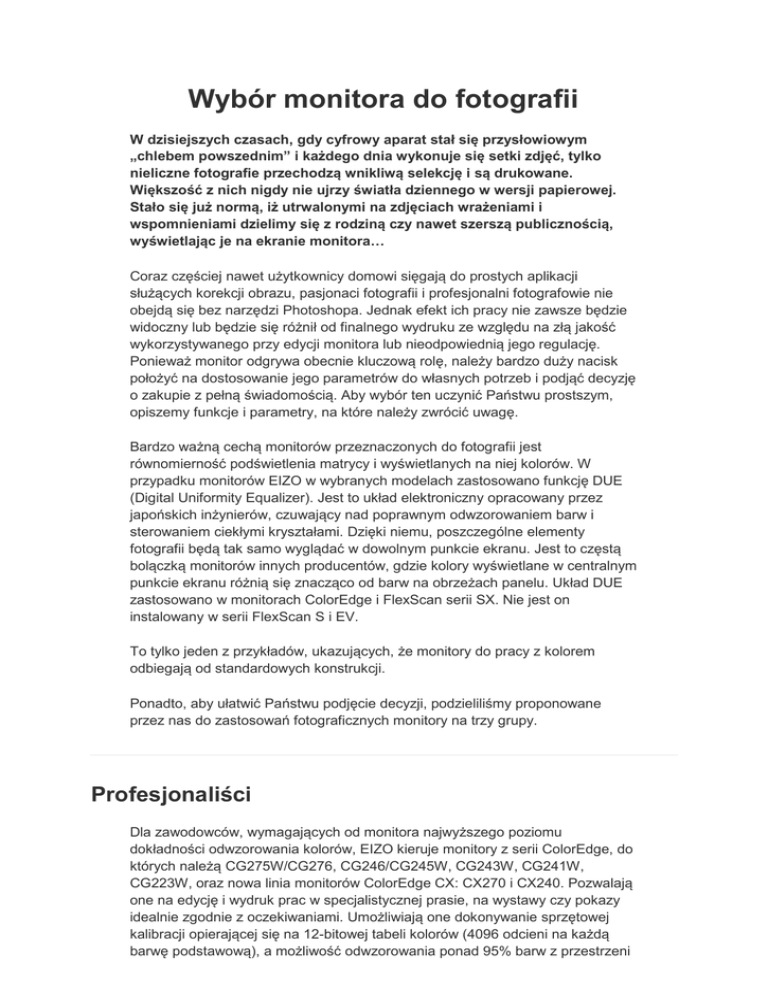 Wybór monitora do fotografii W dzisiejszych czasach, gdy cyfrowy aparat stał się przysłowiowym „chlebem powszednim” i każdego dnia wykonuje się setki zdjęć, tylko nieliczne fotografie przechodzą wnikliwą selekcję i są drukowane. Większość z nich nigdy nie ujrzy światła dziennego w wersji papierowej. Stało się już normą, iż utrwalonymi na zdjęciach wrażeniami i wspomnieniami dzielimy się z rodziną czy nawet szerszą publicznością, wyświetlając je na ekranie monitora… Coraz częściej nawet użytkownicy domowi sięgają do prostych aplikacji służących korekcji obrazu, pasjonaci fotografii i profesjonalni fotografowie nie obejdą się bez narzędzi Photoshopa. Jednak efekt ich pracy nie zawsze będzie widoczny lub będzie się różnił od finalnego wydruku ze względu na złą jakość wykorzystywanego przy edycji monitora lub nieodpowiednią jego regulację. Ponieważ monitor odgrywa obecnie kluczową rolę, należy bardzo duży nacisk położyć na dostosowanie jego parametrów do własnych potrzeb i podjąć decyzję o zakupie z pełną świadomością. Aby wybór ten uczynić Państwu prostszym, opiszemy funkcje i parametry, na które należy zwrócić uwagę. Bardzo ważną cechą monitorów przeznaczonych do fotografii jest równomierność podświetlenia matrycy i wyświetlanych na niej kolorów. W przypadku monitorów EIZO w wybranych modelach zastosowano funkcję DUE (Digital Uniformity Equalizer). Jest to układ elektroniczny opracowany przez japońskich inżynierów, czuwający nad poprawnym odwzorowaniem barw i sterowaniem ciekłymi kryształami. Dzięki niemu, poszczególne elementy fotografii będą tak samo wyglądać w dowolnym punkcie ekranu. Jest to częstą bolączką monitorów innych producentów, gdzie kolory wyświetlane w centralnym punkcie ekranu różnią się znacząco od barw na obrzeżach panelu. Układ DUE zastosowano w monitorach ColorEdge i FlexScan serii SX. Nie jest on instalowany w serii FlexScan S i EV. To tylko jeden z przykładów, ukazujących, że monitory do pracy z kolorem odbiegają od standardowych konstrukcji. Ponadto, aby ułatwić Państwu podjęcie decyzji, podzieliliśmy proponowane przez nas do zastosowań fotograficznych monitory na trzy grupy. Profesjonaliści Dla zawodowców, wymagających od monitora najwyższego poziomu dokładności odwzorowania kolorów, EIZO kieruje monitory z serii ColorEdge, do których należą CG275W/CG276, CG246/CG245W, CG243W, CG241W, CG223W, oraz nowa linia monitorów ColorEdge CX: CX270 i CX240. Pozwalają one na edycję i wydruk prac w specjalistycznej prasie, na wystawy czy pokazy idealnie zgodnie z oczekiwaniami. Umożliwiają one dokonywanie sprzętowej kalibracji opierającej się na 12-bitowej tabeli kolorów (4096 odcieni na każdą barwę podstawową), a możliwość odwzorowania ponad 95% barw z przestrzeni AdobeRGB sprawia, że poradzą sobie bez przekłamań z wyświetlaniem podczas edycji zdjęć pochodzących ze sprzętu fotograficznego z najwyższej półki. Porównanie kalibracji sprzętowej i programowej Elektronika sterująca panelami to najwyższej klasy, opracowane i opatentowane przez EIZO rozwiązania, umożliwiające uzyskanie bardzo wysokiej równomierności jasności i odcienia na całej powierzchni matrycy. Bez funkcji DUE: nierównomierne rozłożenie podświetlenia Z wykorzystaniem funkcji DUE: równomierne rozłożenie i koloru podświetlenia i koloru na całej powierzchni matrycy Równomierne rozprowadzenie koloru i podświetlenia jest tym trudniejsze, im większa jest matryca. Wynika to z konstrukcji monitora LCD – świetlówki umieszczone są na krawędziach matrycy, a w nielicznych konstrukcjach bezpośrednio za matrycą. Odpowiedni dobór warstw rozpraszających pozwala osiągnąć całkiem dobre rezultaty, jednak często są one niewystarczające do zastosowań profesjonalnych. Przetwarzanie informacji o kolorze z 16-bitową precyzją pozwala na prawidłowe wyświetlanie nawet najdrobniejszych detali, szczególnie w sprawiających tradycyjnym konstrukcjom duże trudności ciemnych partiach obrazu. Profesjonaliści o mniejszych wymaganiach Użytkownicy którzy nie wymagają tak idealnie wiernego odwzorowania barw będą usatysfakcjonowani kupując monitory z serii FlexScan SX, do której należą modele: 24” SX2462W i 22”, ale z rozdzielczością monitora 24” 1920 x 1200, SX2262W. W obu monitorach zastosowano równie zaawansowaną elektronikę jak w monitorach graficznych CG, ale bez możliwości sprzętowej ich kalibracji. Pozostaje oczywiście kalibracja programowa, niemniej jest ona obarczona większymi błędami i bardziej pracochłonna. W monitorach serii SX producent nie gwarantuje zachowania równomierności podświetlenia deltaE<3, tak jak to ma miejsce w monitorach serii CG. W kręgu zainteresowań tej grupy odbiorców powinien znaleźć się również nowy monitor CS230 z rodziny monitów ColorEdge. Wyposażony we wszystkie technologiczne nowinki przypisane grupie ColorEdge, ale z odwzorowaniem przestrzeni sRGB. Zaawansowani amatorzy Trzecia grupa monitorów EIZO przeznaczona jest dla segmentu zaawansowanych amatorów. Proponowane dla tej półki modele również udostępniają możliwości sprzętowej kalibracji. Wykorzystane podczas ich produkcji komponenty, jak również stosowane rozwiązania technologiczne sprawiają, że monitory te udostępniają bardzo szerokie możliwości regulacji parametrów wyświetlania i charakteryzują się wysoką jakością odwzorowania kolorów. Użyte panele LCD odwzorowują ponad 90% przestrzeni AdobeRGB (Seria FlexScan „S”), tak jak ich odpowiedniki z „wyższej” półki, serii SX i CG, oraz przestrzeń sRGB (seria Foris). Jednak, monitory FlexScan serii S i Foris nie mają wbudowanych układów DUE tak jak to ma miejsce w seriach ColorEdge lub FlexScan SX. Może to skutkować pewną nierównomiernością kolorów i podświetlenia, ale są to wartości zdecydowanie poniżej 