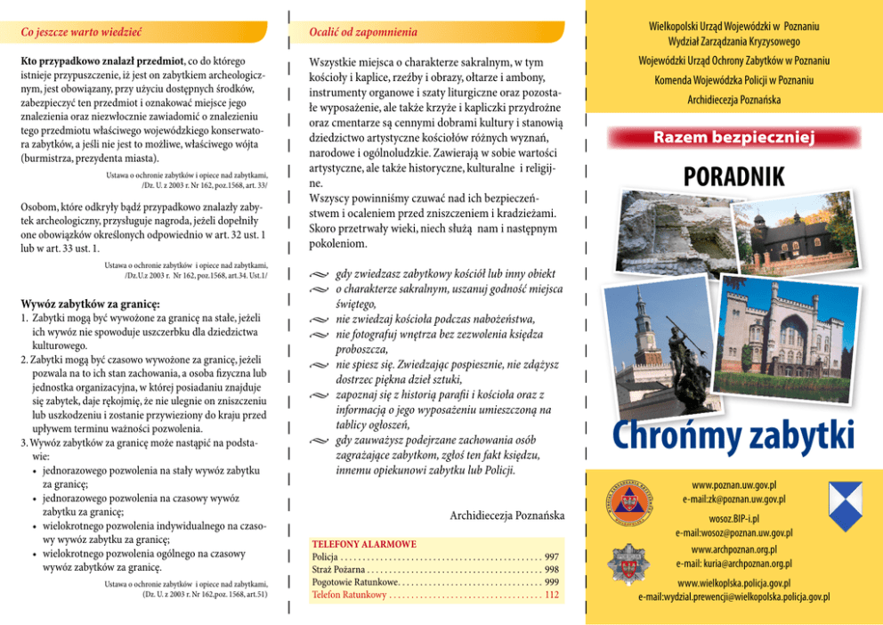 Wielkopolski Urząd Wojewódzki w Poznaniu Wydział Zarządzania Kryzysowego Co jeszcze warto wiedzieć Ocalić od zapomnienia Kto przypadkowo znalazł przedmiot, co do którego istnieje przypuszczenie, iż jest on zabytkiem archeologicznym, jest obowiązany, przy użyciu dostępnych środków, zabezpieczyć ten przedmiot i oznakować miejsce jego znalezienia oraz niezwłocznie zawiadomić o znalezieniu tego przedmiotu właściwego wojewódzkiego konserwatora zabytków, a jeśli nie jest to możliwe, właściwego wójta (burmistrza, prezydenta miasta). Wszystkie miejsca o charakterze sakralnym, w tym kościoły i kaplice, rzeźby i obrazy, ołtarze i ambony, instrumenty organowe i szaty liturgiczne oraz pozostałe wyposażenie, ale także krzyże i kapliczki przydrożne oraz cmentarze są cennymi dobrami kultury i stanowią dziedzictwo artystyczne kościołów różnych wyznań, narodowe i ogólnoludzkie. Zawierają w sobie wartości artystyczne, ale także historyczne, kulturalne i religijne. Wszyscy powinniśmy czuwać nad ich bezpieczeństwem i ocaleniem przed zniszczeniem i kradzieżami. Skoro przetrwały wieki, niech służą nam i następnym pokoleniom. Ustawa o ochronie zabytków i opiece nad zabytkami, /Dz. U. z 2003 r. Nr 162, poz.1568, art. 33/ Osobom, które odkryły bądź przypadkowo znalazły zabytek archeologiczny, przysługuje nagroda, jeżeli dopełniły one obowiązków określonych odpowiednio w art. 32 ust. 1 lub w art. 33 ust. 1. Ustawa o ochronie zabytków i opiece nad zabytkami, /Dz.U.z 2003 r. Nr 162, poz.1568, art.34. Ust.1/ Wywóz zabytków za granicę: 1. Zabytki mogą być wywożone za granicę na stałe, jeżeli ich wywóz nie spowoduje uszczerbku dla dziedzictwa kulturowego. 2. Zabytki mogą być czasowo wywożone za granicę, jeżeli pozwala na to ich stan zachowania, a osoba fizyczna lub jednostka organizacyjna, w której posiadaniu znajduje się zabytek, daje rękojmię, że nie ulegnie on zniszczeniu lub uszkodzeniu i zostanie przywieziony do kraju przed upływem terminu ważności pozwolenia. 3. Wywóz zabytków za granicę może nastąpić na podstawie: • jednorazowego pozwolenia na stały wywóz zabytku za granicę; • jednorazowego pozwolenia na czasowy wywóz zabytku za granicę; • wielokrotnego pozwolenia indywidualnego na czasowy wywóz zabytku za granicę; • wielokrotnego pozwolenia ogólnego na czasowy wywóz zabytków za granicę. Ustawa o ochronie zabytków i opiece nad zabytkami, (Dz. U. z 2003 r. Nr 162,poz. 1568, art.51) ўў gdy zwiedzasz zabytkowy kościół lub inny obiekt ўў o charakterze sakralnym, uszanuj godność miejsca świętego, ўў nie zwiedzaj kościoła podczas nabożeństwa, ўў nie fotografuj wnętrza bez zezwolenia księdza proboszcza, ўў nie spiesz się. Zwiedzając pospiesznie, nie zdążysz dostrzec piękna dzieł sztuki, ўў zapoznaj się z historią parafii i kościoła oraz z informacją o jego wyposażeniu umieszczoną na tablicy ogłoszeń, ўў gdy zauważysz podejrzane zachowania osób zagrażające zabytkom, zgłoś ten fakt księdzu, innemu opiekunowi zabytku lub Policji. Wojewódzki Urząd Ochrony Zabytków w Poznaniu Komenda Wojewódzka Policji w Poznaniu Archidiecezja Poznańska Razem bezpieczniej PORADNIK Chrońmy zabytki www.poznan.uw.gov.pl e-mail:[email protected] Archidiecezja Poznańska TELEFONY ALARMOWE Policja . . . . . . . . . . . . . . . . . . . . . . . . . . . . . . . . . . . . . . . . . . . . . . . Straż Pożarna . . . . . . . . . . . . . . . . . . . . . . . . . . . . . . . . . . . . . . . . . Pogotowie Ratunkowe . . . . . . . . . . . . . . . . . . . . . . . . . . . . . . . . . Telefon Ratunkowy . . . . . . . . . . . . . . . . . . . . . . . . . . . . . . . . . . . . 997 998 999 112 wosoz.BIP-i.pl e-mail:[email protected] www.archpoznan.org.pl e-mail: [email protected] www.wielkoplska.policja.gov.pl e-mail:[email protected] “(...) zniszczenie dobra kulturalnego należącego do jakiegokolwiek człowieka jest równoznaczne z uszczerbkiem dokonanym w dziedzictwie kulturalnym całej ludzkości, bowiem każdy człowiek wnosi wkład do kultury naszego świata” Konwencja Haska Co to są dobra kultury? W rozumieniu Konwencji Haskiej – za dobra kultury uważa się dobra ruchome lub nieruchome, które posiadają wielką wagę dla dziedzictwa kulturalnego narodu, na przykład zabytki architektury, sztuki lub historii, zarówno religijne, jak świeckie; stanowiska archeologiczne; zespoły budowlane posiadające jako takie znaczenie historyczne lub artystyczne; dzieła sztuki, rękopisy, książki i inne przedmioty o znaczeniu artystycznym, historycznym lub archeologicznym, jak również zbiory naukowe i poważne zbiory książek, archiwaliów lub reprodukcji wyżej określonych dóbr. Przepisy prawne Aktualne przepisy w tym zakresie można znaleźć na stronie internetowej: www.poznan.uw.gov.pl/wzk Znak rozpoznawczy dóbr kultury podlegających ochronie WZÓR ZNAKU ROZPOZNAWCZEGO „KONWENCJI HASKIEJ”, W UKŁADZIE POJEDYNCZYM SŁUŻY DO OZNAKOWANIA DÓBR KULTURY KORZYSTAJĄCYCH Z OCHRONY OGÓLNEJ. Ochronie i opiece podlegają, bez względu na stan zachowania: 1. Zabytki nieruchome, będące w szczególności: krajobrazami kulturowymi, układami urbanistycznymi, dziełami architektury i budownictwa, obiektami techniki, cmentarzami, miejscami upamiętniającymi wydarzenia historyczne, parkami itp. 2. Zabytki ruchome będące w szczególności: dziełami sztuk plastycznych, rzemiosła artystycznego i sztuki użytkowej, wytworami techniki, numizmatami oraz pamiątkami historycznymi, materiałami bibliotecznymi, wytworami sztuki ludowej itp. 3. Zabytki archeologiczne będące w szczególności: a) pozostałościami terenowymi pradziejowego i historycznego osadnictwa, b)cmentarzyskami, c) kurhanami, d)reliktami działalności gospodarczej, religijnej i artystycznej. Ustawa o ochronie zabytków i opiece nad zabytkami, /Dz.U.Nr 162,poz.1568,art.6/ Rodzaje zagrożeń dóbr kultury: • kradzież
