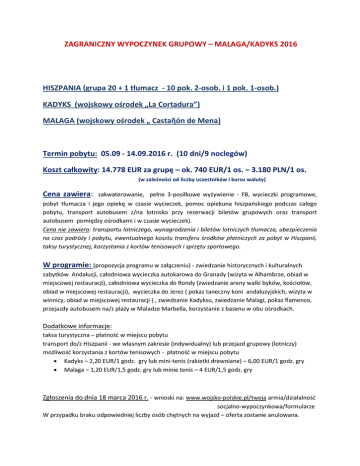 ZAGRANICZNY WYPOCZYNEK GRUPOWY – MALAGA/KADYKS 2016 HISZPANIA (grupa 20 + 1 tłumacz - 10 pok. 2-osob. i 1 pok. 1-osob.) KADYKS (wojskowy ośrodek „La Cortadura”) MALAGA (wojskowy ośrodek „ Castaῆón de Mena) Termin pobytu: 05.09 - 14.09.2016 r. (10 dni/9 noclegów) Koszt całkowity: 14.778 EUR za grupę – ok. 740 EUR/1 os. – 3.180 PLN/1 os. (w zależności od liczby uczestników i kursu waluty) Cena zawiera: zakwaterowanie, pełne 3-posiłkowe wyżywienie - FB, wycieczki programowe, pobyt tłumacza i jego opiekę w czasie wycieczek, pomoc opiekuna hiszpańskiego podczas całego pobytu, transport autobusem z/na lotnisko przy rezerwacji biletów grupowych oraz transport autobusem pomiędzy ośrodkami i w czasie wycieczek). Cena nie zawiera: transportu lotniczego, wynagrodzenia i biletów lotniczych tłumacza, ubezpieczenia na czas podróży i pobytu, ewentualnego kosztu transferu środków płatniczych za pobyt w Hiszpanii, taksy turystycznej, korzystania z kortów tenisowych i sprzętu sportowego. W programie: (propozycja programu w załączeniu) - zwiedzanie historycznych i kulturalnych zabytków Andaluzji, całodniowa wycieczka autokarowa do Granady (wizyta w Alhambrze, obiad w miejscowej restauracji), całodniowa wycieczka do Rondy (zwiedzanie areny walki byków, kościołów, obiad w miejscowej restauracji), wycieczka do Jerez ( pokaz taneczny koni andaluzyjskich, wizyta w winnicy, obiad w miejscowej restauracji ) , zwiedzanie Kadyksu, zwiedzanie Malagi, pokaz flamenco, przejazdy autobusem na/z plaży w Maladze Marbella, korzystanie z basenu w obu ośrodkach. Dodatkowe informacje: taksa turystyczna – płatność w miejscu pobytu transport do/z Hiszpanii - we własnym zakresie (indywidualny) lub przejazd grupowy (lotniczy) możliwość korzystania z kortów tenisowych - płatność w miejscu pobytu Kadyks – 2,20 EUR/1 godz. gry lub mini-tenis (rakietki drewniane) – 6,00 EUR/1 godz. gry Malaga – 1,20 EUR/1,5 godz. gry lub minie tenis – 4 EUR/1,5 godz. gry Zgłoszenia do dnia 18 marca 2016 r. - wnioski na: www.wojsko-polskie.pl/twoja armia/działalność socjalno-wypoczynkowa/formularze W przypadku braku odpowiedniej liczby osób chętnych na wyjazd – oferta zostanie anulowana. Dzień 1 PROPOZYCJA PROGRAMU (Kadyks i Malaga) Przyjazd do Malagi lub Kadyksu (grupowy lub indywidualny) Transport autobusem armii hiszpańskiej z Malagi do Kadyksu (dla osób rezerwujących bilety systemem grupowym) 18:00 Zakwaterowanie w ośrodku „La Cortadura” 19:00 Powitanie gości przez Komendanta ośrodka 19:30 Kolacja w ośrodku 20:30 Czas wolny do dyspozycji gości Dzień 2 08:30 Śniadanie w ośrodku 09:30 Wycieczka do Kadyksu (zwiedzanie z przewodnikiem katedry, muzeów, portu,) 14:10 Obiad w ośrodku 15:00 Czas wolny 21:00 Kolacja w ośrodku Dzień 3 09:00 Śniadanie w ośrodku 10:00 Czas wolny – plażowanie, korty tenisowe 13:30 Obiad w ośrodku 15:30 Czas wolny 21:00 Kolacja w ośrodku Dzień 4 08:30 Śniadanie 09:30 Wycieczka do Jerez de La Frontera (udział w spektaklu „Jak tańczą konie andaluzyjskie”, w przerwie - obiad w lokalnej restauracji, wizyta z przewodnikiem w wytwórni wina Cherry) 18:30 Powrót do ośrodka 21:00 Kolacja w ośrodku Dzień 5 08:30 Śniadanie w ośrodku 09:30 Wymeldowanie, Wyjazd do Malagi 12:30 Przyjazd do Malagi i zakwaterowanie w ośrodku „Castaῆón de Mena” 14:00 Obiad w ośrodku 19:00 Powitanie przez dyrektora ośrodka 20:30 Kolacja w ośrodku Dzień 6 08:00 Śniadanie w ośrodku 09:00 Wycieczka do Malagi (zwiedzanie z przewodnikiem Katedry, zamku Gibralfaro i fortyfikacji pałacowych –Alcazaba) 14:00 Obiad w ośrodku 15:30 Czas wolny 19:00 Przejazd transportem publicznym na rejs statkiem 20:30 Kolacja w ośrodku Dzień 7 08:00 Śniadanie w ośrodku 10:00 Przejazd autobusem na plażę w Maladze Marbelli 13:30 Obiad w ośrodku 15:30 Czas wolny 20:30 Kolacja w ośrodku Dzień 8 07:30 Śniadanie w ośrodku 08:00 Wycieczka do Granady (zwiedzanie z przewodnikiem Alhambry, obiad w lokalnej restauracji) 20:30 Kolacja w ośrodku w Maladze Dzień 9 07:30 Śniadanie w ośrodku 08:00 Wycieczka do Rondy (zwiedzanie z przewodnikiem areny walki byków i miejscowego muzeum, zwiedzanie kościoła Św. Marii i Św. Jana Bosco, w przerwie obiad w lokalnej restauracji) 21:00 Pożegnalna kolacja w ośrodku i pokaz flamenco Dzień 10 08:30 Śniadanie w ośrodku 09:30 Czas wolny Wyjazd na lotnisko w Maladze i wylot do Polski.