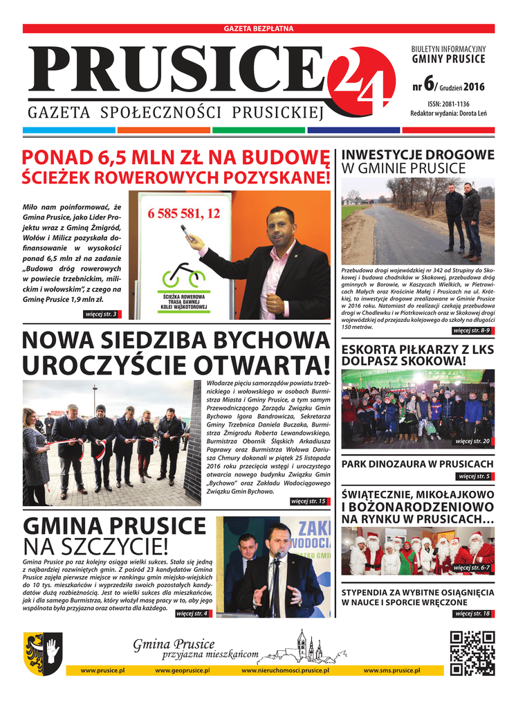 GAZETA BEZPŁATNA Biuletyn Informacyjny GMINY PRUSICE nr 6/ Grudzień 2016 ISSN: 2081-1136 Redaktor wydania: Dorota Leń Ponad 6,5 mln zł na budowę ścieżek rowerowych pozyskane! Miło nam poinformować, że Gmina Prusice, jako Lider Projektu wraz z Gminą Żmigród, Wołów i Milicz pozyskała dofinansowanie w wysokości ponad 6,5 mln zł na zadanie „Budowa dróg rowerowych w powiecie trzebnickim, milickim i wołowskim”, z czego na Gminę Prusice 1,9 mln zł. więcej str. 3 Nowa siedziba Bychowa uroczyście otwarta! Włodarze pięciu samorządów powiatu trzebnickiego i wołowskiego w osobach Burmistrza Miasta i Gminy Prusice, a tym samym Przewodniczącego Zarządu Związku Gmin Bychowo Igora Bandrowicza, Sekretarza Gminy Trzebnica Daniela Buczaka, Burmistrza Żmigrodu Roberta Lewandowskiego, Burmistrza Obornik Śląskich Arkadiusza Poprawy oraz Burmistrza Wołowa Dariusza Chmury dokonali w piątek 25 listopada 2016 roku przecięcia wstęgi i uroczystego otwarcia nowego budynku Związku Gmin „Bychowo” oraz Zakładu Wodociągowego Związku Gmin Bychowo. więcej str. 15 GMINA PRUSICE NA SZCZYCIE! Gmina Prusice po raz kolejny osiąga wielki sukces. Stała się jedną z najbardziej rozwiniętych gmin. Z pośród 23 kandydatów Gmina Prusice zajęła pierwsze miejsce w rankingu gmin miejsko-wiejskich do 10 tys. mieszkańców i wyprzedziła swoich pozostałych kandydatów dużą rozbieżnością. Jest to wielki sukces dla mieszkańców, jak i dla samego Burmistrza, który włożył masę pracy w to, aby jego wspólnota była przyjazna oraz otwarta dla każdego. więcej str. 4 Inwestycje drogowe w Gminie Prusice Przebudowa drogi wojewódzkiej nr 342 od Strupiny do Skokowej i budowa chodników w Skokowej, przebudowa dróg gminnych w Borowie, w Kaszycach Wielkich, w Pietrowicach Małych oraz Krościnie Małej i Prusicach na ul. Krótkiej, to inwestycje drogowe zrealizowane w Gminie Prusice w 2016 roku. Natomiast do realizacji czekają przebudowa drogi w Chodlewku i w Piotrkowicach oraz w Skokowej drogi wojewódzkiej od przejazdu kolejowego do szkoły na długości 150 metrów. więcej str. 8-9 Eskorta piłkarzy z LKS Dolpasz Skokowa! więcej str. 20 Park Dinozaura w Prusicach więcej str. 5 Świątecznie, Mikołajkowo i Bożonarodzeniowo na Rynku w Prusicach… więcej str. 6-7 Stypendia za wybitne osiągnięcia w nauce i sporcie wręczone więcej str. 18 ZADAJ PYTANIE BURMISTRZOWI Szanowni Państwo, Ponad 6,5 mln zł na budowę ścieżek rowerowych pozyskane! Burmistrz Miasta i Gminy Prusice Igor Bandrowicz bardzo chętnie odpowie na wszystkie pytania od Mieszkańców całej Gminy. Jak sam informuje, będzie odpowiadał na nie w możliwie szybkim czasie. Miło nam poinformować, że Gmina Prusice, jako Lider Projektu wraz z Gminą Żmigród, Wołów i Milicz pozyskała dofinansowanie w wysokości ponad 6,5 mln zł na zadanie „Budowa dróg rowerowych w powiecie trzebnickim, milickim i wołowskim”, z czego na Gminę Prusice 1,9 mln zł. Otrzymane dofinansowanie pochodzi z Regionalnego Programu Operacyjnego dla Województwa Dolnośląskiego na lata 2014-2020 w ramach Osi Priorytetowej 3 Gospodarka niskoemisyjna, Działanie 3.4 Wdrażanie strategii niskoemisyjnych, Poddziałanie 3.4.1 w ramach OSI Dolina Baryczy. Dofinansowany wniosek jest pierwszym etapem partnerskiego przedsięwzięcia. Planowana realizacja budowy ścieżek rowerowych to lata 2017-2018. Odpowiedzi udzielane będą na pytania dotyczące kompetencji Burmistrza i jego obowiązków służbowych. Burmistrz nie będzie odpowiadał na pytania anonimowe. Na terenie Dolnego Śląska powstanie Dolnośląska Autostrada Rowerowa, która będzie liczyła ponad 150 km, przebiegała przez Gminę Prusice i łączyła ze sobą trzy powiaty: trzebnicki, milicki i wołowski. Kontakt do Burmistrza : tel. 71 312 62 24, tel. kom. 697 997 874 , e-mail: [email protected], GG: 3207895 …Od pomysłu do realizacji… Urząd Miasta i Gminy w Prusicach Prusice 55-110, Rynek 1, tel. 71 312 62 24, fax: 71 312 62 29, e-mail:[email protected] Referat Funduszy Zewnętrznych: 1. Dorota Leń w.86 [email protected] 2. Agata Chuchrak w.38 [email protected] 3. Marzanna Jurzysta–Ziętek w.38 [email protected] Burmistrz Igor Bandrowicz tel. w.66 [email protected] Sekretarz Grzegorz Terebun tel. w. 65 [email protected] Skarbnik Teresa Czaniecka tel. w.45 [email protected] Referat Spraw Obywatelskich: 1. Hubert Olszewski w.39 [email protected] 2. Dorota Karkosz w.56 [email protected] Kadry: Bożena Hrycak w.46 [email protected] Referat Organizacyjny: Biuro Rady: 1. Maria Zientarska w. 55 [email protected] Sekretariat: w.61, 60; [email protected] 1. Danuta Seredyńska 2. Patrycja Szustak Referat Budżetu i Opłat Lokalnych: Księgowość: 1. Aleksandra Kiepul w.53 [email protected] 2. Natalia Wlazło w.53 [email protected] 3. Magdalena Żyża w.51 [email protected] Podatki: 1. Barbara Kowalczyk w.72 [email protected] 2. Barbara Piotrowska w.44 [email protected] 3. Paulina Popowicz w.88 [email protected] 4. Iwona Sowa w.71 [email protected] Oświata : 1. Barbara Krzyżak w.43 [email protected] 2. Alicja Hady w.51 [email protected] 3. Anna Radota w.51 [email protected] Referat Inwestycji, Ochrony Środowiska i Rolnictwa: 1. Wiktor Lubieniecki w.43 [email protected] Gospodarka przestrzenna: 1. Mirosław Janicki w.52 [email protected] 2. Małgorzata Słota w.52 [email protected] Gospodarka komunalno – mieszkaniowa: 1. Krystyna Lis w.50 [email protected] Budownictwo i inwestycje: 1. Jacek Jaskuła w.87 [email protected] 2. Sebastian Trojan w.37 [email protected] Rolnictwo i gospodarka nieruchomościami: 1. Adela Socha w.42 [email protected] Ochrona środowiska: 1. Bernadeta Biniek w.54 [email protected] 2. Anna Cieśla w.54 [email protected] Od redakcji … Z przyjemnością przekazujemy Mieszkańcom Naszej Gminy kolejny nowy numer Biuletynu Informacyjnego Gminy Prusice „Prusice24”. W aktualnym numerze mogą Państwo przeczytać materiał o pozyskaniu pr