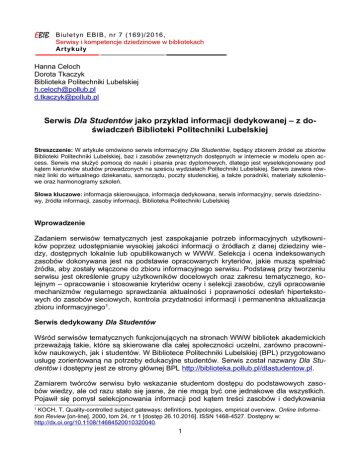 Biulet yn EBIB, nr 7 (169)/2016, Serwisy i kompetencje dziedzinowe w bibliotekach Artykuły Hanna Celoch Dorota Tkaczyk Biblioteka Politechniki Lubelskiej [email protected] [email protected] Serwis Dla Studentów jako przykład informacji dedykowanej – z doświadczeń Biblioteki Politechniki Lubelskiej Streszczenie: W artykule omówiono serwis informacyjny Dla Studentów, będący zbiorem źródeł ze zbiorów Biblioteki Politechniki Lubelskiej, baz i zasobów zewnętrznych dostępnych w internecie w modelu open access. Serwis ma służyć pomocą do nauki i pisania prac dyplomowych, dlatego jest wyselekcjonowany pod kątem kierunków studiów prowadzonych na sześciu wydziałach Politechniki Lubelskiej. Serwis zawiera również linki do wirtualnego dziekanatu, samorządu, poczty studenckiej, a także poradniki, materiały szkoleniowe oraz harmonogramy szkoleń. Słowa kluczowe: informacja skierowująca, informacja dedykowana, serwis informacyjny, serwis dziedzinowy, źródła informacji, zasoby informacji, Biblioteka Politechniki Lubelskiej Wprowadzenie Zadaniem serwisów tematycznych jest zaspokajanie potrzeb informacyjnych użytkowników poprzez udostępnianie wysokiej jakości informacji o źródłach z danej dziedziny wie dzy, dostępnych lokalnie lub opublikowanych w WWW. Selekcja i ocena indeksowanych zasobów dokonywana jest na podstawie opracowanych kryteriów, jakie muszą spełniać źródła, aby zostały włączone do zbioru informacyjnego serwisu. Podstawą przy tworzeniu serwisu jest określenie grupy użytkowników docelowych oraz zakresu tematycznego, kolejnym – opracowanie i stosowanie kryteriów oceny i selekcji zasobów, czyli opracowanie mechanizmów regularnego sprawdzania aktualności i poprawności odesłań hipertekstowych do zasobów sieciowych, kontrola przydatności informacji i permanentna aktualizacja zbioru informacyjnego1. Serwis dedykowany Dla Studentów Wśród serwisów tematycznych funkcjonujących na stronach WWW bibliotek akademickich przeważają takie, które są skierowane dla całej społeczności uczelni, zarówno pracowników naukowych, jak i studentów. W Bibliotece Politechniki Lubelskiej (BPL) przygotowano usługę zorientowaną na potrzeby edukacyjne studentów. Serwis został nazwany Dla Studentów i dostępny jest ze strony głównej BPL http://biblioteka.pollub.pl/dlastudentow.pl. Zamiarem twórców serwisu było wskazanie studentom dostępu do podstawowych zasobów wiedzy, ale od razu stało się jasne, że nie mogą być one jednakowe dla wszystkich. Pojawił się pomysł selekcjonowania informacji pod kątem treści zasobów i dedykowania 1 KOCH, T. Quality-controlled subject gateways: definitions, typologies, empirical overview. Online Information Review [on-line]. 2000, tom 24, nr 1 [dostęp 26.10.2016]. ISSN 1468-4527. Dostępny w: http://dx.oi.org/10.1108/14684520010320040. 1 Biulet yn EBIB, nr 7 (169)/2016, Serwisy i kompetencje dziedzinowe w bibliotekach Artykuły ich konkretnym grupom użytkowników według kierunków studiów. Ostatecznie, ze względu na pokrywanie się wielu dziedzin, zdecydowano, że źródła będą typowane i dzielone bar dziej ogólnie, pod kątem wydziałów Politechniki Lubelskiej. Założono, że serwis będzie redagowany przez bibliotekarzy dziedzinowych pracujących w pięciu bibliotekach specjalistycznych, funkcjonujących na wydziałach i będących w strukturze biblioteki 2. Realizację przedsięwzięcia zaplanowano z użyciem specjalnej aplikacji, która została zaprojektowana przez informatyków zatrudnionych w BPL. Serwis dziedzinowy Dla Studentów posiada pięć zakładek (podstron), które charakteryzują się jednolitą kompozycją i szatą graficzną. Zasadniczy trzon każdej z nich tworzą: • zasób informacyjny (linki), składający się z działów: zasoby biblioteki specjalistycznej, bazy, encyklopedie, słowniki, dodatkowe źródła, • zakres świadczonych usług, • informacje kontaktowe: zdjęcia, telefon i maile bibliotekarzy, godziny otwarcia czytelni oraz ostatnio dołączony live czat. Polecane Zasoby biblioteki specjalistycznej są bezpośrednimi linkami do katalogu bibliotecznego, wykazu czasopism w bibliotece specjalistycznej oraz linkami do podręczników w Bibliotece Cyfrowej PL. W katalogu komputerowym BPL odfiltrowane zostały zasoby bibliotek specjalistycznych, tworząc rozróżniane kolorami podkatalogi dla poszczególnych lokalizacji, dzięki czemu student określonego wydziału otrzymuje wyselekcjonowaną z katalogu listę książek dostępnych w jego bibliotece wydziałowej. Liczba pozycji na liście może być dalej ograniczana, zgodnie z dostępnymi funkcjami w katalogu on-line. Ponadto, studenci mają do dyspozycji lokalną bazę Infonanet informującą o tytułach czasopism drukowanych dostępnych w każdej bibliotece specjalistycznej oraz o tytułach czasopism elek tronicznych indeksowanych w bazach dziedzinowych. Następnym podstawowym źródłem Zasobów biblioteki specjalistycznej jest Biblioteka Cyfrowa PL. Dzięki serwisowi studenci trafiają bezpośrednio do kolekcji e-podręczników autorstwa wykładowców PL. Te same podręczniki w wersji drukowanej znajdują się w zasobach biblioteki. Pozostałe elementy polecanego zasobu informacyjnego, czyli zestaw źródeł i narzędzi – bazy, encyklopedie, słowniki, dodatkowe źródła – opracowywany jest przez bibliotekarzy dziedzinowych. Bazy i inne źródła są przeglądane pod kątem tematycznym i kierunków studiów. Ich zawartość eksponowana jest w sposób ułatwiający dotarcie do ważnych materiałów. Przykładem są chociażby encyklopedie prenumerowane przez bibliotekę w ramach bazy Science Direct. Wyodrębnienie tych tytułów wyraźnie zwiększyło statystyki ich wykorzystania. 2 Szerzej o roli bibliotekarzy dziedzinowych w działalności Biblioteki Politechniki Lubelskiej: GOŃKA, A. Bibliotekarz dziedzinowy i biblioteki specjalistyczne – cztery lata doświadczeń w Bibliotece Poli