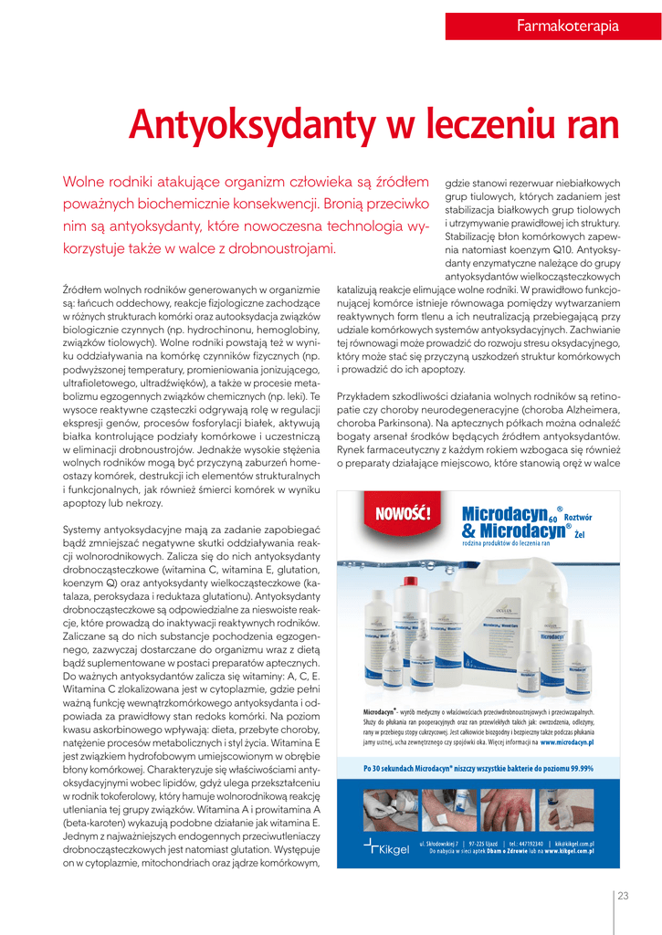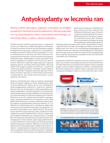 Farmakoterapia Antyoksydanty w leczeniu ran Wolne rodniki atakujące organizm człowieka są źródłem gdzie stanowi rezerwuar niebiałkowych grup tiulowych, których zadaniem jest poważnych biochemicznie konsekwencji. Bronią przeciwko stabilizacja białkowych grup tiolowych nim są antyoksydanty, które nowoczesna technologia wy- i utrzymywanie prawidłowej ich struktury. Stabilizację błon komórkowych zapewkorzystuje także w walce z drobnoustrojami. nia natomiast koenzym Q10. Antyoksydanty enzymatyczne należące do grupy antyoksydantów wielkocząsteczkowych Źródłem wolnych rodników generowanych w organizmie katalizują reakcje elimujące wolne rodniki. W prawidłowo funkcjosą: łańcuch oddechowy, reakcje fizjologiczne zachodzące nującej komórce istnieje równowaga pomiędzy wytwarzaniem w różnych strukturach komórki oraz autooksydacja związków reaktywnych form tlenu a ich neutralizacją przebiegającą przy biologicznie czynnych (np. hydrochinonu, hemoglobiny, udziale komórkowych systemów antyoksydacyjnych. Zachwianie związków tiolowych). Wolne rodniki powstają też w wynitej równowagi może prowadzić do rozwoju stresu oksydacyjnego, ku oddziaływania na komórkę czynników fizycznych (np. który może stać się przyczyną uszkodzeń struktur komórkowych i prowadzić do ich apoptozy. podwyższonej temperatury, promieniowania jonizującego, ultrafioletowego, ultradźwięków), a także w procesie metabolizmu egzogennych związków chemicznych (np. leki). Te Przykładem szkodliwości działania wolnych rodników są retinowysoce reaktywne cząsteczki odgrywają rolę w regulacji patie czy choroby neurodegeneracyjne (choroba Alzheimera, ekspresji genów, procesów fosforylacji białek, aktywują choroba Parkinsona). Na aptecznych półkach można odnaleźć białka kontrolujące podziały komórkowe i uczestniczą bogaty arsenał środków będących źródłem antyoksydantów. w eliminacji drobnoustrojów. Jednakże wysokie stężenia Rynek farmaceutyczny z każdym rokiem wzbogaca się również wolnych rodników mogą być przyczyną zaburzeń homeo preparaty działające miejscowo, które stanowią oręż w walce ostazy komórek, destrukcji ich elementów strukturalnych i funkcjonalnych, jak również śmierci komórek w wyniku apoptozy lub nekrozy. Systemy antyoksydacyjne mają za zadanie zapobiegać bądź zmniejszać negatywne skutki oddziaływania reakcji wolnorodnikowych. Zalicza się do nich antyoksydanty drobnocząsteczkowe (witamina C, witamina E, glutation, koenzym Q) oraz antyoksydanty wielkocząsteczkowe (katalaza, peroksydaza i reduktaza glutationu). Antyoksydanty drobnocząsteczkowe są odpowiedzialne za nieswoiste reakcje, które prowadzą do inaktywacji reaktywnych rodników. Zaliczane są do nich substancje pochodzenia egzogennego, zazwyczaj dostarczane do organizmu wraz z dietą bądź suplementowane w postaci preparatów aptecznych. Do ważnych antyoksydantów zalicza się witaminy: A, C, E. Witamina C zlokalizowana jest w cytoplazmie, gdzie pełni ważną funkcję wewnątrzkomórkowego antyoksydanta i odpowiada za prawidłowy stan redoks komórki. Na poziom kwasu askorbinowego wpływają: dieta, przebyte choroby, natężenie procesów metabolicznych i styl życia. Witamina E jest związkiem hydrofobowym umiejscowionym w obrębie błony komórkowej. Charakteryzuje się właściwościami antyoksydacyjnymi wobec lipidów, gdyż ulega przekształceniu w rodnik tokoferolowy, który hamuje wolnorodnikową reakcję utleniania tej grupy związków. Witamina A i prowitamina A (beta-karoten) wykazują podobne działanie jak witamina E. Jednym z najważniejszych endogennych przeciwutleniaczy drobnocząsteczkowych jest natomiast glutation. Występuje on w cytoplazmie, mitochondriach oraz jądrze komórkowym, 23 Farmakoterapia z chorobami i dolegliwościami. Duża inwazyjność mikroorganizmów jest przyczyną nieustannego prowadzenia badań nad skutecznością środków o działaniu przeciwbakteryjnym, bakteriobójczym i odkażającym. Coraz powszechniejsze stosowanie antybiotyków doprowadza do narastającej lekooporności bakterii. Aby walka z drobnoustrojami była efektywna, wciąż udoskonala się procesy technologiczne służące do produkcji nowych, skutecznych środków przeciwbakteryjnych. Środki antyseptyczne o działaniu miejscowym mogą uszkadzać skórę i działać na nią drażniąco. Opóźnia to proces gojenia ran, a także może wpływać niszcząco na tkanki głębiej położone oraz na skórę znajdującą się w bezpośrednim otoczeniu rany. Bardzo ważne jest, aby zastosowany środek antyseptyczny miał działanie usuwające zanieczyszczenia bakteryjne powierzchni skóry i nie cechował się równoczesną inwazyjnością wobec zdrowych tkanek. Przeprowadzono badania, które udowodniły, że takie cechy wykazuje wodny roztwór ponadtlenkowy zawierający antyoksydanty. Uzyskuje się go na drodze elektrolizy z użyciem półprzepuszczalnych membran bądź reakcji redoks, a substratami procesu są woda oczyszczona i chlorek sodu. Wynikiem reakcji jest powstanie silnie utlenionej wody o obojętnym pH i kontrolowanej zawartości utleniaczy. Roztwór wodny o neutralnym pH zawiera wolne związki chloru (<85 ppm), reaktywne formy tlenu (ang. reactive oxygen species, ROS), natlenioną wodę (99,99%), podchloryn sodu (<50 ppm), kwas podchlorawy (<60 ppm), nadtlenek wodoru (<4 ppm), dwutlenek chloru (<1,5 ppm), węglan sodu (<21 ppm), chlorek sodu (<110 ppm), ozon (<0,2 ppm) i wodorotlenek sodu (<8 ppm). Jak wykazały przeprowadzone badania, reaktywne formy tlenu wykazują działanie bakteriobójcze wobec tlenowych pałeczek Gram– i Gram+. Wodne roztwory rodników ponadtlenkowych są niezwykle skuteczne w terapii zakażeń skóry, prze24 wlekłych owrzodzeń (np. w przebiegu cukrzycy, niewydolności krążenia obwodowego), a także przyspieszają gojenie się ran. Rodniki ponadtlenkowe działają bezpośrednio utleniająco wobec komór