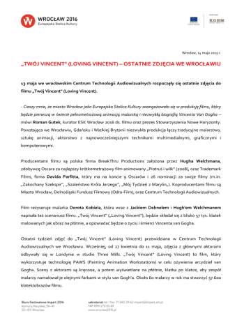 Wrocław, 14 maja 2015 r. „TWÓJ VINCENT" (LOVING VINCENT) – OSTATNIE ZDJĘCIA WE WROCŁAWIU 13 maja we wrocławskim Centrum Technologii Audiowizualnych rozpoczęły się ostatnie zdjęcia do filmu „Twój Vincent" (Loving Vincent). - Cieszy mnie, że miasto Wrocław jako Europejska Stolica Kultury zaangażowało się w produkcję filmu, który będzie pierwszą w świecie pełnometrażową animacją malarską i niezwykłą biografią Vincenta Van Gogha – mówi Roman Gutek, kurator ESK Wrocław 2016 ds. filmu oraz prezes Stowarzyszenia Nowe Horyzonty. Powstająca we Wrocławiu, Gdańsku i Wielkiej Brytanii niezwykła produkcja łączy tradycyjne malarstwo, sztukę animacji, aktorstwo z najnowocześniejszymi technikami multimedialnymi, graficznymi i komputerowymi. Producentami filmu są polska firma BreakThru Productions założona przez Hugha Welchmana, zdobywcę Oscara za najlepszy krótkometrażowy film animowany „Piotruś i wilk” (2008), oraz Trademark Films, firma Davida Parfitta, który ma na koncie 9 Oscarów i 26 nominacji za swoje filmy (m.in. „Zakochany Szekspir”, „Szaleństwo Króla Jerzego”, „Mój Tydzień z Marylin„). Koproducentami filmu są Miasto Wrocław, Dolnośląski Fundusz Filmowy (Odra-Film), oraz Centrum Technologii Audiowizualnych. Film reżyseruje malarka Dorota Kobiela, która wraz z Jackiem Dehnelem i Hugh'em Welchmanem napisała też scenariusz filmu. „Twój Vincent” („Loving Vincent”), będzie składał się z blisko 57 tys. klatek malowanych jak obraz na płótnie, a opowiadać będzie o życiu i śmierci Vincenta van Gogha. Ostatni tydzień zdjęć do „Twój Vincent” (Loving Vincent) przewidziano w Centrum Technologii Audiowizualnych we Wrocławiu. Wcześniej, od 27 kwietnia do 11 maja, zdjęcia z głównymi aktorami odbywały się w Londynie w studio Three Mills. „Twój Vincent” (Loving Vincent) to film, który wykorzystuje technologię PAWS (Painting Animation Workstations) w celu ożywienia arcydzieł van Gogha. Sceny z aktorami są kręcone, a potem wyświetlane na płótnie, klatka po klatce, aby zespół malarzy namalował je olejnymi farbami w stylu van Gogh’a. Około 60 malarzy w rok ma stworzyć 57.600 klatek/obrazów filmu. Główna obsada „Twój Vincent” („Loving Vincent”) to: Douglas Booth (Jupiter: Intronizacja, Klub dla wybrańców, Noe), Jerome Flynn (Gra o Tron, Ripper Street), zdobywca nagrody Emmy – Chris O’Dowd (Druchny, serial angielski The IT Crowd), nominowany do Oscara Saoirse Ronan (The Grand Budapest Hotel, Nostalgia Anioła, Pokuta), John Sessions (Brud, Żelazna Dama), Eleanor Tomlinson (Poldark, Śmierć w Pemberley, Biała Królowa) i Aidan Turner (Poldark, Hobbit). Premiera filmu odbędzie się w 2016 roku we Wrocławiu, który będzie w tym czasie Europejską Stolicą Kultury. Materiały dla prasy, w tym trailer, plakaty i animacje znajdują się pod tym linkiem: TUTAJ. Więcej informacji: Magda Bargiel: [email protected] Wrocław Europejska Stolica Kultury 2016 ESK 2016 to nie tylko rozpisany na kilka lat z kulminacją w 2016 roku program wydarzeń artystycznych, festiwali, koncertów i imprez w przestrzeni miejskiej, ale i cały zestaw programów społecznych, kulturalnych i edukacyjnych skierowanych dla mieszkańców Wrocławia. Istotnymi punktami Europejskiej Stolicy Kultury są też inicjatywy wrocławian współtworzących program ESK m.in. przez program mikroGRANTÓW. Nad realizacją planu ESK, wchodzącej w skład strategii rozwoju Wrocławia, pracuje zespół ekspertów, menedżerów, artystów skupionych wokół Biura Europejskiej Stolicy Kultury Wrocław 2016. Program imprez konstruują kuratorzy poszczególnych sekcji (architektura, film, literatura, muzyka, opera, sztuki wizualne, teatr, performance), połączeni spójną wizją miasta – tętniącego kulturą forum. Wrocław jest pierwszym polskim miastem, który otrzymał prestiżowy tytuł Europejskiej Stolicy Kultury w obecnym kształcie. Ideą ESK, która jest programem Unii i Komisji Europejskiej, zainicjowanym w 1985 roku przez grecką Minister Kultury Melinę Mercouri, jest wzajemne poznanie, zbliżenie i dialog międzykulturowy Europejczyków. Miasta noszące tytuł ESK przez rok skupiają na sobie uwagę całej Europy. Kontakt dla mediów: Wiola Samborska, tel. 508 491 809, [email protected] Magda Babiszewska, tel. 600 980 370, [email protected] Grzegorz Maryniec, tel. 797 128 790, [email protected]