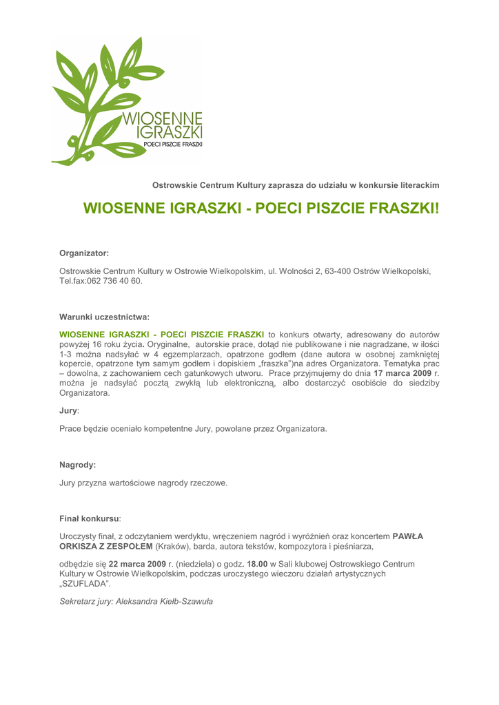 Ostrowskie Centrum Kultury zaprasza do udziału w konkursie literackim WIOSENNE IGRASZKI - POECI PISZCIE FRASZKI! Organizator: Ostrowskie Centrum Kultury w Ostrowie Wielkopolskim, ul. Wolności 2, 63-400 Ostrów Wielkopolski, Tel.fax:062 736 40 60. Warunki uczestnictwa: WIOSENNE IGRASZKI - POECI PISZCIE FRASZKI to konkurs otwarty, adresowany do autorów powyżej 16 roku życia. Oryginalne, autorskie prace, dotąd nie publikowane i nie nagradzane, w ilości 1-3 można nadsyłać w 4 egzemplarzach, opatrzone godłem (dane autora w osobnej zamkniętej kopercie, opatrzone tym samym godłem i dopiskiem „fraszka”)na adres Organizatora. Tematyka prac – dowolna, z zachowaniem cech gatunkowych utworu. Prace przyjmujemy do dnia 17 marca 2009 r. można je nadsyłać pocztą zwykłą lub elektroniczną, albo dostarczyć osobiście do siedziby Organizatora. Jury: Prace będzie oceniało kompetentne Jury, powołane przez Organizatora. Nagrody: Jury przyzna wartościowe nagrody rzeczowe. Finał konkursu: Uroczysty finał, z odczytaniem werdyktu, wręczeniem nagród i wyróżnień oraz koncertem PAWŁA ORKISZA Z ZESPOŁEM (Kraków), barda, autora tekstów, kompozytora i pieśniarza, odbędzie się 22 marca 2009 r. (niedziela) o godz. 18.00 w Sali klubowej Ostrowskiego Centrum Kultury w Ostrowie Wielkopolskim, podczas uroczystego wieczoru działań artystycznych „SZUFLADA”. Sekretarz jury: Aleksandra Kiełb-Szawuła Kochani Autorzy, przypominamy, że: Fraszka – (wł. frasca - gałązka, drobiazg, bagatela, błahostka) – krótki utwór liryczny, zazwyczaj rymowany lub wierszowany o różnorodnej tematyce, często humorystycznej lub ironicznej (satyrycznej). Posiada pointę. Fraszka wywodzi się ze starożytności, swoimi korzeniami sięga do epigramatu, którego twórcą był Symonides z Keos. Były to krótkie napisy na kamieniach nagrobnych (epitafium) i przedmiotach codziennego użytku. Autorami fraszek było wielu znanych polskich poetów, między innymi Jan Kochanowski, Jan Sztaudynger. Kochanowski wprowadził fraszkę do literatury polskiej. Oprócz tematyki żartobliwej, np. fraszka O doktorze Hiszpanie, pisywał także fraszki refleksyjne (O żywocie ludzkim), pochwalne, biesiadne, miłosne (Do Kasi). Bardzo znane są: Na dom w Czarnolesie, Na lipę, Raki. Do dziś zachowało się ok. 485 fraszek Jana Kochanowskiego. Podział fraszek: autobiograficzne, filozoficzno-refleksyjne, patriotyczne, autotematyczne, satyryczne, obyczajowe, religijne, miłosne, erotyczne.
