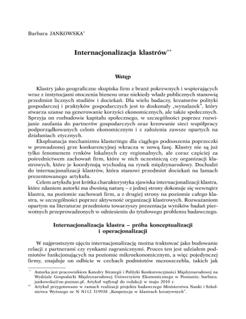Barbara JANKOWSKA* Internacjonalizacja klastrów** Wstęp Klastry jako geograficzne skupiska firm z branż pokrewnych i wspierających wraz z instytucjami otoczenia biznesu oraz niekiedy władz publicznych stanowią przedmiot licznych studiów i dociekań. Dla wielu badaczy, kreatorów polityki gospodarczej i praktyków gospodarczych jest to doskonały „wynalazek”, który stwarza szanse na generowanie korzyści ekonomicznych, ale także społecznych. Sprzyja on rozbudowie kapitału społecznego, w szczególności poprzez rozwijanie zaufania do partnerów gospodarczych oraz kreowanie sieci współpracy podporządkowanych celom ekonomicznym i z założenia zawsze opartych na działaniach etycznych. Eksploatacja mechanizmu klasteringu dla ciągłego podnoszenia poprzeczki w prowadzonej grze konkurencyjnej wkracza w nową fazę. Klastry nie są już tylko fenomenem rynków lokalnych czy regionalnych, ale coraz częściej za pośrednictwem zachowań firm, które w nich uczestniczą czy organizacji klastrowych, które je koordynują wychodzą na rynek międzynarodowy. Dochodzi do internacjonalizacji klastrów, która stanowi przedmiot dociekań na łamach prezentowanego artykułu. Celem artykułu jest krótka charakterystyka zjawiska internacjonalizacji klastra, które zdaniem autorki ma dwoistą naturę – z jednej strony dokonuje się wewnątrz klastra, na poziomie zachowań firm, a z drugiej strony na poziomie całego klastra, w szczególności poprzez aktywność organizacji klastrowych. Rozważaniom opartym na literaturze przedmiotu towarzyszy prezentacja wyników badań pierwotnych przeprowadzonych w odniesieniu do tytułowego problemu badawczego. Internacjonalizacja klastra – próba konceptualizacji i operacjonalizacji W najprostszym ujęciu internacjonalizację można traktować jako budowanie relacji z partnerami czy rynkami zagranicznymi. Proces ten jest udziałem podmiotów funkcjonujących na poziomie mikroekonomicznym, a więc pojedynczej firmy, znajduje on odbicie w cechach podmiotów mezoszczebla, takich jak * ** Autorka jest pracownikiem Katedry Strategii i Polityki Konkurencyjności Międzynarodowej na Wydziale Gospodarki Międzynarodowej Uniwersytetu Ekonomicznego w Poznaniu; barbara. [email protected]. Artykuł wpłynął do redakcji w maju 2010 r. Artykuł przygotowano w ramach realizacji projektu badawczego Ministerstwa Nauki i Szkolnictwa Wyższego nr N N112 319938 „Koopetycja w klastrach kreatywnych”. 20 GOSPODARKA NARODOWA Nr 5-6/2010 branże czy tytułowe klastry, a nawet w charakterystykach całych gospodarek narodowych i ugrupowań integracyjnych. Przyjmując systemową perspektywę badawczą i dążąc do zbadania klastra – systemu mezoekonomicznego, jako podmiotu i przedmiotu internacjonalizacji, trzeba wskazać na konieczność osadzenia dociekań badawczych na szczeblu mikro- i mezoekonomicznym. Internacjonalizacja obiektów wyższego poziomu jest po części efektem internacjonalizacji dokonującej się w odniesieniu do ich składowych, a po części jest rezultatem zmian zachodzących na poziomie, na którym dany system funkcjonuje. Systemowa natura klastra zachęca w związku z powyższym do przeprowadzenia analizy redukcyjnej i autonomicznej w odniesieniu do problemu internacjonalizacji. Analiza redukcyjna w danym przypadku będzie sprowadzała się do zbadania internacjonalizacji przedsiębiorstw partycypujących w klastrze. Analiza autonomiczna koncentruje uwagę na umiędzynarodowieniu na poziomie całego klastra. W pierwszym przypadku chodzi więc raczej o pokazanie, jak umiędzynarodawia się klaster za pośrednictwem firm, co oznacza, że sam klaster jest przedmiotem internacjonalizacji. Jest obiektem, który się zmienia dzięki pewnym zachowaniom swoich części składowych, nie jest aktorem w procesie internacjonalizacji. Natomiast w drugim przypadku, klaster jest podmiotem internacjonalizacji. Decyzje związane z umiędzynarodowieniem zapadają nie na szczeblu pojedynczych firm uczestniczących w klastrze, ale na poziomie całego klastra, który jest reprezentowany przez organizację klastrową. W literaturze przedmiotu można odnaleźć kilka modeli internacjonalizacji przedsiębiorstwa1 oraz propozycje, jak mierzyć poziom internacjonalizacji. Najbardziej popularne modele umiędzynarodowienia firmy to modele ewolucyjne, innowacyjne, internacjonalizacji niekonwencjonalnej czy podejście sieciowe. Koncepcje te w szczegółach różnią się od siebie, choć niewątpliwie ich wspólną cechą jest szerokie odwoływanie się do wiedzy i uczenia się [Forsgren, 2002], [Hadjikhani, Johanson, 2002], [Yli-Renko, Chetty, Eriksson, 2002], [Pedersen, Petersen, Benito, 2002], [Andersen, Buvik, 2002], [Anderson, 2002]. Modele te zasadniczo są adekwatne do specyfiki poziomu mikroekonomicznego i opisują, jak może przebiegać proces internacjonalizacji przedsiębiorstwa. W tym sensie są przydatne do badania umiędzynarodowienia klastra poprzez zachowania firm w nim partycypujących, czyli raczej do rozpoznania natury klastra jako przedmiotu umiędzynarodowienia. Gdy podejmuje się próbę rozpoznania internacjonalizacji na szczeblu całego klastra, to adekwatność tychże ujęć jest dużo mniejsza, wyjątek stanowi podejście sieciowe. W ramach niego wskazuje się, że internacjonalizacja wiąże się z budowaniem sieci, z jej rozbudową jeśli chodzi o liczbę uczestników lub liczbę powiązań, jakie między tymi podmiotami istnieją. Umiędzynarodowienie oznacza więc przyłączanie się do sieci i pogłębianie zaangażowania w poszczególne sieci. Takie ujęcie jest adekwatne do specyfiki klastra jako podmiotu internacjonalizacji, który poprzez aktywność organizacji klastrowej może rzeczywiście budować sieci, 1 Szerokie omówienie modeli internacjonalizacji firmy można znaleźć w artykule: [Gorynia, Jankowska, 2007, s. 21-44]. Barbara Jankowska, Internacjonalizacja klastrów 21 przyłączać się jako całość do innych klastrów