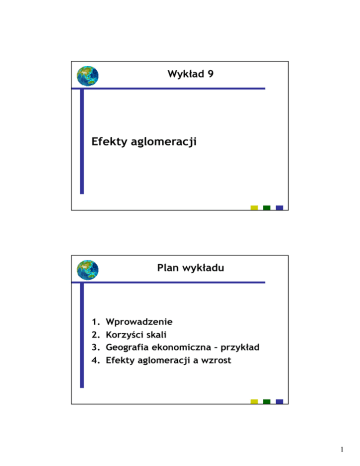 Wykład 9 Efekty aglomeracji Plan wykładu 1. 2. 3. 4. Wprowadzenie Korzyści skali Geografia ekonomiczna – przykład Efekty aglomeracji a wzrost 1 1. Wprowadzenie 1/6 Ludzie mają skłonność do grupowania się (tworzenia klastrów) z powodów Socjologicznych (interakcje z innymi). Psychologicznych (strach przed samotnością). Historycznych. Geograficznych. Ekonomicznych. Koncentrowanie działalności gospodarczej na określonym terenie określa się mianem aglomeracji działalności gospodarczej. Aglomeracja dokonuje się na poziomie globalnym, kontynentalnym lub krajowym. 1. Wprowadzenie 2/6 Rozkład działalności gospodarczej w Europie (wg. A. Copusa, na danych z 1105 regionów w UE). Rozpatrywany w ramach podziału CentrumPeryferie. Centrum zdefiniowane jako największe miasto. Uwzględnia czas potrzebny aby dotrzeć do innego centrum, z uwzględnieniem jakości dróg i innej infrastruktury, limitów prędkości w miastach (górach, etc.), niezbędnego czasu odpoczynku, etc. Uwzględnia potencjalną wielkość rynku, mierzoną wielkością PKB z uwzględnieniem różnic w sile nabywczej (PPP). Indeks peryferyjności – przyjmuje wartość 0 dla najbardziej centralnego regionu z największym potencjałem i 100 dla regionu najbardziej peryferyjnego. 2 1. Wprowadzenie 3/6 Struktura CentrumPeryferie w Europie. (Hinloopen, van Marrewijk) 1. Wprowadzenie 4/6 Dlaczego koncentracja? Korzyści skali Koszty transportu 3 1. Wprowadzenie 5/6 Polder PółnocnoWschodni (48 tys. hektarów) 19371942 1. Wprowadzenie 6/6 4 2. Korzyści skali 1/6 Przykład wykorzystania korzyści skali: Dongguan w Chinach W 1978r. grupa wiosek zamieszkana przez 400 tys. ludzi żyjących z połowu ryb i rolnictwa. Od 1980r. Tempo wzrostu PKB wynosi 20% rocznie i obecnie zamieszkiwany przez 7 mln ludzi. Ten rozwój bez wątpienia wynikał z dostępności gruntów i siły roboczej, ale też korzyści skali: jedna z fabryk w Dongguan wytwarzała w 2005r. 30% światowej produkcji głowic odczytująco-zapisujących wykorzystywanych w napędach twardych dysków; inna – 30 mln telefonów komórkowych; następna – 60% elektronicznych urządzeń do nauki sprzedawanych w USA. Korzyści skali nie ograniczyły się do pojedynczych firm: w Dongguan produkuje się 95% wszystkich komponentów potrzebnych w produkcji komputerów osobistych. Fabryki tego miasta dostarczają 40% światowej produkcji niektórych z tych komponentów. 2. Korzyści skali 2/6 Korzyści skali polegają na spadku przeciętnego kosztu (kosztu przypadającego na jednostkę produktu) w miarę wzrostu wielkości produkcji. Korzyści skali mogą być wewnętrzne lub zewnętrzne. Zewnętrzne korzyści skali są tożsame z korzyściami z aglomeracji. Wewnętrzne korzyści skali polegają na redukcji kosztów przeciętnych dzięki większej produkcji danego zakładu. Wewnętrzne korzyści skali są pieniężne (zakup dóbr zaopatrzeniowych po niższej cenie) albo technologiczne: statyczne (stały koszt rozłożony na większą produkcję) lub dynamiczne (umiejętność zarządzania firmą zdobywana przez doświadczenie i skalę produkcji). 5 2. Korzyści skali 3/6 Poszczególne gałęzie charakteryzują się różnymi wewnętrznymi korzyściami skali produkcji: Stałe lub słabo rosnące wewnętrzne korzyści skali: produkcja ubrań, tkanin, wyrobów ze skór, z drewna, większości produktów rolnictwa. Silnie rosnące wewnętrzne korzyści skali: farmaceutyki (i inne produkty chemiczne), produkcja samochodów, wytwarzanie energii i gazu, produkcja metali, cementu, benzyn, maszyn i urządzeń biurowych, napojów i papierosów, poligrafia i działalność wydawnicza. 2. Korzyści skali 4/6 Zewnętrzne korzyści skali mogą wynikać z korzyści z lokalizacji i urbanizacji. Korzyści skali płynące z lokalizacji zależą od liczby firm w tej samej gałęzi i ulokowanych w tym samym miejscu. Statyczne korzyści z lokalizacji wynikają z: dużej liczby konsumentów w miejscach koncentracji producentów, możliwości outsourcingu, przyciągania pracowników o specyficznych kwalifikacjach. Dynamiczne korzyści z lokalizacji wynikają z rozprzestrzeniającej się między firmami (ulokowanymi w jednym miejscu), płynącej z rutynowej i nieprzerwanej działalności produkcyjnej, wiedzy. 6 2. Korzyści skali 5/6 Zewnętrzne korzyści skali z urbanizacji wynikają z większej liczby firm z różnych gałęzi wytwórczości działających w tym samym miejscu. Statyczne korzyści z urbanizacji wynikają z: obserwacji i adaptacji technik z innych gałęzi (także za pośrednictwem przepływu pracowników) oraz specjalizacji w produkcji dóbr zaopatrzeniowych. Dynamiczne korzyści z urbanizacji wynikają z przyciągnięcia różnych firm i pracowników do danej lokalizacji, powiększenia rynku i zysków, przyciągnięcia nowych firm i pracowników… Zewnętrzne korzyści skali, tzw. „czyste” oznaczają rozłożenie kosztów stworzenia infrastruktury na większą liczbę podatników. 2. Korzyści skali 6/6 Efekty aglomeracji są wzmacniane przez gęstość (liczbę pracowników) i osłabiane przez odległość: Podwojenie wielkości miasta podnosi produktywność o 3-8%. Podwojenie gęstości podnosi produktywność o 5% (Europa). 10% wzrost zatrudnienia w danej gałęzi podnosi produkcję firmy (bez zmiany nakładów) o 0.6-0.8% Wzrost odległości od centrum miasta o 1% obniża produktywność o 0.13%. Podwojenie czasu dojazdu do centrum obniża produktywność o 15%. 7 3. Geografia ekonomiczna przykład 1/5 Przykład ilustruje źródła aglomeracji działalności gospodarczej. Rozważmy dwa kraje: A i B oraz dwie gałęzie produkcji: przemysł i rolnictwo. Każda z firm w przemyśle sprzedaje 6 jednostek rolnikom i 4 robotnikom. Całkowity popyt = 10. Popyt na produkty rolnictwa jest przypisany do kraju. W kraju A wynosi 4, zaś w kraju B wynosi 2. (Część czynników produkcji jest niemobilna). Robotnicy mogą przemieszczać się między A i B. Koszty transportu 