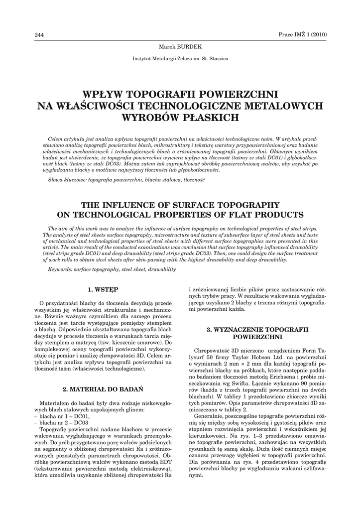 Prace IMŻ 1 (2010) 244 Marek BURDEK Instytut Metalurgii Żelaza im. St. Staszica WPŁYW TOPOGRAFII POWIERZCHNI NA WŁAŚCIWOŚCI TECHNOLOGICZNE METALOWYCH WYROBÓW PŁASKICH Celem artykułu jest analiza wpływu topografii powierzchni na właściwości technologiczne taśm. W artykule przedstawiono analizę topografii powierzchni blach, mikrostrukturę i teksturę warstwy przypowierzchniowej oraz badanie właściwości mechanicznych i technologicznych blach o zróżnicowanej topografii powierzchni. Głównym wynikiem badań jest stwierdzenie, że topografia powierzchni wywiera wpływ na tłoczność (taśmy ze stali DC01) i głębokotłoczność blach (taśmy ze stali DC03). Można zatem tak zaprojektować obróbkę powierzchniową walców, aby uzyskać po wygładzaniu blachy o możliwie najwyższej tłoczności lub głębokotłoczności. Słowa kluczowe: topografia powierzchni, blacha stalowa, tłoczność THE INFLUENCE OF SURFACE TOPOGRAPHY ON TECHNOLOGICAL PROPERTIES OF FLAT PRODUCTS The aim of this work was to analyze the influence of surface topography on technological properties of steel strips. The analysis of steel sheets surface topography, microstructure and texture of subsurface layer of steel sheets and tests of mechanical and technological properties of steel sheets with different surface topographies were presented in this article. The main result of the conducted examinations was conclusion that surface topography influenced drawability (steel strips grade DC01) and deep drawability (steel strips grade DC03). Then, one could design the surface treatment of work rolls to obtain steel sheets after skin-passing with the highest drawability and deep drawability. Keywords: surface topography, steel sheet, drawability 1. WSTĘP O przydatności blachy do tłoczenia decydują przede wszystkim jej właściwości strukturalne i mechaniczne. Równie ważnym czynnikiem dla samego procesu tłoczenia jest tarcie występujące pomiędzy stemplem a blachą. Odpowiednio ukształtowana topografia blach decyduje w procesie tłoczenia o warunkach tarcia między stemplem a matrycą (tzw. kieszenie smarowe). Do kompleksowej oceny topografii powierzchni wykorzystuje się pomiar i analizę chropowatości 3D. Celem artykułu jest analiza wpływu topografii powierzchni na tłoczność taśm (właściwości technologiczne). 2. MATERIAŁ DO BADAŃ Materiałem do badań były dwa rodzaje niskowęglowych blach stalowych uspokojonych glinem: – blacha nr 1 – DC01, – blacha nr 2 – DC03 Topografię powierzchni nadano blachom w procesie walcowania wygładzającego w warunkach przemysłowych. Do prób przygotowano parę walców podzielonych na segmenty o zbliżonej chropowatości Ra i zróżnicowanych pozostałych parametrach chropowatości. Obróbkę powierzchniową walców wykonano metodą EDT (teksturowanie powierzchni metodą elektroiskrową), która umożliwia uzyskanie zbliżonej chropowatości Ra i zróżnicowanej liczbie pików przez zastosowanie różnych trybów pracy. W rezultacie walcowania wygładzającego uzyskano 2 blachy z trzema różnymi topografiami powierzchni każda. 3. WYZNACZENIE TOPOGRAFII POWIERZCHNI Chropowatość 3D mierzono urządzeniem Form Talysurf 50 firmy Taylor Hobson Ltd. na powierzchni o wymiarach 2 mm × 2 mm dla każdej topografii powierzchni blachy na próbkach, które następnie poddano badaniom tłoczności metodą Erichsena i próbie miseczkowania wg Swifta. Łącznie wykonano 90 pomiarów (każda z trzech topografii powierzchni na dwóch blachach). W tablicy 1 przedstawiono zbiorcze wyniki tych pomiarów. Opis parametrów chropowatości 3D zamieszczono w tablicy 2. Generalnie, poszczególne topografie powierzchni różnią się między sobą wysokością i gęstością pików oraz stopniem rozwinięcia powierzchni i wskaźnikiem jej kierunkowości. Na rys. 1–3 przedstawiono omawiane topografie powierzchni, zachowując na wszystkich rysunkach tę samą skalę. Duża ilość ciemnych miejsc oznacza przewagę wgłębień w topografii powierzchni. Dla porównania na rys. 4 przedstawiono topografię powierzchni blachy po wygładzaniu walcami szlifowanymi. Prace IMŻ 1 (2010) Wpływ topografii powierzchni na właściwości technologiczne... 245 Tablica 1. Wyniki pomiarów chropowatości 3D badanych topografii powierzchni Table 1. 3D surface parameters for examined surface topographies Sq Sp Sv St μm μm μm μm A 1,39 7,04 5,73 12,78 0,26 3,0 0,0070 B 1,42 7,83 6,28 14,10 0,11 3,8 0,0078 C 1,45 7,55 6,38 13,93 0,09 3,9 Topografia Ssk SPc Smvr pks/mm2 mm3/mm2 Str Sdq Ssc Sdr μm/μm 1/μm % 0,44 0,11 0,05 0,64 0,40 0,13 0,06 0,88 0,0076 0,26 0,15 0,06 1,13 Blacha nr 1 Blacha nr 2 A 1,29 6,90 4,83 11,73 0,32 2,4 0,0069 0,47 0,10 0,04 0,48 B 1,29 8,01 5,72 13,73 0,31 2,9 0,0080 0,37 0,12 0,05 0,74 C 1,32 8,14 5,07 13,21 0,22 3,2 0,0081 0,26 0,15 0,06 1,02 Rys. 1. Topografia A blachy nr 1 Rys. 3. Topografia C blachy nr 1 Fig. 1. Surface topography A of steel sheet No. 1 Fig. 3. Surface topography C of steel sheet No. 1 Rys. 2. Topografia B blachy nr 1 Rys. 4. Topografia blachy nr 1 po wygładzaniu walcami szlifowanymi Fig. 2. Surface topography B of steel sheet No. 1 Tablica 2. Wybrane parametry chropowatości 3D Fig. 4. Surface topography of steel sheet No.1 after skinpassing using grinding rolls Table 2. Selected 3D roughness parameters Oznaczenie Opis Sa średnia arytmetyczna rzędnych profilu powierzchni Sq średnie kwadratowe odchylenie powierzchni od powierzchni odniesienia St całkowita wysokość profilu powierzchni Sp wysokość największego piku na powierzchni Sv głębokość największego wgłębienia profilu powierzchni Ssk współczynnik asymetrii profilu powierzchni SPc liczba pików przecinających wybrane centrycznie płaszczyzny odniesienia równoległe do płaszczyzny średniej Str wskaźnik kierunkowości powierzchni Sdr rozwinięcie powierzchni Ssc średnia arytmetyczna krzywizny wierzchołków Sdq średniokwadratowe pochylenie nierówności po