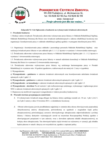 PODDĘBICKIE CENTRUM ZDROWIA 99-200 Poddębice, ul. Mickiewicza 16, tel. 43/828 82 50,fax 43/828 82 55 www. nzozpcz.pl „…Twoje zdrowie jest dla nas ważne...” Załącznik Nr 1 do Ogłoszenia o konkursie na wykonywanie świadczeń zdrowotnych I – Przedmiot konkursu 1. Rodzaj i zakres świadczeń: Świadczenia zdrowotne wykonywane przez lekarzy w Oddziale Rehabilitacji Ogólnej, Oddziale Rehabilitacji Dziennej dla Dzieci oraz świadczeń ambulatoryjnych z zakresu rehabilitacji leczniczej oraz organizacja i koordynowanie pracy w oddziale rehabilitacji ogólnej zgodnie z wymogami określonymi przez NFZ. 1.1. Organizacja i koordynowanie pracy oddziału i pozostałego personelu Oddziału Rehabilitacji Ogólnej oraz realizacja świadczeń przez lekarza w tym oddziale (pkt 1.1. i 1.2. łącznie w wymiarze 1 równoważnika etatowego); 1.2. Świadczenia zdrowotne wykonywane przez lekarzy w Oddziale Rehabilitacji Ogólnej (pkt 1.1. i 1.2. łącznie w wymiarze 1 równoważnika etatowego); 1.3. Świadczenia zdrowotne wykonywane przez lekarzy w ramach udzielania konsultacji w Oddziale Rehabilitacji Dziennej dla Dzieci (w wymiarze1/2 równoważnika etatowego); 1.4. Świadczenia zdrowotne wykonywane przez lekarzy wg ustalonego harmonogramu pracy w Poradni Rehabilitacji (w wymiarze min. 10 godzin tygodniowo, realizowanych nie mniej niż 2 razy w tygodniu). 2. Wynagrodzenie: a) Wynagrodzenie - godzinowe w zakresie świadczeń zdrowotnych oraz koordynowanie udzielania świadczeń opisanych w pkt 1 ppkt 1.1 b) Wynagrodzenie - godzinowe w zakresie świadczeń zdrowotnych opisanych w pkt 1 ppkt 1.2 c) Wynagrodzenie - za konsultację w zakresie świadczeń zdrowotnych opisanych w pkt 1ppkt 1.3 d) Wynagrodzenie - określone % od wartości 1 pkt rozliczeniowego ustalonego, wykonanego i zapłaconego przez NFZ w zakresie świadczeń zdrowotnych opisanych w pkt 1 ppkt 1.4 3. Dopuszcza się możliwość negocjacji wynagrodzenia w trakcie procedury konkursowej. II – Warunki stawiane przyjmującym zamówienie 1. O wykonywanie świadczeń mogą ubiegać się lekarze, którzy spełniają warunki art. 18 ust. 1 pkt 1,2,4,5 i ust.2 pkt 2 ustawy z dnia 15 kwietnia 2011 r. o działalności leczniczej 2. Oferent zobowiązany jest do przedkładania najpóźniej w ostatnim dniu okresu obowiązywania poprzedniej /dotychczasowej umowy ubezpieczenia, potwierdzonej za zgodność z oryginałem kopii polisy ubezpieczeniowej potwierdzającej zawarcie obowiązkowego ubezpieczenia odpowiedzialności cywilnej lekarzy i lekarzy dentystów wykonujących zawód na terytorium Rzeczpospolitej Polskiej zgodnie z obowiązującymi przepisami w tym zakresie, wraz z dowodem opłacenia składki ubezpieczeniowej, na kolejny okres ubezpieczenia. Ten obowiązek będzie ciążył również na wykonawcy w sytuacji, gdy składka będzie płacona w ratach i dotyczy on wszystkich rat, zgodnie z zapisami polisy. Sąd Rejonowy dla Łodzi - Śródmieścia w Łodzi XX wydział KRS pod nr KRS 0000384815 REGON 101075971; NIP 8281409238; Kapitał założycielski 2 258 200,00 PLN RACHUNEK BANKOWY: Bank Spółdzielczy w Wartkowicach filia w Poddębicach nr konta: 68 9271 0005 0021 7831 2000 0010 PODDĘBICKIE CENTRUM ZDROWIA 99-200 Poddębice, ul. Mickiewicza 16, tel. 43/828 82 50,fax 43/828 82 55 www. nzozpcz.pl „…Twoje zdrowie jest dla nas ważne...” 3. Wykształcenie: lekarz specjalista w danej dziedzinie, lub lekarz ze specjalizacją I stopnia, lub lekarz ze specjalizacją II stopnia. 4. Doświadczenie zawodowe: Lekarz z doświadczeniem zawodowym wymaganym dla danej dziedziny według załączników do Rozporządzenia Ministra Zdrowia z dnia 6 listopada 2013 roku w sprawie świadczeń gwarantowanych z zakresu rehabilitacji leczniczej III – Przygotowanie oferty 1. Oferent przedstawia ofertę zgodnie z wymogami określonymi w niniejszym załączniku , warunkami konkursu oraz w ogłoszeniu o konkursie. 2. Wszelkie koszty związane z przygotowaniem i złożeniem oferty ponosi przyjmujący zamówienie. 3. Oferta powinna być przygotowana w języku polskim na komputerze lub czytelnym pismem ręcznym. 4. Ofertę podpisuje osoba składająca ofertę. 5. Wszelkie poprawki lub zmiany w tekście muszą być parafowane i datowane własnoręcznie przez osobę podpisującą ofertę. 6. Oferta powinna zawierać wszystkie wymagane niniejszym ogłoszeniem oświadczenia i dokumenty. 7. Ceny oferty muszą być podane jako ceny brutto w złotych polskich. Ceny winny być wpisane przez Oferenta do Formularza oferty. 8. Ofertę należy umieścić w zaklejonej kopercie. Koperta powinna być zaadresowana na adres Udzielającego zamówienia i posiadać dopisek: "Udzielanie świadczeń przez lekarzy w Oddziale Rehabilitacji Ogólnej/ w Oddziale Rehabilitacji Dziennej dla Dzieci / wg ustalonego harmonogramu pracy w Poradni Rehabilitacji PCZ sp. z o. o. w Poddębicach”* *wybierz właściwe IV – Wprowadzanie zmian do oferty Oferent może wprowadzić zmiany lub wycofać złożoną ofertę przed upływem terminu składania ofert. Powiadomienie o wprowadzaniu zmian lub wycofaniu oferty winno zostać złożone w sposób i formie przewidzianej dla oferty, z tym, że koperta powinna być dodatkowo oznaczona dopiskiem „ZMIANA” lub „WYCOFANIE”. V- Wymagane dokumenty 1. Formularz ofertowy – sporządzony i wypełniony według wzoru stanowiącego załącznik do ogłoszenia o konkursie. 2. Kopia dyplomu ukończenia studiów wyższych. 3. Kopia Prawa wykonywania zawodu. 4. Kopia dyplomu poświadczającego posiadane specjalizacje 5. Kopia dokumentów poświadczających kwalifikacje dodatkowe Sąd Rejonowy dla Łodzi - Śródmieścia w Łodzi XX wydział KRS pod nr KRS 0000384815 REGON 101075971; NIP 8281409238; Kapitał założycielski 2 258 200,00 PLN RACHUNEK BANKOWY: Bank Spółdzielczy w Wartkowicach filia w Poddębicach nr konta: 68 9271 0005 0021 7831 2000 0010 PODDĘBICKIE CENTRUM ZDROWIA 99-200 Poddębice, ul. Mickiewicza 16, tel. 43/828 82 50,fax 43/828 82 55 www.