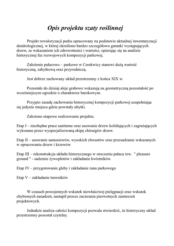 Opis projektu szaty roślinnej Projekt rewaloryzacji parku opracowany na podstawie aktualnej inwentaryzacji dendrologicznej, w której określono bardzo szczegółowo gatunki występujących drzew, ze wskazaniem ich zdrowotności i wartości, opierając się na analizie historycznej faz rozwojowych kompozycji parkowej. Założenie pałacowo – parkowe w Cerekwicy stanowi dużą wartość historyczną, zabytkową oraz przyrodniczą. Jest dobrze zachowany układ przestrzenny z końca XIX w. Pozostałe do dzisiaj aleje grabowe wskazują na geometryczną pozostałość po wcześniejszym ogrodzie o charakterze barokowym. Przyjęto zasadę zachowania historycznej kompozycji parkowej uzupełniając się jedynie miejsca gdzie powstały ubytki. Założono etapowe realizowanie projektu. Etap I – niezbędne prace sanitarne oraz usuwanie drzew kolidujących i zagrażających wykonane przez wyspecjalizowaną ekipę chirurgów drzew. Etap II – usuwanie samosiewów, wysokich chwastów oraz przesadzanie wskazanych w opracowaniu drzew i krzewów Etap III – rekonstrukcja układu historycznego w otoczeniu pałacu tzw. " pleasure ground " - sadzenie żywopłotów i zakładanie kwietników. Etap IV – przygotowanie gleby i zakładanie runa parkowego Etap V – zakładanie trawników W czasach powojennych wskutek niewłaściwej pielęgnacji oraz wskutek chybionych nasadzeń, nastapił proces zacierania pierwotnych zamierzeń projektowych. Jednakże analiza całości kompozycji pozwala stwierdzić, że historyczny układ przestrzenny pozostał czytelny. Dlatego zamierzeniem autorów projektu jest odsłonięcie większych skupin starodrzewia, oczyszczenie wnętrz parkowych tworzących polany, odsłonięcie osi widokowych oraz wprowadzenie parterów roślinnych czyli krzewów oraz runa parkowego. W celu przywrócenia ładu historycznego oraz jego romantycznych walorów należy przesadzić lub usunąć drzewa kolidujące na głownych osiach widokowych. W projekcie zaznaczono w formie wykazu jak i graficznie na planie, które drzewa i krzewy należy przesadzić lub usunąć na wskazane w czasie nadzoru autorskiego miejsce. Przewiduje się likwidacje asfaltowego boiska sportowego, ewentualnie przeniesienie go w mniej eksponowane miejsce. Na trawniku przed pałacem – obwiedzionym żywopłotem z Cisa Taxus Baccata, zaprojektowano duże, regularne, o wydłużonym kształcie kwietniki obsadzone Begonią bulwiastą. Na podstawie przeprowadzonej analizy wiekowej oraz zdjęcia sprzed 8 lat wynika wnioskuje się, iż przed pałacem były symetrycznie posadzone dwa kasztanowce. Nie było w tym fragmencie żadnych nasadzeń innych drzew czy krzewów, które rosną obecnie, a nie mają uzasadnienia historycznego. Proponuje się wykonanie właściwej pielęgnacji stawu parkowego z utrzymaniem wysokiego poziomu wody, z okresowym czyszczeniem i pogłębianiem dna oraz wzmacnianiem brzegów. Wykaz materiału roślinnego Drzewa liściaste: szt. 1. Betula verrucosa – Brzoza brodawkowata 2. Lipa drobnolistna – Tilia cordata 3. Dąb szypułkowy „Fastigata“ – Quercus robur 4. Platan klonolistny – Platanus acerifolia 1 12 16 2 31 Drzewa iglaste 5. Cyprysik błotny – Taxodium distichum 2 Krzewy liściaste Różanecznik "Baden Baden" – Rhododendron "Baden Baden" Hortensja " Pink Diamout" – Hydrangea paniculata Jaśminowiec wonny "Aureus" – Philadelphus coronarius Żylistek szorstki "Plena" – Deutzia scabra "Plena" 25 10. Kalina koralowa – Viburnum opulus "Roseum" 11. Forsycja pośrednia – Forsythia intermedia "Gold Zauber 6. 7. 8. 9. 64 17 10 16 20 152 Żywopłoty 12. Cis pospolity – Taxus baccata (sadzony w dwóch rzędach co 30 cm) 13. Bukszpan wieczniezielony – Buxux sempervirens (sadzony w dwóch rzędach co 20 cm) 285 1610 Rośliny runa A. Bodziszek korzeniasty – Geranium macrorhisum – 9 szt / m2 B. Konwalia majowa – Convallaria majalis – 12 szt / m2 C. Runianka rozesłana – Pachysandra procumbens – 9 szt / m2 D. Bluszcz pospolity – Hedera helix – 9 szt / m2 700 720 540 1440 Rośliny wodne 14. Grzybień biały – Nymphaea alba 10 Rośliny kwietnikowe 15. Begonia bulwiasta odmiana czerwona – Begonia tuberhybryda ( sadzona 0,25 * 0,25 cm ) 792 Nowopowstałe miejsca postojowe dla samochodów należy obsadzić Dębem szypułkowym – Quercus robur "Fastigiata" – 16 szt Proponuje się 1,20 ha trawnika do renowacji.