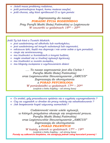 • Jeżeli masz problemy rodzinne, • jeśli potrzebujesz kogoś, komu możesz zaufać, • jeśli chcesz, aby ktoś spróbował Ci w tym pomóc Zapraszamy do naszej PORADNI ŻYCIA RODZINNEGO Przy Parafii Matki Bożej Fatimskiej w Legionowie W czwartki w godzinach 1800 – 2000 Jeśli Ty lub ktoś z Twoich bliskich: • jest uzależniony od alkoholu lub narkotyków, • jest uzależniony od innych substancji lub czynności, • odczuwa lęki, bądź ma depresję i nie umie sobie z tym poradzić, • czuje się zestresowany, • ma trudności w kontaktach z innymi ludźmi, • nagle znalazł się w trudnej sytuacji życiowej, • ma trudności w swoim związku, • ma kłopoty związane z wychowaniem dzieci …. To nasze zaproszenie jest dla Ciebie ! Parafia Matki Bożej Fatimskiej oraz Legionowskie Stowarzyszenie „AMICUS” Zapraszają do skorzystania z PORAD PSYCHOLOGA W poniedziałki w godzinach 1700 – 2000 (wejście z boku kaplicy – od strony lasu) • Co zrobić, gdy pracodawca spóźnia się z wypłatą wynagrodzenia ? • Czy za wypadek w drodze do pracy należy się odszkodowanie ? • Jak bezpiecznie kupić używany samochód ? Codzienność niesie wiele sytuacji, w których przydatna okazuje się znajomość prawa. Parafia Matki Bożej Fatimskiej oraz Legionowskie Stowarzyszenie „AMICUS” Zapraszają do skorzystania z PORAD PRAWNYCH W każdy wtorek w godzinach 1700 – 1900 (wejście z boku kaplicy – od strony lasu) Porady są całkowicie bezpłatne, nie zastępują jednak usług kancelarii prawnej ! Jeżeli Twoje małżeństwo zostało zawarte w sposób nieważny albo po rozpadzie Twojego małżeństwa pozostajesz w związku niesakramentalnym a chcesz żyć w zgodzie z własnym sumieniem i nauką Kościoła Katolickiego. Zapraszamy w środy w godzinach 1700 – 1900 do naszej świetlicy parafialnej. Dowiesz się: • Jakie są podstawy do stwierdzenia nieważności małżeństwa. • Jak wygląda przebieg procesu o stwierdzenie nieważności małżeństwa.Jak należy przygotować i gdzie złożyć skargę powodową. • Na czym polega proces do dyspensy od małżeństwa zawartego a niedopełnionego. • Jakie są przesłanki do unieważnienia małżeństwa cywilnego. • Co to jest pecet ? • Czym różni się HDD od FDD ? • Czy surfowanie po WWW wymaga karty pływackiej ? • Czy należy bać się myszy ? • Dlaczego tacki napędu DVD nie używamy jako podstawki do kawy ? Na te, oraz wiele innych pytań poznasz odpowiedzi w każdą sobotę w godzinach 1000 – 1200 w świetlicy parafialnej. Parafia Matki Bożej Fatimskiej oraz Legionowskie Stowarzyszenie „AMICUS” zapraszają na WARSZTATY KOMPUTEROWE – PODSTAWY OBSŁUGI KOMPUTERA