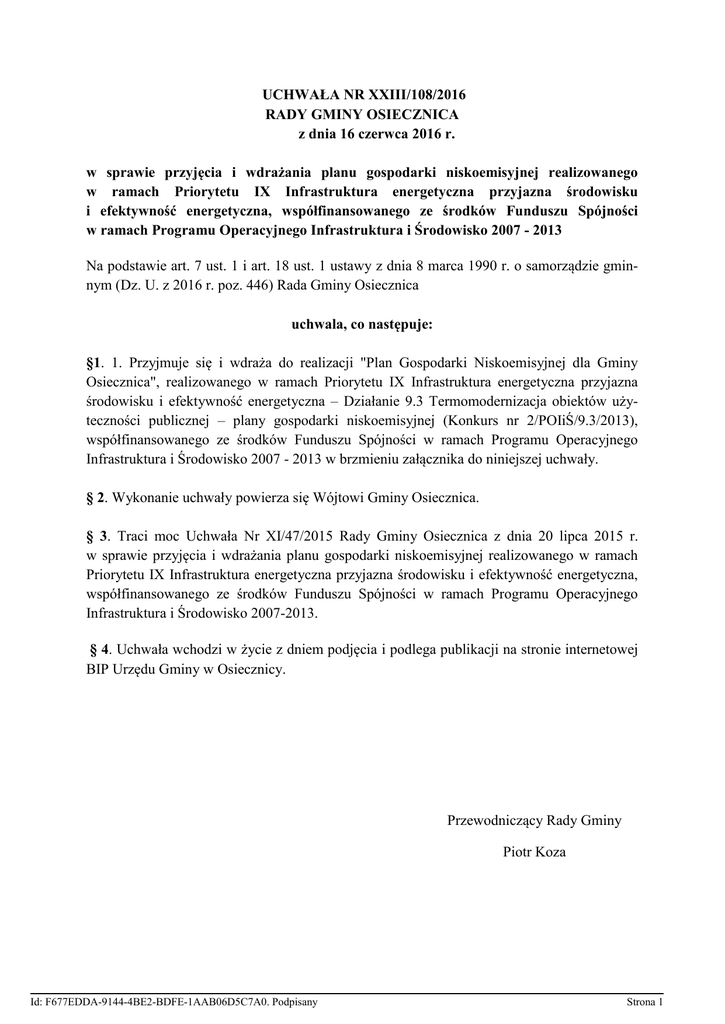 UCHWAŁA NR XXIII/108/2016 RADY GMINY OSIECZNICA z dnia 16 czerwca 2016 r. w sprawie przyjęcia i wdrażania planu gospodarki niskoemisyjnej realizowanego w ramach Priorytetu IX Infrastruktura energetyczna przyjazna środowisku i efektywność energetyczna, współfinansowanego ze środków Funduszu Spójności w ramach Programu Operacyjnego Infrastruktura i Środowisko 2007 - 2013 Na podstawie art. 7 ust. 1 i art. 18 ust. 1 ustawy z dnia 8 marca 1990 r. o samorządzie gminnym (Dz. U. z 2016 r. poz. 446) Rada Gminy Osiecznica uchwala, co następuje: §1. 1. Przyjmuje się i wdraża do realizacji "Plan Gospodarki Niskoemisyjnej dla Gminy Osiecznica", realizowanego w ramach Priorytetu IX Infrastruktura energetyczna przyjazna środowisku i efektywność energetyczna – Działanie 9.3 Termomodernizacja obiektów użyteczności publicznej – plany gospodarki niskoemisyjnej (Konkurs nr 2/POIiŚ/9.3/2013), współfinansowanego ze środków Funduszu Spójności w ramach Programu Operacyjnego Infrastruktura i Środowisko 2007 - 2013 w brzmieniu załącznika do niniejszej uchwały. § 2. Wykonanie uchwały powierza się Wójtowi Gminy Osiecznica. § 3. Traci moc Uchwała Nr XI/47/2015 Rady Gminy Osiecznica z dnia 20 lipca 2015 r. w sprawie przyjęcia i wdrażania planu gospodarki niskoemisyjnej realizowanego w ramach Priorytetu IX Infrastruktura energetyczna przyjazna środowisku i efektywność energetyczna, współfinansowanego ze środków Funduszu Spójności w ramach Programu Operacyjnego Infrastruktura i Środowisko 2007-2013. § 4. Uchwała wchodzi w życie z dniem podjęcia i podlega publikacji na stronie internetowej BIP Urzędu Gminy w Osiecznicy. Przewodniczący Rady Gminy Piotr Koza Id: F677EDDA-9144-4BE2-BDFE-1AAB06D5C7A0. Podpisany Strona 1 UZASADNIENIE Podstawą formalną opracowania Planu Gospodarki Niskoemisyjnej była Uchwała Nr XLIV/232/2013 Rady Gminy Osiecznica z dnia 26 listopada 2013 r. w sprawie wyrażenia woli przystąpienia do opracowania i wdrażania planu gospodarki niskoemisyjnej realizowanego w ramach Priorytetu IX Infrastruktura energetyczna przyjazna środowisku i efektywność energetyczna, współfinansowanego ze środków Funduszu Spójności w ramach Programu Operacyjnego Infrastruktura i Środowisko 2007 - 2013. Plan Gospodarki Niskoemisyjnej to dokument, którego celem jest określenie wizji rozwoju gminy w kierunku gospodarki niskoemisyjnej, pozwalającej osiągnąć długofalowe korzyści środowiskowe, społeczne i ekonomiczne. Kluczowym elementem Planu Gospodarki Niskoemisyjnej jest wyznaczenie celów strategicznych i szczegółowych, realizujących określoną wizję gminy w zakresie zwiększenia efektywności energetycznej, zmniejszenia emisji gazów cieplarnianych oraz wdrożenia nowych technologii zgodnie z zasadą zrównoważonego rozwoju. Konieczność opracowania Planu Gospodarki Niskoemisyjnej wiązała się z ratyfikowanym przez Polskę Protokołem z Kioto oraz przyjętym przez Komisję Europejską w grudniu 2008 roku pakietem klimatyczno - energetycznym, które skutkują szeregiem obowiązków, w tym w szczególności koniecznością redukcji emisji gazów cieplarnianych i zużycia energii, a także zwiększenia udziału wykorzystania energii z odnawialnych źródeł. Opracowanie planu wynika także z założeń Narodowego Programu Rozwoju Gospodarki Niskoemisyjnej, przyjętego przez Radę Ministrów 16 sierpnia 2011 r. Zmiana treści i zakresu zatwierdzanego Planu Gospodarki Niskoemisyjnej wynika z załącznika nr 9 Regulaminu Konkursu nr 2/POIiŚ/9.3/2013, Program Operacyjny Infrastruktura i Środowisko 2007 - 2013 – Szczegółowe zalecenia dotyczące struktury planu gospodarki niskoemisyjnej opracowanego przez Narodowy Fundusz Ochrony Środowiska i Gospodarki Wodnej oraz nowymi wymogami Narodowego Funduszu Ochrony Środowiska i Gospodarki Wodnej. W ostatecznej wersji Planu Gospodarki Niskoemisyjnej, zgodnie z wymogami Narodowego Funduszu Ochrony Środowiska i Gospodarki Wodnej, zmieniono rok bazowy z 1990 - obecnie nazwany rokiem historycznym - na rok danych rzeczywistych, tj. na rok 2014. Pierwotny rok bazowy 1990 był trudny dla ustalenia poziomów zużycia energii i wielkości emisji z sektorów, przede wszystkim w sektorze transportu, energii oraz w produkcji i usługach. Ostateczna wersja Planu Gospodarki Niskoemisyjnej uwzględnia dodatkowo: dynamikę zmian prawnych i formalnych w okresie ostatniego roku (między innymi w obszarze funduszy zewnętrznych np. pojawienie się Programu RYŚ, uszczegółowienie RPO WD i POIiŚ), zmienia część zapisów oraz unieważnia wszystkie dodatki do Planu Gospodarki Niskoemisyjnej zatwierdzonego Uchwałą Nr XI/47/2015 Rady Gminy Osiecznica z dnia 20 lipca 2015 r. i jednocześnie dołącza nowe Załączniki: - Załącznik A pt. „Bazowa - wyjściowa inwentaryzacja emisji” opracowany zgodnie z wytycznymi poradnika SEAP, - Załącznik B „pt. „Harmonogram działań w ramach PGN. Podmioty odpowiedzialne Koszty, źródła dofinansowania i roczne efekty ekologiczno - energetyczne”. - Załącznik C (oraz C.1 ÷ C.3) Wzór „Zbiorczej tabeli monitorowania PGN”, wraz z przykładem „Kart zadań” - Załącznik D. Rodzaje zobowiązań z sektora ochrony powietrza wynikające z POP dla strefy dolnośląskiej. W ostatecznej wersji Planu Gospodarki Niskoemisyjnej zredukowano zapisy o charakterze teoretycznym np. w działach: energia elektryczna, finansowanie oraz uzupełniono opisem innych sektorów i identyfikacją obszarów problemowych. W związku z powyższym podjęcie powyższej uchwały jest uzasadnione. Skutkiem finansowym jest otrzymanie dofinansowania na opracowanie programu: Plan Gospodarki Niskoemisyjnej dla Gminy Osiecznica w kwocie: 23 523, 75 złotych. Id: F677EDDA-9144-4BE2-BDFE-1AAB06D5C7A0. Podpisany Strona 2 Id: F677EDDA-9144-4BE2-BDFE-1AAB06D5C7A0. Podpisany Strona 3 INVESTMENT MANAGEMENT ENVIRONMENT CONSULTING ul. Warsztatowa 47 55-010 Biestrzyków e-mail: [email protected] P