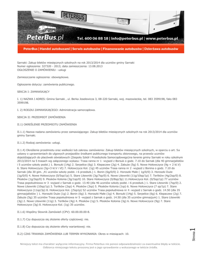 Sarnaki: Zakup biletów miesięcznych szkolnych na rok 2013/2014 dla uczniów gminy Sarnaki Numer ogłoszenia: 327320 - 2013; data zamieszczenia: 13.08.2013 OGŁOSZENIE O ZAMÓWIENIU - usługi Zamieszczanie ogłoszenia: obowiązkowe. Ogłoszenie dotyczy: zamówienia publicznego. SEKCJA I: ZAMAWIAJĄCY I. 1) NAZWA I ADRES: Gmina Sarnaki , ul. Berka Joselewicza 3, 08-220 Sarnaki, woj. mazowieckie, tel. 083 3599198, faks 083 3599198. I. 2) RODZAJ ZAMAWIAJĄCEGO: Administracja samorządowa. SEKCJA II: PRZEDMIOT ZAMÓWIENIA II.1) OKREŚLENIE PRZEDMIOTU ZAMÓWIENIA II.1.1) Nazwa nadana zamówieniu przez zamawiającego: Zakup biletów miesięcznych szkolnych na rok 2013/2014 dla uczniów gminy Sarnaki. II.1.2) Rodzaj zamówienia: usługi. II.1.4) Określenie przedmiotu oraz wielkości lub zakresu zamówienia: Zakup biletów miesięcznych szkolnych, w oparciu o art. 5a ustawy o uprawnieniach do ulgowych przejazdów środkami publicznego transportu zbiorowego, na przewóz uczniów dojeżdżających do placówek oświatowych (Zespołu Szkół i Przedszkola Samorządowego)na terenie gminy Sarnaki w roku szkolnym 2013/2014 na 5 trasach wg załączonego wykazu: Trasa ranna nr 1 -wyjazd z Borsuk o godz. 7.10 do Sarnak (dla 40 gimnazjalistów i 5 uczniów szkoły podst.) 1. Borsuki (14g) 2. Serpelice (6g) 3. Klepaczew (2g) 4. Zabuże (5g) 5. Nowe Hołowczyce (9g + 2 kl.V) 6. Stare Hołowczyce (3g+3 kl.V i VI) 7. Hołowczyce Kol. (1g) 45 uczniów Trasa ranna nr 2 -wyjazd z Bonina o godz. 7.10 do Sarnak (dla 30 gim. ,41 uczniów szkoły podst. i 6 przedszk.) 1. Bonin (6g/0/0) 2. Horoszki Małe ( 1g/0/0) 3. Horoszki Duże (1g/0/0) 4. Nowe Hołowczyce (0/5sp/1p) 5. Stare Litewniki (3g/7sp/0) 6. Nowe Litewniki (11g/10sp/1p) 7. Terlików (4g/2sp/0) 8. Płosków (1g/3sp/0) 9. Płosków Kolonia (3g/1sp/0) 10. Stare Hołowczyce (0/8sp/3p) 11.Hołowczyce Kol. (0/5sp/1p) 77 uczniów Trasa popołudniowa nr 3 -wyjazd z Sarnak o godz. 13.40 (dla 46 uczniów szkoły podst. i 6 przedszk.) 1. Stare Litewniki (7sp/0) 2. Nowe Litewniki (10sp/1p) 3. Terlików (2sp) 4. Płosków (3sp) 5. Płosków Kolonia (1sp) 6. Nowe Hołowczyce (7 sp/1p) 7. Stare Hołowczyce (11sp/3p) 8. Hołowczyce Kol. (/5sp1p) 52 uczniów Trasa popołudniowa nr 4 -wyjazd z Sarnak o godz. 14.50 (dla 35 gimnazjalistów ) 1. Horoszki Duże (1g) 2. Bonin (6g) 3. Horoszki Małe (1g) 4. Borsuki (14g) 5. Serpelice (6g) 6. Klepaczew (2g) 7. Zabuże (5g) 35 uczniów Trasa popołudniowa nr 5 -wyjazd z Sarnak o godz. 14.50 (dla 35 uczniów gimnazjum) 1. Stare Litewniki (3g) 2. Nowe Litewniki (11g) 3. Terlików (4g) 4. Płosków (1g) 5. Płosków Kolonia (3g) 6. Nowe Hołowczyce (9g) 7. Stare Hołowczyce (3g) 8. Hołowczyce Kol. (1g) 35 uczniów. II.1.6) Wspólny Słownik Zamówień (CPV): 60.00.00.00-8. II.2) CZAS TRWANIA ZAMÓWIENIA LUB TERMIN WYKONANIA: Okres w miesiącach: 10. Niniejszy tekst ma charakter wyłącznie informacyjny. Firma Peterbus nie ponosi odpowiedzialności za ewentualne błędy w tekście. Odbiorca niniejszego tekstu proszony jest o jego sprawdzenie u wskazanego w tekście źródła. Strona II.1.8) Czy dopuszcza się złożenie oferty wariantowej: nie. 1 II.1.7) Czy dopuszcza się złożenie oferty częściowej: nie. SEKCJA III: INFORMACJE O CHARAKTERZE PRAWNYM, EKONOMICZNYM, FINANSOWYM I TECHNICZNYM III.2) ZALICZKI III.3) WARUNKI UDZIAŁU W POSTĘPOWANIU ORAZ OPIS SPOSOBU DOKONYWANIA OCENY SPEŁNIANIA TYCH WARUNKÓW III. 3.1) Uprawnienia do wykonywania określonej działalności lub czynności, jeżeli przepisy prawa nakładają obowiązek ich posiadania Opis sposobu dokonywania oceny spełniania tego warunku -wykonawca posiada uprawnienia do wykonywania określonej działalności lub czynności, jeżeli ustawy nakładają obowiązek posiadania takich uprawnień- oświadczenie o spełnianiu warunków udziału w postepowaniu; III.3.2) Wiedza i doświadczenie Opis sposobu dokonywania oceny spełniania tego warunku -wykonawca w okresie ostatnich 3 lat zrealizował co najmniej 1 zamówienie tożsame z przedmiotem zamówienia, którego należyte wykonanie potwierdzone zostało referencjami poprzednio zamawiających - załącznik nr 5 do SIWZ; III.3.3) Potencjał techniczny Opis sposobu dokonywania oceny spełniania tego warunku -wykonawca dysponuje potencjałem technicznym lub przedstawia pisemne zobowiązanie innych podmiotów do udostępnienia potencjału technicznego; III.3.4) Osoby zdolne do wykonania zamówienia Opis sposobu dokonywania oceny spełniania tego warunku -wykonawca dysponuje osobami zdolnymi do wykonywania zamówienia lub przedstawia pisemne zobowiązanie innych podmiotów do udostepnienia osób zdolnych do wykonania zamówienia; III.3.5) Sytuacja ekonomiczna i finansowa Opis sposobu dokonywania oceny spełniania tego warunku -wykonawca znajduje się w sytuacji ekonomicznej i finansowej zapewniającej wykonanie zamówienia; III.4) INFORMACJA O OŚWIADCZENIACH LUB DOKUMENTACH, JAKIE MAJĄ DOSTARCZYĆ WYKONAWCY W CELU POTWIERDZENIA SPEŁNIANIA WARUNKÓW UDZIAŁU W POSTĘPOWANIU ORAZ NIEPODLEGANIA WYKLUCZENIU NA PODSTAWIE ART. 24 UST. 1 USTAWY Niniejszy tekst ma charakter wyłącznie informacyjny. Firma Peterbus nie ponosi odpowiedzialności za ewentualne błędy w tekście. Odbiorca niniejszego tekstu proszony jest o jego sprawdzenie u wskazanego w tekście źródła. Strona III.4.2) W zakresie potwierdzenia niepodlegania wykluczeniu na podstawie art. 24 ust. 1 ustawy, należy przedłożyć: oświadczenie o braku podstaw do wykluczenia; aktualny odpis z właściwego rejestru lub z centralnej ewidencji i informacji o działalności gospodarczej, jeżeli odrębne przepisy wymagają wpisu do rejestru lub ewidencji, w celu wykazania braku podstaw do wykluczenia w oparciu o art. 24 ust. 1 pkt 2 ustawy, wystawiony nie wcześniej niż 6 miesięcy przed upływem terminu składania wniosków o dopuszczenie do udziału w 2 III.4.1) W zakresie wykazania spełniania przez wykonawcę warunków, o których mowa w art. 22 ust. 1 ustawy, opró