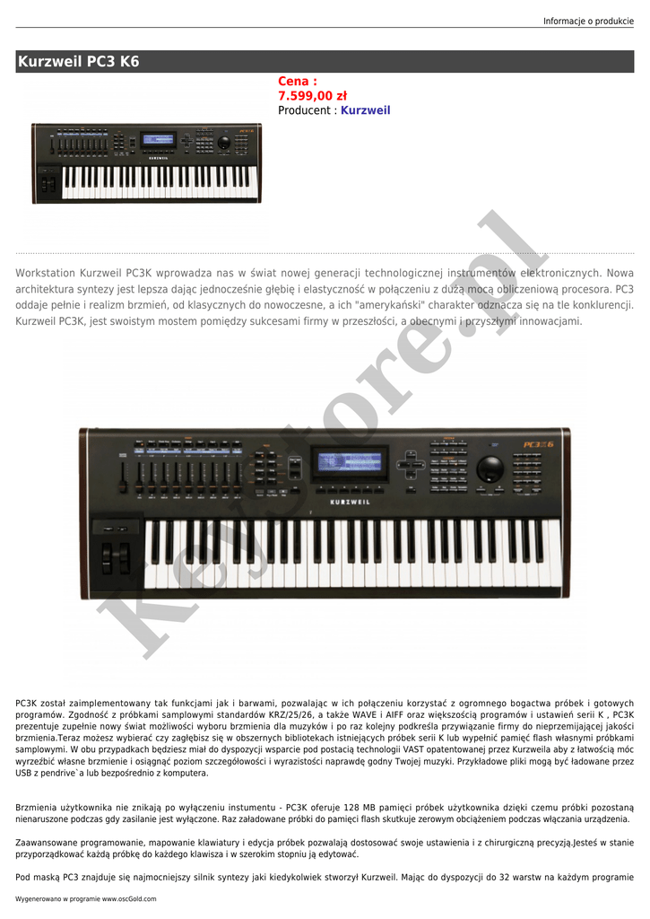 Informacje o produkcie Kurzweil PC3 K6 Cena : 7.599,00 zł or e. pl Producent : Kurzweil K ey St Workstation Kurzweil PC3K wprowadza nas w świat nowej generacji technologicznej instrumentów elektronicznych. Nowa architektura syntezy jest lepsza dając jednocześnie głębię i elastyczność w połączeniu z dużą mocą obliczeniową procesora. PC3 oddaje pełnie i realizm brzmień, od klasycznych do nowoczesne, a ich "amerykański" charakter odznacza się na tle konklurencji. Kurzweil PC3K, jest swoistym mostem pomiędzy sukcesami firmy w przeszłości, a obecnymi i przyszłymi innowacjami. PC3K został zaimplementowany tak funkcjami jak i barwami, pozwalając w ich połączeniu korzystać z ogromnego bogactwa próbek i gotowych programów. Zgodność z próbkami samplowymi standardów KRZ/25/26, a także WAVE i AIFF oraz większością programów i ustawień serii K , PC3K prezentuje zupełnie nowy świat możliwości wyboru brzmienia dla muzyków i po raz kolejny podkreśla przywiązanie firmy do nieprzemijającej jakości brzmienia.Teraz możesz wybierać czy zagłębisz się w obszernych bibliotekach istniejących próbek serii K lub wypełnić pamięć flash własnymi próbkami samplowymi. W obu przypadkach będziesz miał do dyspozycji wsparcie pod postacią technologii VAST opatentowanej przez Kurzweila aby z łatwością móc wyrzeźbić własne brzmienie i osiągnąć poziom szczegółowości i wyrazistości naprawdę godny Twojej muzyki. Przykładowe pliki mogą być ładowane przez USB z pendrive`a lub bezpośrednio z komputera. Brzmienia użytkownika nie znikają po wyłączeniu instumentu - PC3K oferuje 128 MB pamięci próbek użytkownika dzięki czemu próbki pozostaną nienaruszone podczas gdy zasilanie jest wyłączone. Raz załadowane próbki do pamięci flash skutkuje zerowym obciążeniem podczas włączania urządzenia. Zaawansowane programowanie, mapowanie klawiatury i edycja próbek pozwalają dostosować swoje ustawienia i z chirurgiczną precyzją.Jesteś w stanie przyporządkować każdą próbkę do każdego klawisza i w szerokim stopniu ją edytować. Pod maską PC3 znajduje się najmocniejszy silnik syntezy jaki kiedykolwiek stworzył Kurzweil. Mając do dyspozycji do 32 warstw na każdym programie Wygenerowano w programie www.oscGold.com emulujemy instrumenty bardzo szczegółowe i dokładne, a uzyskiwane brzmienia mogą być nadzwyczaj szerokie i złożone. Rozwijając technologię V.A.S.T. Kurzweil zapewnia większą moc i elastyczność w połączeniu z niespotykaną łatwością użycia. Użytkownicy mogą teraz tworzyć i zapisywać własne algorytmy DSP, z niemal nieograniczonymi możliwościami routingu. Kolejnym wielkim krokiem jest wskrzeszenie VA-1 - wirtualny syntezatora analogowego. Słuchając VA-1 odczuwamy moc kształtowania i wygładzania brzmienia poprzez oscylatory ( włączając w to supersaw i triplesaw i hard sync) w połączeniu z wyżej opisywaną V.A.S.T. Podsumowując kwestię walorów brzmieniowych: czy nastawisz się na słynne brzmienie fortepianu Kurzweila, czy na szeroki wachlarz precyzyjnie spróbkowanych pian elektrycznych, czy na tryb KB3, czy na analogowy tryb VA czy na setki światowej klasy brzmień orkiestrowych i programów sekcji smyczkowych zawsze PC3K zapewni ponad 900 presetów, które pozwolą Ci wiedzieć, że Kurzweil robi wszystko i robi to dobrze. Zapisywanie, ładowanie i uaktualnianie systemu operacyjnego wykonywane jest w łatwy sposób przez złącze USB . Możesz zapisać programy użytkownika, ustawienia i utwory na pendrive lub bezpośrednio do komputera. Również próbki i aktualizacje systemowe mogą być ładowane z pendive`a lub bezpośrednio z komputera, no i oczywiście PC3K wysyła i odbiera MIDI przez USB. or e. pl W nawiązaniu do konstrukcji klasycznych syntezatorów i instrumentów klawiszowych z lat ubiegłych, PC3K, został wyposażony w drewniane elementy wykończenia, dodając kroplę luksusu i wyrafinowania, która doskonale uzupełnia niesamowitą technologię w sercu każdego instrumentu firmy Kurzweil. Podstawowe dane techniczne: ● ● ● ● ● ● ● ● ● ● ● ● ● ● ● ● ● ● ● ● ● ● St ● Klawiatura syntezatorowa 61 klawiszy, lekko doważana, mechanizm Fatar TP9 Wyświetlacz LCD 240 x 64 znaków, podświetlany, z regulacją jasności i kontrastu Polifonia 128 głosów dynamicznie alokowana Multitimbral 16 partowy Architektura Dynamic VAST z nowym bardzo wydajny modułem syntezy, moc obliczeniowa DSP większa niż w modelach serii K2600, przetwarzanie programowane przez użytkownika w zakresie algorytmów i przekierowania sygnałów, Wbudowany moduł syntezy legendarnego syntezatora analogowego Kurzweila VA1. Tryb Cascade pozwala na przekierowanie danej warstwy i przetworzenie przez DSP na innej w obrębie danego programu Wbudowana pamięć na sample użytkownika 128MB z przechowaniem zawartości po wyłączeniu urządzenia Możliwość wgrywania sampli WAV, AIFF, KRZ/25/26 przez USB, możliwość wgrania ustawień użytkownika Song i Setup z większości modeli z serii K, Ponad 850 brzmień fabrycznych w tym brzmienia zawierające od 10-20 warstw, brzmienia z PC2 Base Sound ROM, Orchestral, Classic Keys, General MIDI, String Section ROM Bank, 64 programy KB3 z trybem drawbar + nowe opracowane dla PC3K. 128 programowanych presetów fabrycznych MIDI, 2048 użytkownika każdy z 16 niezależnymi strefami, efektami i ustawieniami arpeggiatora. Kompatybilność z General MIDI, Pamięć na 2048 ustawień Program Song i Setup 1 slot na rozszerzenia. Sekwenser z nielimitowaną ilością ścieżek przy imporcie, rozdzielczość sekwensera 960 PPQ, Ponad 500 efektów w 16 insertach z przekierowaniem na 11 szyn BUS oraz dodatkowe 2 wysyłki AUX, pokładowe efekty typu reverb, delay, choru, flange, phaser, EQs, distortion, Leslie simulator, compressor i inne, Equalizacja master EQ i master compresor do szybkiej regulacji w trakcie grania. Kontrolery Pitch, Mod
