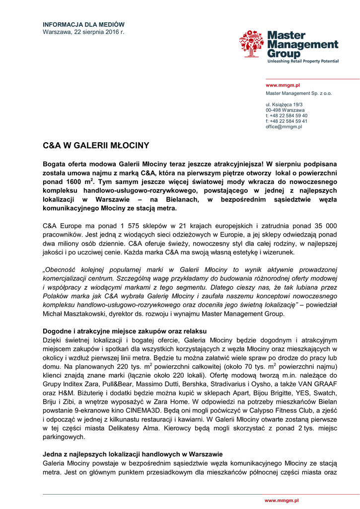 INFORMACJA DLA MEDIÓW Warszawa, 22 sierpnia 2016 r. www.mmgm.pl Master Management Sp. z o.o. ul. Książęca 19/3 00-498 Warszawa t: +48 22 584 59 40 f: +48 22 584 59 41 [email protected] C&A W GALERII MŁOCINY Bogata oferta modowa Galerii Młociny teraz jeszcze atrakcyjniejsza! W sierpniu podpisana została umowa najmu z marką C&A, która na pierwszym piętrze otworzy lokal o powierzchni ponad 1600 m2. Tym samym jeszcze więcej światowej mody wkracza do nowoczesnego kompleksu handlowo-usługowo-rozrywkowego, powstającego w jednej z najlepszych lokalizacji w Warszawie – na Bielanach, w bezpośrednim sąsiedztwie węzła komunikacyjnego Młociny ze stacją metra. C&A Europe ma ponad 1 575 sklepów w 21 krajach europejskich i zatrudnia ponad 35 000 pracowników. Jest jedną z wiodących sieci odzieżowych w Europie, a jej sklepy odwiedzają ponad dwa miliony osób dziennie. C&A oferuje świeży, nowoczesny styl dla całej rodziny, w najlepszej jakości i po uczciwej cenie. Każda marka C&A ma swoją własną estetykę i wizerunek. „Obecność kolejnej popularnej marki w Galerii Młociny to wynik aktywnie prowadzonej komercjalizacji centrum. Szczególną wagę przykładamy do budowania różnorodnej oferty modowej i współpracy z wiodącymi markami z tego segmentu. Dlatego cieszy nas, że tak lubiana przez Polaków marka jak C&A wybrała Galerię Młociny i zaufała naszemu konceptowi nowoczesnego kompleksu handlowo-usługowo-rozrywkowego oraz doceniła jego świetną lokalizację” – powiedział Michał Masztakowski, dyrektor ds. rozwoju i wynajmu Master Management Group. Dogodne i atrakcyjne miejsce zakupów oraz relaksu Dzięki świetnej lokalizacji i bogatej ofercie, Galeria Młociny będzie dogodnym i atrakcyjnym miejscem zakupów i spotkań dla wszystkich korzystających z węzła Młociny oraz mieszkających w okolicy i wzdłuż pierwszej linii metra. Będzie tu można załatwić wiele spraw po drodze do pracy lub domu. Na planowanych 220 tys. m2 powierzchni całkowitej (około 70 tys. m2 powierzchni najmu) klienci znajdą znane marki (łącznie około 220 lokali). Ofertę modową tworzą m.in. należące do Grupy Inditex Zara, Pull&Bear, Massimo Dutti, Bershka, Stradivarius i Oysho, a także VAN GRAAF oraz H&M. Biżuterię i dodatki będzie można kupić w sklepach Apart, Bijou Brigitte, YES, Swatch, Briju i Zibi, a wnętrze wyposażyć w Zara Home. W odpowiedzi na potrzeby mieszkańców Bielan powstanie 9-ekranowe kino CINEMA3D. Będą oni mogli poćwiczyć w Calypso Fitness Club, a zjeść i odpocząć w jednej z kilkunastu restauracji i kawiarni. W Galerii Młociny otwarte zostaną pierwsze w tej części miasta Delikatesy Alma. Kierowcy będą mogli skorzystać z ponad 2 tys. miejsc parkingowych. Jedna z najlepszych lokalizacji handlowych w Warszawie Galeria Młociny powstaje w bezpośrednim sąsiedztwie węzła komunikacyjnego Młociny ze stacją metra. Jest on głównym punktem przesiadkowym dla mieszkańców północnej części miasta oraz www.mmgm.pl www.mmgm.pl okolicznych miejscowości – codziennie korzysta z niego około 40 tys. osób z Bielan, Żoliborza, Bemowa, Łomianek i Białołęki. Węzeł Młociny to 22 linie autobusowe, cztery tramwajowe, stacja metra, przystanek Polskibus.com, bezpośrednie połączenie autobusowe z lotniskiem Warszawa/Modlin i parking P+R dla ponad 1 tys. samochodów. Galeria Młociny zostanie wybudowana na 5-hektarowej działce zlokalizowanej pomiędzy ulicą Zgrupowania AK „Kampinos” a Trasą Mostu Marii Skłodowskiej-Curie. W pobliżu centrum znajduje się też węzeł drogowy łączący centrum Warszawy, Łomianki i Chomiczówkę z Tarchominem oraz Białołęką. Północ Warszawy to także rejon, gdzie intensywnie rozwija się budownictwo mieszkaniowe, co oznacza, że grono potencjalnych klientów Galerii Młociny, szczególnie osób młodych, będzie się stale powiększało. Wyjątkowy projekt Galerię Młociny wyróżnia także wyjątkowy projekt architektoniczny, który powstał w dwóch renomowanych pracowniach architektonicznych – Autorskiej Pracowni Architektury Kuryłowicz & Associates oraz Chapman Taylor. Będzie to jeden z najatrakcyjniejszych wizualnie punktów północnej Warszawy. Projekt Galerii Młociny jest także zgodny z zasadami zrównoważonego rozwoju, co potwierdza certyfikat BREEAM. Dwupiętrowy kompleks z czterema kondygnacjami handlowo-usługowymi został zaprojektowany tak, aby korzystać z walorów lokalizacji, w której będzie wybudowany. Dlatego w ramach inwestycji powstanie ogólnodostępna przestrzeń rekreacyjna z widokiem na Las Młociński. Latem będzie to strefa relaksu z ogródkami restauracyjnymi i infrastrukturą zachęcającą do uprawiania sportu (boiska, ścieżki do biegania), a zimą miejsce na pierwsze w Warszawie lodowisko na dachu. Master Management Group (MMG) jest inwestorem, deweloperem, agentem wynajmującym oraz zarządcą nieruchomości handlowych i biurowych zlokalizowanych w całej Polsce. Firma posiada wieloletnie doświadczenie na rynku (w tym roku obchodzi dziesięciolecie działalności) oraz zespół ekspertów, którzy pracowali dla międzynarodowych firm deweloperskich, doradczych oraz zarządzających nieruchomościami, a także funduszy inwestycyjnych. Dzięki temu MMG z powodzeniem samodzielnie realizuje projekty oraz współpracuje z czołowymi deweloperami i inwestorami. Firma jest partnerem na polskim rynku dla największych światowych funduszy oraz innych instytucji inwestujących w nieruchomości, takich jak: Blackstone, Marcol Group, Europa Capital czy CPI. Na zlecenie tych podmiotów, MMG zajmuje się wyszukiwaniem atrakcyjnych możliwości inwestycyjnych na lokalnym rynku nieruchomości handlowych. Oferuje też stałe wsparcie w zakresie zarządzania aktywami oraz nieruchomościami po ich zakupie aż do momentu sprzedaży. Obecnie MMG zarządza ponad 75 tys. m 2 powierzchni handlowej, w tym: Bramą Mazur w Ełku, Galerią Niwa w Oświęcimiu, G