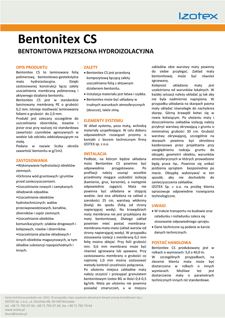 Izotex Bentonitex CS BENTONITOWA PRZESŁONA HYDROIZOLACYJNA OPIS PRODUKTU ZALETY Bentonitex CS to laminowana folią polimerową bentonitowo-geotekstylna mata hydroizolacyjna. Dzięki zastosowanej konstrukcji łączy zalety uszczelnienia membraną polimerową i aktywnego działania bentonitu. Bentonitex CS jest w standardzie laminowany membraną PE o grubości 0,2 mm. Istnieje możliwość laminowania foliami o grubości do 2,0 mm. Produkt jest zalecany szczególnie do uszczelniania zbiorników, stawów i jezior oraz przy wyższej niż standardowa zawartości czynników agresywnych w wodzie lub odcieku oddziaływującym na matę. Podana w nazwie liczba określa zawartość bentonitu w g/1m2. Bentonitex CS jest przesłoną kompozytową łączącą zalety uszczelniania folią z aktywnym działaniem bentonitu. Instalacja materiału jest łatwa i szybka. Bentonitex może być układany w trudnych warunkach atmosferycznych (deszcze), także zimą. ZASTOSOWANIA Podłoże, na którym będzie układana mata Bentonitex CS powinno być odpowiednio przygotowane. Po profilacji należy usunąć wszelkie przedmioty mogące uszkodzić izolację (kamienie, gruz, korzenie), a następnie odpowiednio zagęścić. Mata nie powinna być układana w stojącej wodzie. Jest ona układana na zakład o szerokości 25 cm, warstwą włókniny (białą) do spodu (folią od strony napierającej wody). Na krawędziach maty membrana nie jest przyklejona do maty bentonitowej. Dlatego zakład powinien mieć postać membranamembrana-mata-mata (układ warstw od strony napierającej wody). W przypadku stosowania izolacji z membraną 0,2 mm folię można sklejać. Przy folii grubości min. 0,6 mm membrana może być również zgrzewana lub spawana. Przy zastosowaniu membrany o grubości co najmniej 1,0 mm można zastosować metody kontroli szczelności połączenia. Po ułożeniu miejsca zakładów maty należy oczyścić i przesypać granulatem bentonitowym Izotex BG w ilości 0,4-0,5 kg/mb. Mata po ułożeniu nie powinna posiadać zmarszczeń, a w miejscu •Wykonywanie hydroizolacji obiektów ziemnych. •Ochrona wód gruntowych i gruntów przed zanieczyszczeniami. •Uszczelnianie nowych i zamykanych składowisk odpadów. •Uszczelnianie obiektów hydrotechnicznych: wałów przeciwpowodziowych, kanałów, zbiorników i zapór ziemnych. •Uszczelnianie obiektów komunikacyjnych: szlaków drogowych i kolejowych, rowów i zbiorników. •Uszczelnianie placów składowych i innych obiektów magazynowych, w tym składów substancji ropopochodnych i innych. ELEMENTY SYSTEMU W skład systemu, poza matą, wchodzą materiały uzupełniające. W celu doboru odpowiednich rozwiązań prosimy o kontakt z biurem technicznym firmy IZOTEX sp. z o.o. INSTALACJA Karta techniczna produktu ver. 0412. W przypadku chęci uzyskania aktualnych danych proszę kontaktować się z: IZOTEX Sp. z o.o., ul. Strońska 6B, 50-540 Wrocław Karta tel. +48 71 795-07-26, +48 71 795-07-46, fax. +48 71 792-79-64 www.izotex.pl [email protected] zakładów obie warstwy maty powinny do siebie przylegać. Zakład maty bentonitowej może być również zgrzewany. Kolejność układania maty jest uzależniona od warunków lokalnych. W każdej sytuacji należy układać ją tak aby nie była nadmiernie naprężona. W przypadku układania na skarpach pasma maty układać równolegle do nachylenia skarpy. Górną krawędź kotwi się w rowie kotwiącym. Po ułożeniu maty i doszczelnieniu zakładów izolację należy przykryć warstwą okrywającą z gruntu o minimalnej grubości 30 cm. Grubość warstwy okrywającej, szczególnie na skarpach powinna być określona każdorazowo przez projektanta przy uwzględnieniu rodzaju gruntu do obsypki, geometrii obiektu, warunków atmosferycznych w których prowadzone będą prace itp.. Powinno się unikać jeżdżenia sprzętem bezpośrednio po macie. Obsypkę wykonywać w ten sposób, aby nie dochodziło do zanieczyszczenia zakładów. IZOTEX Sp. z o.o. na prośbę klienta opracowuje odpowiednie rozwiązania technologiczne. UWAGI W trakcie transportu na budowie oraz załadunku i rozładunku zaleca się stosowanie odpowiedniego sprzętu. Dane techniczne są podane w karcie danych technicznych. POSTAĆ HANDLOWA Bentonitex CS produkowany jest w rolkach o wymiarach: 5,0 x 40,0 m. W szczególnych przypadkach, na zlecenie klienta mata może być dostarczona w rolkach o innych wymiarach. Możliwe też jest dostarczenie maty o parametrach technicznych innych niż standardowe. Izotex MAGAZYNOWANIE Zaleca się układanie rolek na wyrównanym podłożu. Możliwe jest układanie rolek warstwami, przy czym ilość warstw nie powinna być większa niż 5. Materiał należy chronić przed deszczem. CERTYFIKATY Certyfikat 1023-CPD-0295 F/b, produkt oznaczony znakiem CE. GWARANCJA Produkty IZOTEX sp. z o.o. produkowane są z najlepszych, dostępnych surowców z wykorzystaniem nowoczesnych technologii produkcji, co zapewnia ich wysoką jakość. W trakcie instalacji należy przestrzegać wymogów producenta, gdyż firma nie ponosi odpowiedzialności za usterki wynikające z błędnego zastosowania lub przechowywania. Gwarancja dotyczy jakości produktu. Nie dotyczy zastosowań poza kontrolą producenta. W przypadku zastosowań do celów innych niż określone w materiałach producenta, firma nie ponosi odpowiedzialności. Wartość gwarancji nie może przewyższać wartości nabytych materiałów. Karta techniczna produktu ver. 0412. W przypadku chęci uzyskania aktualnych danych proszę kontaktować się z: IZOTEX Sp. z o.o., ul. Strońska 6B, 50-540 Wrocław Karta tel. +48 71 795-07-26, +48 71 795-07-46, fax. +48 71 792-79-64 www.izotex.pl [email protected]