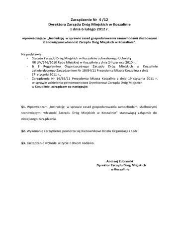 Zarządzenie Nr 4 /12 Dyrektora Zarządu Dróg Miejskich w Koszalinie z dnia 6 lutego 2012 r. wprowadzające „Instrukcję w sprawie zasad gospodarowania samochodami służbowymi stanowiącymi własność Zarządu Dróg Miejskich w Koszalinie”. Na podstawie: - Statutu Zarządu Dróg Miejskich w Koszalinie uchwalonego Uchwałą NR LIV/646/2010 Rady Miejskiej w Koszalinie z dnia 24 czerwca 2010 r., - § 8 Regulaminu Organizacyjnego Zarządu Dróg Miejskich w Koszalinie zatwierdzonego Zarządzeniem Nr 19/84/11 Prezydenta Miasta Koszalina z dnia 27 stycznia 2011 r., - Zarządzenia Nr 16/65/11 Prezydenta Miasta Koszalina z dnia 19 stycznia 2011 r. w sprawie udzielenia pełnomocnictwa Dyrektorowi Zarządu Dróg Miejskich w Koszalinie, zarządzam co następuje: §1. Wprowadzam „Instrukcję w sprawie zasad gospodarowania samochodami służbowymi stanowiącymi własność Zarządu Dróg Miejskich w Koszalinie” stanowiącą załącznik do niniejszego zarządzenia. §2. Wykonanie zarządzenia powierza się Kierownikowi Działu Organizacji i Kadr. §3. Zarządzenie wchodzi w życie z dniem nadania. Andrzej Zubrzycki Dyrektor Zarządu Dróg Miejskich w Koszalinie Załącznik do Zarządzenia Nr 4 /12 Dyrektora Zarządu Dróg Miejskich w Koszalinie z dnia 06.02.2012 r. Instrukcja w sprawie zasad gospodarowania samochodami służbowymi stanowiącymi własność Zarządu Dróg Miejskich w Koszalinie Rozdział I Zasady korzystania z samochodu służbowego przez pracowników Zarządu Dróg Miejskich w Koszalinie 1. Samochody służbowe używane są przez pracowników Zarządu Dróg Miejskich w Koszalinie wyłącznie w celach służbowych związanych z realizacją zadań statutowych Zarządu. 2. Kierować samochodem służbowym mogą tylko pracownicy posiadający upoważnienie do prowadzenia samochodu służbowego, wydane przez Dyrektora, którego wzór stanowi załącznik nr 1 do niniejszej instrukcji oraz ważne zaświadczenie lekarskie wydane przez lekarza medycyny pracy stwierdzające brak przeciwwskazań do kierowania samochodem. 3. Kierownik Działu Organizacji i Kadr prowadzi rejestr w/w upoważnień, wzór rejestru stanowi załącznik nr 2 do niniejszej instrukcji. 4. Pracownicy korzystający z samochodów zobligowani są do kierowania się zasadą celowości i oszczędności. 5. W przypadku potrzeby skorzystania z samochodu służbowego pracownicy składają ustne zamówienie u kierowcy. 6. Samochodem służbowym można się poruszać po obszarze terytorialnie związanym z realizacją zadań statutowych Zarządu bez konieczności wystawiania delegacji służbowej. 7. W przypadku wyjazdu służbowego poza obszar, o którym mowa w pkt 6, Kierownik Działu Organizacji i Kadr wystawia delegację dla pracownika oraz kierowcy, którą zatwierdza Dyrektor . 8. W przypadku nieobecności pracownika odpowiedzialnego za dany samochód służbowy, Dyrektor może na czas tej nieobecności upoważnić innego pracownika do kierowania pojazdem. 9. Po zakończeniu pracy samochody służbowe powinny być przechowywane w garażach. Dla samochodu służbowego dla którego nie przewidziano garażu miejscem postoju po zakończeniu pracy jest plac przed budynkiem Zarządu. 10. Samochody służbowe mogą być także wykorzystywane przez pracowników po zakończeniu pracy Zarządu np. przy usuwaniu awarii oświetlenia drogowego i sygnalizacji drogowej lub w przypadku potrzeby dokonania objazdów zleconych przez dyrektora. Rozdział II Zakres obowiązków i odpowiedzialności pracowników uprawnionych do kierowania samochodem służbowym 1. Uprawnionymi do kierowania samochodami służbowymi są osoby zatrudnione w Zarządzie na stanowiskach kierowców oraz inne osoby upoważnione przez Dyrektora. 2. W przypadku powierzenia samochodu służbowego komórce organizacyjnej, osobą odpowiedzialną za eksploatację samochodu jest kierownik komórki organizacyjnej. 3. Pracownik, któremu powierzono samochód służbowy na stałe lub tylko na określony czas zobowiązany jest do : 1) korzystania z powierzonego samochodu służbowego zgodnie z jego przeznaczeniem; 2) wypełniania zaleceń producenta zawartych w książce pojazdu; 3) dokonywania obowiązkowych okresowych przeglądów technicznych, 4) dbałości o estetykę i czystość powierzonego samochodu, 5) zgłaszania przełożonemu o stwierdzonych usterkach oraz potrzebach dokonania remontu lub naprawy ; 6) postępowania zgodnie z przepisami ruchu drogowego oraz zaleceniami ubezpieczyciela samochodu w przypadku kolizji, wypadku lub innego zdarzenia powodującego uszkodzenie samochodu; 4. Pracownik przejmuje i przekazuje samochód służbowy protokołem zdawczoodbiorczym stanowiącym załącznik nr 3 do niniejszej instrukcji, z zastrzeżeniem pkt 5, oraz podpisuje deklarację odpowiedzialności materialnej , stanowiącą załącznik nr 4 do niniejszej instrukcji, którą dołącza się do jego akt osobowych. Pracownicy, którzy zostali upoważnieni przez Dyrektora do kierowania samochodem służbowym w zastępstwie głównego użytkownika przejmują pełną odpowiedzialność materialną na czas użytkowania pojazdu. Przejmowanie i przekazanie pojazdu między głównym użytkownikiem a użytkownikiem czasowo upoważnionym następuje na podstawie porównania zapisów z kart drogowych z autentycznym stanem pojazdu. Rozdział III Dokumentacja i rozliczenie eksploatacji samochodu służbowego 1. Ewidencjonowanie eksploatacji samochodów dokonywane jest na podstawie prowadzonych dziennych kart drogowych z uwzględnieniem tras przejazdów, ilości zużytego paliwa, ilość zakupionego paliwa oraz ilości przejechanych kilometrów, wzór karty drogowej stanowi załącznik nr 5 do niniejszej instrukcji. 2. Kontroli kart drogowych za dany miesiąc dokonuje pracownik Działu FinansowoKsięgowego. 3. Normy eksploatacyjne zużycia paliwa samochodów służbowych ustalane się na podstawie: 1) normy fabrycznej zużycia paliwa ustalonej przez producenta samochodu i zawartej w instruk