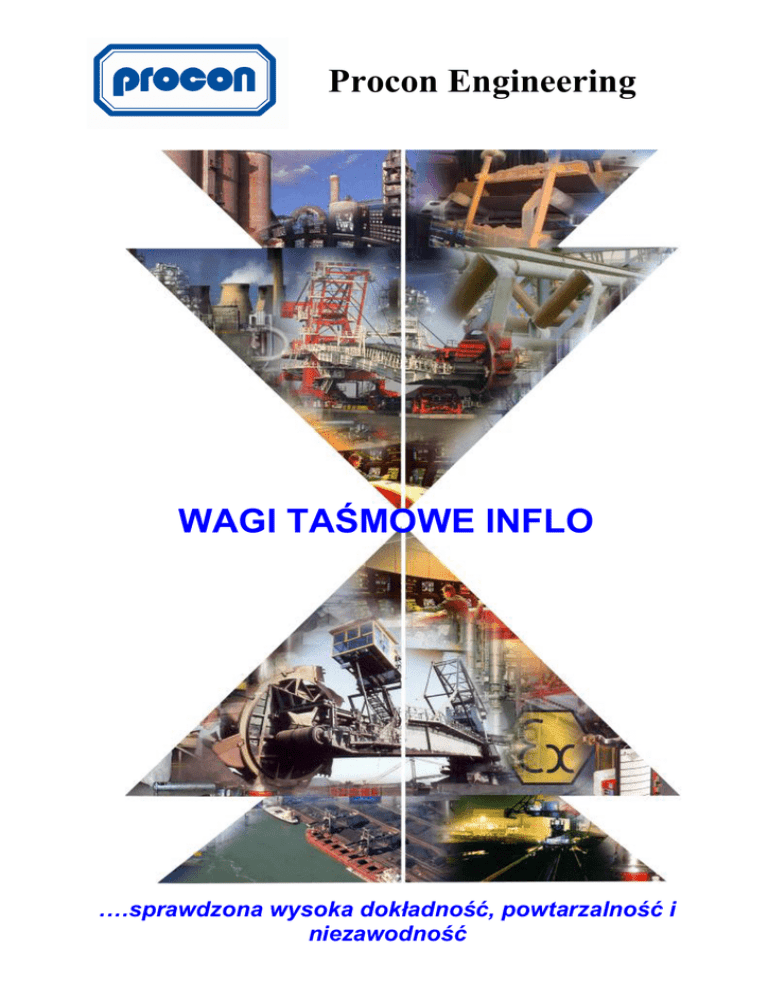 Procon Engineering WAGI TAŚMOWE INFLO .…sprawdzona wysoka dokładność, powtarzalność i niezawodność Nasz rodowód Procon Engineering jest wiodącym producentem i dostawcą rozwiązań pod klucz dla Systemów ważenia i sterowania procesem. Spółka inkorporuje dobrze znane marki jak Defiant, Negretti, Inflo Belt Weighers i Lintvalve Boiler Leak Detection Systems. Jesteśmy firmą certyfikowaną ISO 9001:2008, mamy atesty jakości i ochrony zdrowia oraz atesty bezpieczeństwa od takich prestiżowych instytucji jak Lloyds Register, National Measurement Office & National Britannia, oraz odpowiednie branżowe Passport Schemes. Nasz zestaw umiejętności obejmuje dziedziny: ● Studium Feasibility dla systemów i projektowanie ● Konstrukcje panelowe ● Zarządzanie projektem ● Elektronika cyfrowa i analogowa ● Ocena procesu i optymalizacja systemu ● Aplikacje i oprogramowanie systemowe ● Inżynieria mechaniczna i elektryczna ● Systemy dla środowisk niebezpiecznych ● Serwis i konserwacja systemu Nasze Rezometryczne Wagi Taśmowe mają godną pozazdroszczenia reputację dokładności, powtarzalności, pracując w najtrudniejszych warunkach na całym świecie. Mamy doświadczenie w szerokim spektrum branż, zwłaszcza w górnictwie, kamieniołomach, energetyce jądrowej, produkcji energii elektrycznej, żywności i napojów, w przemyśle farmaceutycznym, chemicznym, inżynierii ogólnej i materiałów budowlanych. Opis Jedna częstotliwość - wszystkie przetworniki siły są cyfrowe Faktycznie nieruchomy system akumulacji siły Elektronika wagowa w najnowszej technologii. EP50 MK11 posiada podświetlany graficzny wyświetlacz tekstowy 114mm x 64mm, który można dostosować do wymagań klienta. Może on pokazywać żywą wagę, przepływ i zsumowane wartości. Podwójne programowalne interfejsy szeregowe zawierają działają w protokóle Modbus; dostępne są również opcjonalnie Ethernet IP i Profibus DP. Korzyści Dowiedziona wysoka dokładność i trwałość ustawień w najmniej sprzyjającym środowisku Potencjalna wydajność przewyższa OIML Klasa 0.25 Wyrób uznany w świecie - szczegóły w naszej obszernej liście referencyjnej. Zminimalizowane straty materiału (ubytki) - patrz tabela niżej W tabeli pokazano roczny koszt ubytków materiału przy niedokładności wagi +0.25%, na bazie 40 godzinnego tygodnia pracy Koszt/tona @50 t/godz @200 t/godz @500 t/godz @1000 t/godz @5000t/godz $20 $5200 $20,800 $52,000 $104,000 $520,000 $40 $10,400 $41,600 $104,000 $208,000 $1,040,000 $60 $15,600 $62,400 $156,000 $312,000 $1,560,000 $80 $20,800 $83,200 $208,000 $416,000 $2,080,000 $100 $26,000 $104,000 $260,000 $520,000 $2,600,000 Sprawdzona technologia Rezometryczna waga taśmowa Inflo stanowi unikalne połączenie cech zapewniających utrzymanie kluczowych parametrów wpływających na funkcjonowanie wagi i jej niezawodność w długim okresie czasu. Sercem systemu wagowego jest Cyfrowy rezometryczny przetwornik siły albo Rezonator, zapewniający niezrównany poziom skuteczności pomiarów, które są powtarzalne przez wiele lat. W rezonatorze nie ma części ruchomych i jest on fabrycznie ustawiony na poziomie standardowym poprzez przyłożoną siłę. Częstotliwość rezonansu zmienia się odpowiednio do ciężaru wywieranego na rolki nośne. Zmiana częstotliwości jest przetwarzana przez układ elektroniczny i w połączeniu z prędkością przesuwu taśmy (mierzoną tachometrem) oddaje pomiar dokładnej wagi w jednostce czasu. Obrotowe ciężarki kalibracyjne Skrzynia Pierwotne ciężarki kalibracyjne Łańcuchy Wałki przenośnika Tachometr (Zamocowany przy bębnie) Przetwornik rezometryczny Prosta kalibracja Okresowe kontrole kalibracji mogą być przeprowadzane w sposób prosty i rzetelny z zastosowaniem ciężarków do kalibracji. Te ciężarki kontrolne są zwykle "zaparkowane" wzdłuż podłużnic przenośnika i następnie opuszczane przez mechanizm krzywkowy do wykonania kalibracji. Łańcuchy Poprzeczne łańcuchy są zamocowane między wózkiem wagowym a sztywnym przenośnikiem dla eliminowania niechcianych sił bocznych powstających w wyniku oddziaływania takich czynników jak wadliwe prowadzenie taśmy i asymetria materiału. Gdy zostanie zainstalowany i wyregulowany wózek wagowy, będą uwzględniane tylko siły pionowe powodowane ważonym materiałem. System kompensowania Astatic Wagi taśmowe Inflo znajdują szerokie zastosowanie na urządzeniach takich jak zwałowarki i ładowarki zgarniakowe na statkach. W tych zastosowaniach wagi taśmowe są poddawane ciągłym zmianom kątów oddziaływania, mogących prowadzić do istotnych błędów wynikających z widocznych zmian w masie materiałów. Do automatycznego skompensowania zmiennych kątów działania, Procon rozwinął swój własny system kompensowania Astatic Mass Zero. Zarządzanie projektem Rozumiemy doskonale jak ważna jest ścisła współpraca z naszymi klientami i dlatego Procon Engineering jest zorganizowany w sposób zapewniający wysoką skuteczność zarządzania projektem. W ramach tego działania, tworzymy funkcjonalne zasady prowadzenia projektu, ze specyfikacjami, harmonogramami, kamieniami milowymi i przeglądem - zgodnie z naszą akredytacją ISO9001:2008. Bierzemy pełną odpowiedzialność za nasz system poprzez jedną wyznaczoną osobę kontaktową. Przy wielu aplikacjach ściśle współpracujemy z komórkami technicznymi klienta, dla bezproblemowego wdrożenia w wyznaczonych ramach czasowych. Serwis i wsparcie Procon Engineering kładzie wielki nacisk na usługi i wsparcie po sprzedaży Realizujemy kompleksowe serwisy, wsparcie, instalacje i rozruch obiektów na terenie Wielkiej Brytanii i reszty świata - 24 godziny na dobę, 7 dni w tygodniu. Nasze umowy serwisowe zabezpieczają naszym klientom utrzymywanie najwyższej produktywności i wykorzystania potencjału. Umowy obejmują nie tylko nasze własne produkty, ale również produkty innych firm. ● Serwis i ws