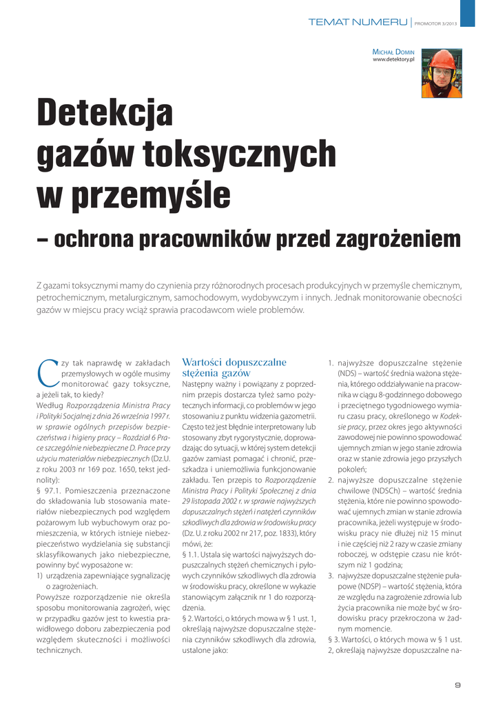 temat numeru | promotor 3/2013 Michał Domin www.detektory.pl Detekcja gazów toksycznych w przemyśle – ochrona pracowników przed zagrożeniem Z gazami toksycznymi mamy do czynienia przy różnorodnych procesach produkcyjnych w przemyśle chemicznym, petrochemicznym, metalurgicznym, samochodowym, wydobywczym i innych. Jednak monitorowanie obecności gazów w miejscu pracy wciąż sprawia pracodawcom wiele problemów. C zy tak naprawdę w zakładach przemysłowych w ogóle musimy monitorować gazy toksyczne, a jeżeli tak, to kiedy? Według Rozporządzenia Ministra Pracy i Polityki Socjalnej z dnia 26 września 1997 r. w sprawie ogólnych przepisów bezpieczeństwa i higieny pracy – Rozdział 6 Prace szczególnie niebezpieczne D. Prace przy użyciu materiałów niebezpiecznych (Dz.U. z roku 2003 nr 169 poz. 1650, tekst jednolity): § 97.1. Pomieszczenia przeznaczone do składowania lub stosowania materiałów niebezpiecznych pod względem pożarowym lub wybuchowym oraz pomieszczenia, w których istnieje niebezpieczeństwo wydzielania się substancji sklasyfikowanych jako niebezpieczne, powinny być wyposażone w: 1) urządzenia zapewniające sygnalizację o zagrożeniach. Powyższe rozporządzenie nie określa sposobu monitorowania zagrożeń, więc w przypadku gazów jest to kwestia prawidłowego doboru zabezpieczenia pod względem skuteczności i możliwości technicznych. Wartości dopuszczalne stężenia gazów Następny ważny i powiązany z poprzednim przepis dostarcza tyleż samo pożytecznych informacji, co problemów w jego stosowaniu z punktu widzenia gazometrii. Często też jest błędnie interpretowany lub stosowany zbyt rygorystycznie, doprowadzając do sytuacji, w której system detekcji gazów zamiast pomagać i chronić, przeszkadza i uniemożliwia funkcjonowanie zakładu. Ten przepis to Rozporządzenie Ministra Pracy i Polityki Społecznej z dnia 29 listopada 2002 r. w sprawie najwyższych dopuszczalnych stężeń i natężeń czynników szkodliwych dla zdrowia w środowisku pracy (Dz. U. z roku 2002 nr 217, poz. 1833), który mówi, że: § 1.1. Ustala się wartości najwyższych dopuszczalnych stężeń chemicznych i pyłowych czynników szkodliwych dla zdrowia w środowisku pracy, określone w wykazie stanowiącym załącznik nr 1 do rozporządzenia. § 2. Wartości, o których mowa w § 1 ust. 1, określają najwyższe dopuszczalne stężenia czynników szkodliwych dla zdrowia, ustalone jako: 1. najwyższe dopuszczalne stężenie (NDS) – wartość średnia ważona stężenia, którego oddziaływanie na pracownika w ciągu 8-godzinnego dobowego i przeciętnego tygodniowego wymiaru czasu pracy, określonego w Kodeksie pracy, przez okres jego aktywności zawodowej nie powinno spowodować ujemnych zmian w jego stanie zdrowia oraz w stanie zdrowia jego przyszłych pokoleń; 2. najwyższe dopuszczalne stężenie chwilowe (NDSCh) – wartość średnia stężenia, które nie powinno spowodować ujemnych zmian w stanie zdrowia pracownika, jeżeli występuje w środowisku pracy nie dłużej niż 15 minut i nie częściej niż 2 razy w czasie zmiany roboczej, w odstępie czasu nie krótszym niż 1 godzina; 3. najwyższe dopuszczalne stężenie pułapowe (NDSP) – wartość stężenia, która ze względu na zagrożenie zdrowia lub życia pracownika nie może być w środowisku pracy przekroczona w żadnym momencie. § 3. Wartości, o których mowa w § 1 ust. 2, określają najwyższe dopuszczalne na- 9 promotor 3/2013 | temat numeru Znaczna część osób zamawiających systemy detekcji postrzega powyższe wartości jako tożsame z progami alarmowymi detektorów. Uznają, że wartość 14 mg/m3 to wartość, przy której system ma zaalarmować, gdy tylko zostanie przekroczona. Tymczasem wartość ta może występować przez cały 8-godzinny dzień pracy zgodnie z § 2.1. bez uszczerbku dla zdrowia pracownika. Gdy pracownik będzie przebywał w atmosferze 20 mg/m3 przez 4 godziny w ciągu 8-godzinnego dnia pracy, to jego wartość średnia będzie wynosiła 10 mg/m3 (wartość wynika ze wzoru 20 mg/m3 x 4 h/8 h = 10 mg/m3 ; przeliczona wartość odnosi się do teoretycznego przelicznika; należy wziąć pod uwagę także pozostałe czynniki zewnętrzne i indywidualne, intensywność wysiłku fizycznego, stan zdrowia itp.), a więc także nie przekroczy NDS. Jednocześnie tak niskie stężenia (w końcu są one bezpieczne dla człowieka) oznaczają, że należy zastosować bardzo czułe urządzenia, co zwiększa możliwość występowania fałszywych alarmów. Odpowiednia kalibracja systemu detekcji gazów Centrala detekcji umieszczona w rozdzielnicy automatyki Współpracujące ze sobą centrale 16 kanałowe tężenia fizycznego czynnika szkodliwego dla zdrowia – ustalone jako wartość średnia natężenia, którego oddziaływanie na pracownika w ciągu 8-godzinnego dobowego i przeciętnego tygodniowego wymiaru czasu pracy, określonego w Kodeksie pracy, przez okres jego aktywności zawodowej nie powinno spowodować ujemnych zmian w jego stanie zdrowia oraz w stanie zdrowia jego przyszłych pokoleń. Jako przykład posłuży nam amoniak. 10 Substancja NDS NDSCh NDSP Amoniak (nr CAS 7664-41-7) 14 mg/m3 28 mg/m3 – Należy przy tym wspomnieć, że detektory (zależnie od zastosowanej technologii pomiarowej) są przeznaczone do okresowego przebywania w mierzonym gazie w swoim zakresie pomiarowym. Długotrwałe narażenie detektora na kontakt z gazem lub – co gorsze – przekroczeniem zakresu pomiarowego powoduje konieczność szybszej kalibracji lub wymiany modułów sensorycznych, a co za tym idzie – powstanie dodatkowych kosztów eksploatacyjnych (w zależności od zastosowanej technologii pomiarowej niektóre urządzenia nie są wrażliwe na przekroczenie zakresu pomiarowego – np. sensory Infra-Red, PID. Warto w takim przypadku wspólnie z projektantem instalacji rozważyć cel zastosowania systemu, np. czy ma to być raczej sterownik wentylacji w pomieszczen