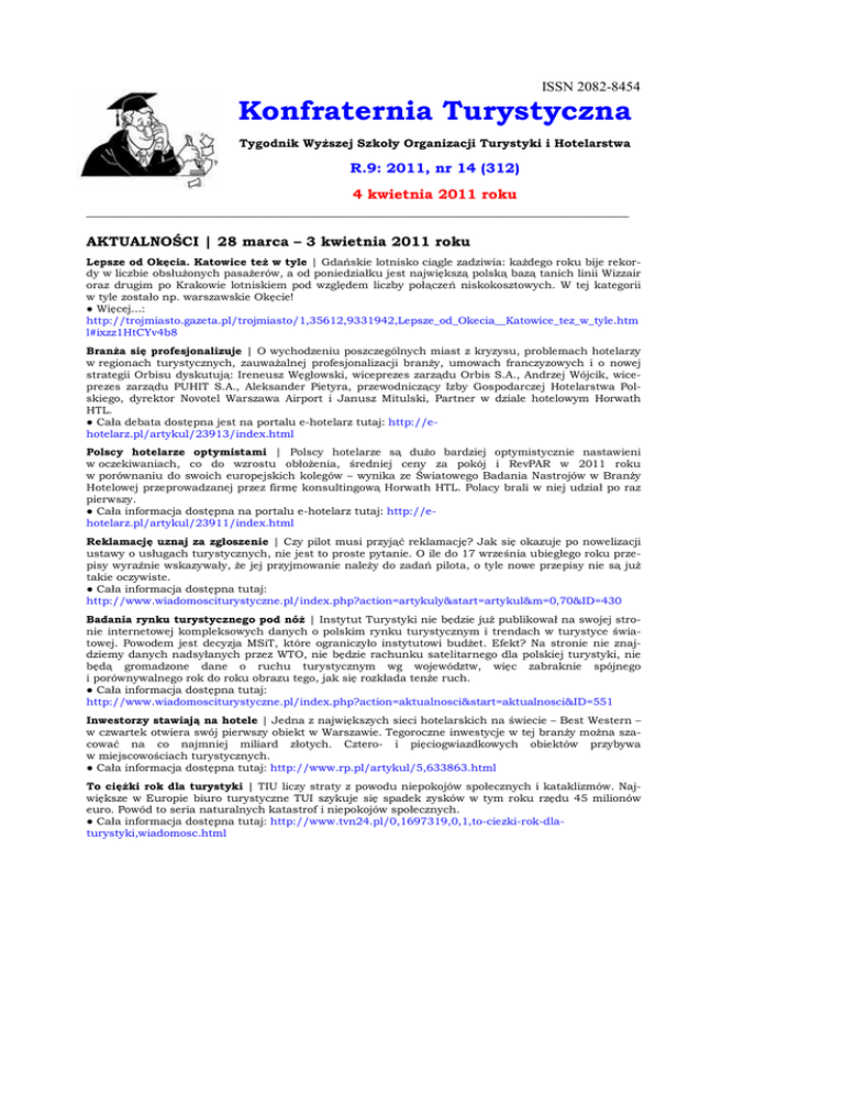 ISSN 2082-8454 Konfraternia Turystyczna Tygodnik Wyższej Szkoły Organizacji Turystyki i Hotelarstwa R.9: 2011, nr 14 (312) 4 kwietnia 2011 roku __________________________________________________________________________ AKTUALNOŚCI | 28 marca – 3 kwietnia 2011 roku Lepsze od Okęcia. Katowice też w tyle | Gdańskie lotnisko ciągle zadziwia: każdego roku bije rekordy w liczbie obsłużonych pasażerów, a od poniedziałku jest największą polską bazą tanich linii Wizzair oraz drugim po Krakowie lotniskiem pod względem liczby połączeń niskokosztowych. W tej kategorii w tyle zostało np. warszawskie Okęcie! ● Więcej...: http://trojmiasto.gazeta.pl/trojmiasto/1,35612,9331942,Lepsze_od_Okecia__Katowice_tez_w_tyle.htm l#ixzz1HtCYv4b8 Branża się profesjonalizuje | O wychodzeniu poszczególnych miast z kryzysu, problemach hotelarzy w regionach turystycznych, zauważalnej profesjonalizacji branży, umowach franczyzowych i o nowej strategii Orbisu dyskutują: Ireneusz Węgłowski, wiceprezes zarządu Orbis S.A., Andrzej Wójcik, wiceprezes zarządu PUHIT S.A., Aleksander Pietyra, przewodniczący Izby Gospodarczej Hotelarstwa Polskiego, dyrektor Novotel Warszawa Airport i Janusz Mitulski, Partner w dziale hotelowym Horwath HTL. ● Cała debata dostępna jest na portalu e-hotelarz tutaj: http://ehotelarz.pl/artykul/23913/index.html Polscy hotelarze optymistami | Polscy hotelarze są dużo bardziej optymistycznie nastawieni w oczekiwaniach, co do wzrostu obłożenia, średniej ceny za pokój i RevPAR w 2011 roku w porównaniu do swoich europejskich kolegów – wynika ze Światowego Badania Nastrojów w Branży Hotelowej przeprowadzanej przez firmę konsultingową Horwath HTL. Polacy brali w niej udział po raz pierwszy. ● Cała informacja dostępna na portalu e-hotelarz tutaj: http://ehotelarz.pl/artykul/23911/index.html Reklamację uznaj za zgłoszenie | Czy pilot musi przyjąć reklamację? Jak się okazuje po nowelizacji ustawy o usługach turystycznych, nie jest to proste pytanie. O ile do 17 września ubiegłego roku przepisy wyraźnie wskazywały, że jej przyjmowanie należy do zadań pilota, o tyle nowe przepisy nie są już takie oczywiste. ● Cała informacja dostępna tutaj: http://www.wiadomosciturystyczne.pl/index.php?action=artykuly&start=artykul&m=0,70&ID=430 Badania rynku turystycznego pod nóż | Instytut Turystyki nie będzie już publikował na swojej stronie internetowej kompleksowych danych o polskim rynku turystycznym i trendach w turystyce światowej. Powodem jest decyzja MSiT, które ograniczyło instytutowi budżet. Efekt? Na stronie nie znajdziemy danych nadsyłanych przez WTO, nie będzie rachunku satelitarnego dla polskiej turystyki, nie będą gromadzone dane o ruchu turystycznym wg województw, więc zabraknie spójnego i porównywalnego rok do roku obrazu tego, jak się rozkłada tenże ruch. ● Cała informacja dostępna tutaj: http://www.wiadomosciturystyczne.pl/index.php?action=aktualnosci&start=aktualnosci&ID=551 Inwestorzy stawiają na hotele | Jedna z największych sieci hotelarskich na świecie – Best Western – w czwartek otwiera swój pierwszy obiekt w Warszawie. Tegoroczne inwestycje w tej branży można szacować na co najmniej miliard złotych. Cztero- i pięciogwiazdkowych obiektów przybywa w miejscowościach turystycznych. ● Cała informacja dostępna tutaj: http://www.rp.pl/artykul/5,633863.html To ciężki rok dla turystyki | TIU liczy straty z powodu niepokojów społecznych i kataklizmów. Największe w Europie biuro turystyczne TUI szykuje się spadek zysków w tym roku rzędu 45 milionów euro. Powód to seria naturalnych katastrof i niepokojów społecznych. ● Cała informacja dostępna tutaj: http://www.tvn24.pl/0,1697319,0,1,to-ciezki-rok-dlaturystyki,wiadomosc.html KONFERENCJE NAUKOWE I BRANŻOWE – zapowiedzi Spotkajmy się nad Odrą konferencja branżowa, Międzynarodowe Targi Turystyczne, Wrocław, 8 kwietnia 2011 roku Dolnośląska Organizacja Turystyczna już po raz kolejny organizuje konferencję. „Spotkajmy się nad Odrą”, która poświęcona jest przedsięwzięciom z zakresu turystyki wodnej. W tegorocznej edycji konferencji chcielibyśmy zaprezentować również praktyczne działania z rynku krajowego oraz zagranicznego. Spotkanie odbędzie się podczas Międzynarodowych Targów Turystycznych we Wrocławiu w piątek 8 kwietnia 2011 roku w godzinach 10.00-14.00 w sali konferencyjnej Hali Orbita. Szósta już edycja konferencji „Spotkajmy się nad Odrą” będzie okazją do przedstawienia aktualnej sytuacji oraz szans rozwoju turystyki wodnej na obszarze Odry, jak również wymiany doświadczeń i poruszenia istotnych kwestii odnośnie unormowań prawnych oraz wspierania ruchu turystycznego na tym obszarze. Program konferencji ● 10.00 – Słowo wstępne ● 10.10 – „Euro 2012 szansą dla dolnośląskich subregionów”- założenia projektu dla rozwoju turystyki wodnej – Rajmund Papiernik Dyrektor Biura Dolnośląskiej Organizacji Turystycznej ● 10.30 – Implementacja doświadczeń krajów Europy Zachodniej a możliwości ich wykorzystania w rozwoju turystyki na Odrze – Wojciech Nowak, Zatoka Gondoli, Wrocław ● 11.00 – Promocja wspólnych produktów turystycznych obszaru 8 regionów Polski i Niemiec – projekt „Kraina Odry” – przedstawiciel Polskiej Organizacji Turystycznej ● 11.30 – Zmiany w przepisach dotyczących bezpieczeństwa żeglugi turystycznej, dr Jan Pyś, dyrektor Urzędu Żeglugi Śródlądowej we Wrocławiu ● 12.00 – przerwa ● 12.30 – Zachodniopomorski Szlak Żeglarski – Witold Jabłoński, dyrektor Biura Zachodniopomorskiej Regionalnej Organizacji Turystycznej ● 13.00 – Port Jachtowy Szczecin, Szczecińskie Dni Odry: Studium Przypadku – Jerzy Raducha, kierownik Biura ds. Morskich, Urząd Miasta Szczecin ● 13.30 – Czas na dyskusję Źródło: Dolnośląska Organizacja Turystyczna, data dostępu 28.03.2011 KONFERENCJE NAUKOWE I BRANŻO