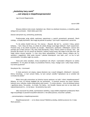 „Jesteśmy tacy sami” ...coś więcej o niepełnosprawności mgr Urszula Wyganowska styczeń 2008 Wszyscy dobrze mnie znacie. Spotykam się z Wami na szkolnym korytarzu, w świetlicy, gdzie witają mnie uczniowie: - Dzień dobry pani Ulu! Zawsze zatrzymam się, uśmiechnę, pozdrowię. Przekraczając próg szkoły częściowo zapominam o swoich prywatnych sprawach. Niech czekają... aż będę wychodzić. Nie mogę się jednak ich pozbyć. Tych myśli i wspomnień z przed lat. Tu do szkoły chodził mój syn. Ten starszy – Zbyszek. Był jak Ty... uczniem I klasy, potem kolejnej... I tak z klasy do klasy, ze szkoły do szkoły dźwiga swój bagaż dobrych i złych wspomnień. Przecież tutaj, w tej szkole wszystko się zaczęło... Ślubowanie, spotkanie z Mikołajem. Jeszcze dziś pamięta jak na Balu tańczył z Ulą, taką małą blondynką z klasy. Potem czekał na wiosnę i lato... Ale przyszło dla innych. On nie cieszył się słońcem i zieloną, bujną trawą. Dla niego te dni były inne. Dla niego słońce inaczej świeciło. I o tym chcę Wam opowiedzieć. O takim samym chłopcu jak Ty, wesołym i pogodnym. Miał wiele marzeń i planów dziecięcych. Lecz było „coś", co mu w tym przeszkodziło. Coś jakby nagle się urwało... Teraz jest znów wesołym, mniej szczęśliwym ale ufnym i wytrwałym chłopcem na wózku inwalidzkim. To nie jakaś zła bajka, to prawdziwa historia, moja, mojego syna i całej mojej rodziny. Czy warto ją poznać? Decydujcie Wy – Uczniowie! A może poznacie coś więcej, więcej dowiecie się o swych kolegach, młodszych i starszych, którzy mieszkają... w tym samym bloku, na tym samym osiedlu? Spotykacie się w windzie lub w drodze do szkoły? Może teraz gdy przeczytasz tę historię inaczej spojrzysz na ludzi i dzieci niepełnosprawne? Mówisz, że inny, że inaczej wygląda lub się zachowuje... A przecież wszyscy się czymś różnimy: kolorem oczu i włosów, małym pieprzykiem pod nosem... Ty nosisz okulary... inny ma koślawe kolana i zgarbione plecy. Ten gruby... ta chuda. Ten ładny... ten brzydki. Zawsze jest coś co nas dzieli, ale najważniejsze jest to... co nas łączy – bo jesteśmy tacy sami. Jako nauczyciel tej szkoły, wychowawca świetlicy, czuję wielkie pragnienie przekazania Wam tego wszystkiego co pozwoli wszystkim dzieciom ( i nie tylko) poznać, zrozumieć i polubić... ... porozmawiajmy o niepełnosprawności. Niepełnosprawność – co to słowo znaczy? Niektórzy wiedzą, niektórzy jeszcze nie. A więc Wam powiem... marzec 2008 Zbyszek miał 7 lat. Był dumnym uczniem klasy I. Rozrabiał w szkole, przynosił uwagi typu: „W czasie lekcji spacerował po klasie”, „Znowu spadł z krzesła”. Był urwisem. Chodził na świetlicę, pod czujnym okiem Pani Basi Nawrockiej ćwiczył wiersze na konkursy recytatorskie. Aż przyszedł dzień... Niby jak każdy. Tyle, że wiosenny, ciepły. Jak zawsze z radością poszłam odebrać swego syna ze szkoły. A właściwie z boiska, gdzie biegał wraz z chłopcami ze świetlicy. Wracamy do domu, do taty i brata. Trzeba odrobić lekcje. „Zbyszek, Zbyszek!”, „Co Ci jest synu? Czemu nie możesz iść? Czy coś się stało?”. Nie. Nic. Nie było wypadku, uderzenia. Nie spadł, nie przewrócił się. Zupełnie nic. A jednak było „coś”. „Coś” co spowodowało, że już nigdy nie stanął na nogi, nie mógł normalnie chodzić. I nie ma szansy na powrót do zdrowia, do pełnej sprawności. Jakaś choroba pojawiła się i znikła, zostawiając po sobie trwałe ślady. Trwały „uszczerbek” na zdrowiu. Zbyszek już nie stanie na własnych nogach. Nie może chodzić. I nie ma na to lekarstwa. Żadne ćwiczenia czy wybitni specjaliści, lekarze ani cudotwórcy nic nie poradzili i nie poradzą. Od tamtej pory porusza się tylko na wózku inwalidzkim. I to jest niepełnosprawność. Od kilku lat, odkąd pracuję w tej szkole prowadzę cykl zajęć pod nazwą „Jesteśmy tacy sami”. Z dziećmi ze świetlicy, w różnym wieku rozmawiam o niepełnosprawności. Dzielę się, z tymi najmłodszymi, swoją wiedzą i doświadczeniem. Pragnę, aby dzieci nauczyły się innego, właściwego spojrzenia na niepełnosprawność. Zaczęły poznawać, rozumieć i akceptować wszystkich swoich kolegów i ludzi z trwałymi problemami zdrowotnymi. Aby potrafili okazać szacunek i życzliwość tym, którzy mieli trochę mniej szczęścia w życiu. I temu mają służyć moje rozmowy. Wielu z Was było lub jest uczestnikami tych zajęć. Zapytacie: „Czy warto?” Tak, warto. Warto być lepszym. Lepszym dorosłym, dzieckiem. Lepszą koleżanką lub kolegą. Dla siebie i dla nich. Dla tych ludzi na wózkach, z niedosłuchem, niewidomych i tych z zaburzonym umysłem, co nie potrafią myśleć jak Ty. Nie żałuj ich lecz naucz się żyć z nimi. Tak po prostu. Po ludzku. To nie takie trudne. A ja Ci w tym pomogę. Opowiem Wam o zajęciach z najmłodszymi - sześciolatkami. Dzieci z „zerówek” są wspaniałe, bardzo szczere i otwarte. A niektóre takie dojrzałe. Szczególnie w tym roku. Jest wtorek. Godzina 8.00. Przechodzę z „zeróweczką” do naszej ulubionej „Małej sali”. „O czy dzisiaj będzie?” – dopytują się. „Opowiem Wam pewną historię”- mówię. Dzieci siadają na dywan i słuchają. Opowiadam o Zbyszku. Pokazuję zdjęcia. Pytam się czy znają kogoś „takiego” z własnego podwórka czy bloku. „Ja znam babcię, która ma laskę” – mówi jeden. „A mój dziadek też nie może chodzić bo jest w gipsie”. Tłumaczę im, że u jednych jest to starość, a złamana noga wyzdrowieje po pewnym czasie. Mówię dalej, wyjaśniam, opowiadam. „A więc co rozumiecie przez słowo niepełnosprawność? Kim jest osoba niepełnosprawna?”. Pojawia się mnóstwo odpowiedzi. Monika Powójska z kl. Oa mówi: -„To osoby, które nie mogą wszystkiego robić, np. chodzić, nie mogą skakać.” Karolina Wielgoszyńska kl.IIa, która często jes