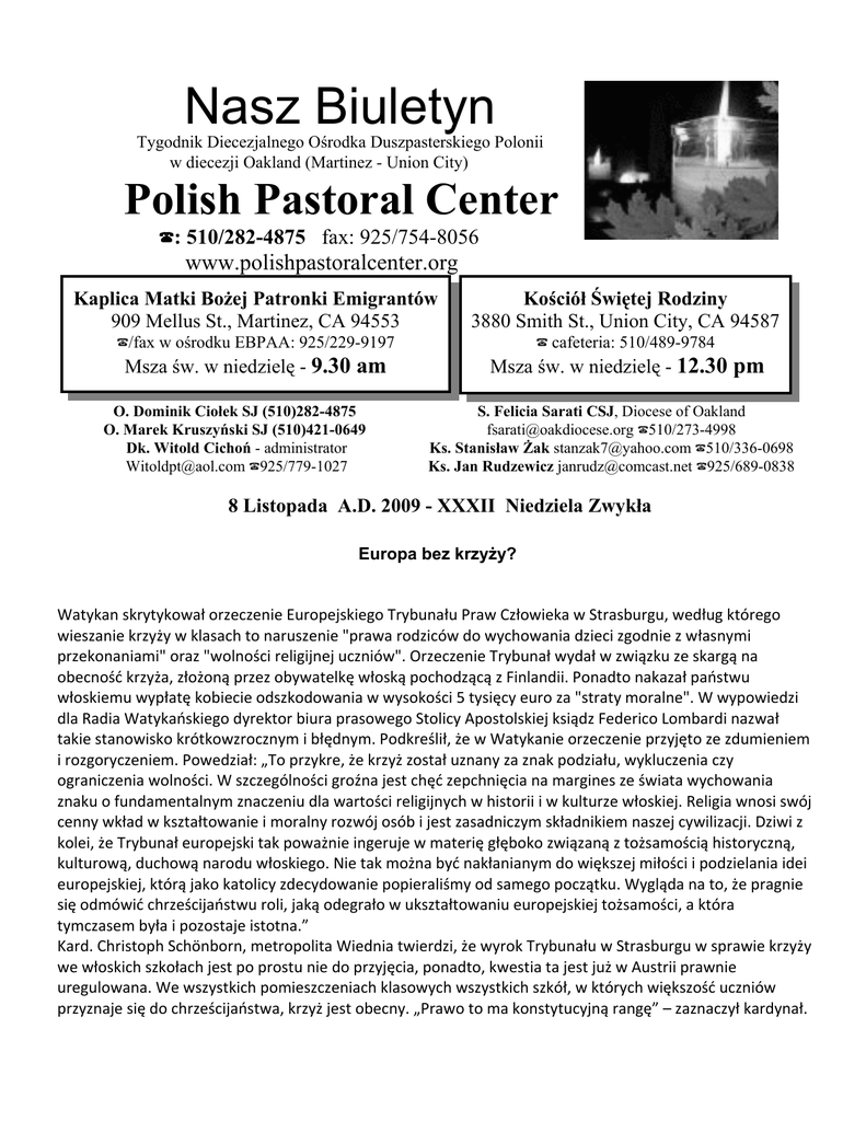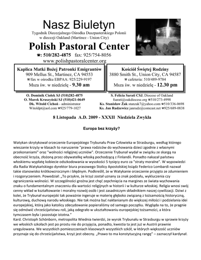 Nasz Biuletyn Tygodnik Diecezjalnego Ośrodka Duszpasterskiego Polonii w diecezji Oakland (Martinez - Union City) Polish Pastoral Center ?: 510/282-4875 fax: 925/754-8056 www.polishpastoralcenter.org Kaplica Matki Bożej Patronki Emigrantów 909 Mellus St., Martinez, CA 94553 Kościół Świętej Rodziny 3880 Smith St., Union City, CA 94587 ?/fax w ośrodku EBPAA: 925/229-9197 ? cafeteria: 510/489-9784 Msza św. w niedzielę - 9.30 am Msza św. w niedzielę - 12.30 pm O. Dominik Ciołek SJ (510)282-4875 O. Marek Kruszyński SJ (510)421-0649 Dk. Witold Cichoń - administrator [email protected] ?925/779-1027 S. Felicia Sarati CSJ, Diocese of Oakland [email protected] ?510/273-4998 Ks. Stanisław Żak [email protected] ?510/336-0698 Ks. Jan Rudzewicz [email protected] ?925/689-0838 8 Listopada A.D. 2009 - XXXII Niedziela Zwykła Europa bez krzyży? Watykan skrytykował orzeczenie Europejskiego Trybunału Praw Człowieka w Strasburgu, według którego wieszanie krzyży w klasach to naruszenie "prawa rodziców do wychowania dzieci zgodnie z własnymi przekonaniami" oraz "wolności religijnej uczniów". Orzeczenie Trybunał wydał w związku ze skargą na obecność krzyża, złożoną przez obywatelkę włoską pochodzącą z Finlandii. Ponadto nakazał państwu włoskiemu wypłatę kobiecie odszkodowania w wysokości 5 tysięcy euro za "straty moralne". W wypowiedzi dla Radia Watykańskiego dyrektor biura prasowego Stolicy Apostolskiej ksiądz Federico Lombardi nazwał takie stanowisko krótkowzrocznym i błędnym. Podkreślił, że w Watykanie orzeczenie przyjęto ze zdumieniem i rozgoryczeniem. Powedział: „To przykre, że krzyż został uznany za znak podziału, wykluczenia czy ograniczenia wolności. W szczególności groźna jest chęć zepchnięcia na margines ze świata wychowania znaku o fundamentalnym znaczeniu dla wartości religijnych w historii i w kulturze włoskiej. Religia wnosi swój cenny wkład w kształtowanie i moralny rozwój osób i jest zasadniczym składnikiem naszej cywilizacji. Dziwi z kolei, że Trybunał europejski tak poważnie ingeruje w materię głęboko związaną z tożsamością historyczną, kulturową, duchową narodu włoskiego. Nie tak można być nakłanianym do większej miłości i podzielania idei europejskiej, którą jako katolicy zdecydowanie popieraliśmy od samego początku. Wygląda na to, że pragnie się odmówić chrześcijaństwu roli, jaką odegrało w ukształtowaniu europejskiej tożsamości, a która tymczasem była i pozostaje istotna.” Kard. Christoph Schönborn, metropolita Wiednia twierdzi, że wyrok Trybunału w Strasburgu w sprawie krzyży we włoskich szkołach jest po prostu nie do przyjęcia, ponadto, kwestia ta jest już w Austrii prawnie uregulowana. We wszystkich pomieszczeniach klasowych wszystkich szkół, w których większość uczniów przyznaje się do chrześcijaństwa, krzyż jest obecny. „Prawo to ma konstytucyjną rangę” – zaznaczył kardynał. Podkreślił, że „nie narusza to wolności religijnej, tak jak nie robi tego swobodne wyznawanie różnych przekonań religijnych". Potępienie Włoch przez Europejski Trybunał Praw Człowieka w Strasburgu za obecność krzyży w szkołach publicznych podzieliło wielu ludzi także w Hiszpanii. Organizacje skupiające szkoły prywatne w tym kraju wystąpiły przeciw tej decyzji, którą określiły jako „nie do przyjęcia i zaskakującą.” Również w Polsce decyzja Trybunału wywołała natychmiastowe reakcje. „Dla kultury europejskiej, z której wyrastamy, krzyż zawsze był źródłem mocy i mądrości” – przypomina sekretarz generalny Konferencji Episkopatu Polski bp Stanisław Budzik, komentując orzeczenie Trybunału. „Jeśli odrzucimy krzyż, to na jakich wartościach będziemy budować Europę?” – przestrzega bp Budzik. . Zebrane składki kościelne. Za złożone ofiary składamy serdeczne Bóg zapłać: Martinez 08/09/09 08/16/09 08/23/09 08/30/09 09/06/09 09/13/09 09/20/09 09/27/09 10/04/09 10/11/09 10/18/09 Union City $239 $313 $328 $291 $254 $301 + Katedra $198 $300 $343 $307 $380 $259 $211 $323 + lunch $57 $213 $218 + lunch $31 $238 + Katedra $163 $189 $324 $278 $226 $412 10/25/09 $280 11/1/09 $645 Z Ogłoszenia parafialne Z . Prosimy o składanie kart wypominkowych za dusze zmarłych tych, o których zbawienie parafianie pragną sie modlić. Kartki są dostępne do pobrania przy wejściu do Kościoła pw. Sw. Rodziny w Union City oraz w Kaplicy w Martinez. . W miesiącu Listopadzie w każdą niedzielę będziemy się modlić modlitwą wypominkową, podczas modlitwy wiernych, wypraszając Pana Boga o Jego nieskończone miłosierdzie i szczęśliwość wieczną dla naszych zmarłych. . Zapraszamy na wieczory wigilijne organizowane przez nasze wpolnoty: Union City 5 grudnia, 5 pm, bilety do nabycia u p. Elżbiety Pajerskiej (650)349-3630 i p. Bernadetty Wrona (510)886-1290; Walnut Creek 12 grudnia, 5 pm, bilety u p. Iwony Urbaniak (925)685-6035 i p. Elżbiety Łukaszewicz (925)914-9988. . Polish Pastoral Center oraz Harcerstwo w Union City zapraszają na wczesną Zabawę Andrzejkową w dniu 14 Listopada od godz. 7:00 pm do 2:00 am. Dochód przeznaczony w całości na Harcerzy. Bilety do nabycia u p. Urszuli Małaszewskiej (925) 256-9033 i p. Lidii Zagata (510) 247-9848 . Domek do wynajęcia w Oakland na pograniczu San Leandro, spokojna okolica, w przystępnej cenie. 1 bedroom, living room, kitchen i bathroom. Cena $700, deposit $350. Proszę o kontakt z panem Jackiem (408) 761-7507 . Druh Ryszard Urbaniak wydaje następny tom wierszy zatytułowany “Zatoka Poezji”. Jak pamiętamy, druh wraz ze swoim Kołem Harcerskim corocznie organizuje pomoc dla polskiego harcerstwa w Kazachstanie. Dochód ze sprzedaży tomiku ponownie w całości przeznacza na ten piękny i zbożny cel. Prosimy o wsparcie. BIURO PRAWNE FIRMY KEROSKY & ASSOCIATES Specjalizuje się we wszystkich sprawach cywilnych, takich jak: wypadki samochodowe - obrażenia ci