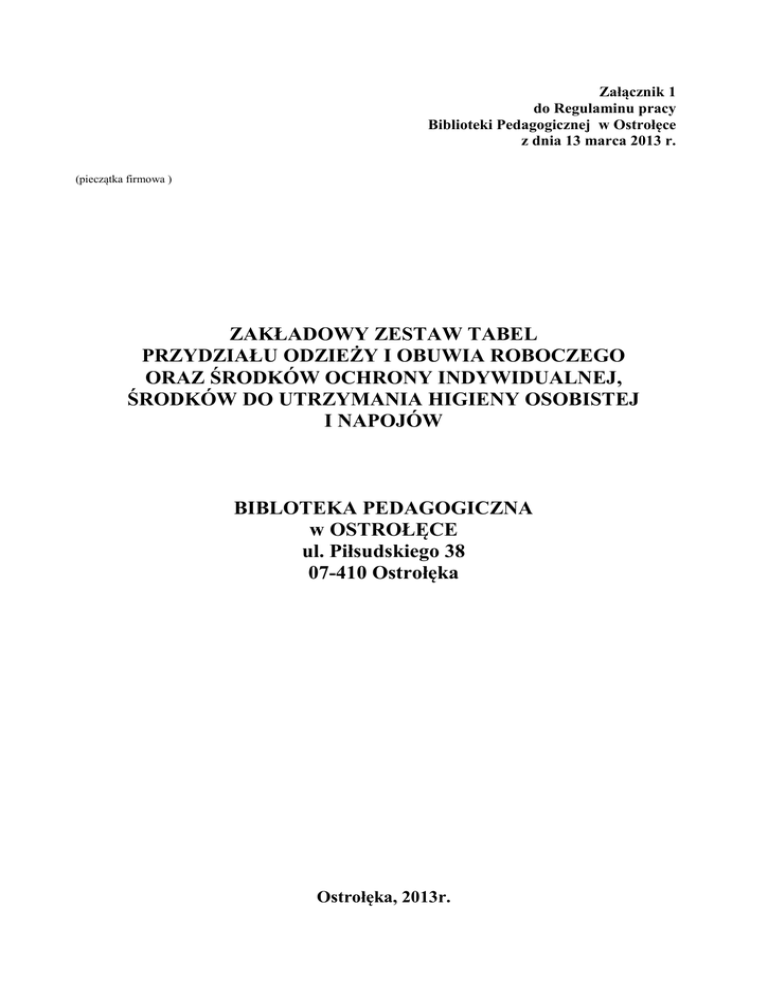 Załącznik 1 do Regulaminu pracy Biblioteki Pedagogicznej w Ostrołęce z dnia 13 marca 2013 r. (pieczątka firmowa ) ZAKŁADOWY ZESTAW TABEL PRZYDZIAŁU ODZIEŻY I OBUWIA ROBOCZEGO ORAZ ŚRODKÓW OCHRONY INDYWIDUALNEJ, ŚRODKÓW DO UTRZYMANIA HIGIENY OSOBISTEJ I NAPOJÓW BIBLOTEKA PEDAGOGICZNA w OSTROŁĘCE ul. Piłsudskiego 38 07-410 Ostrołęka Ostrołęka, 2013r. Spis treści I Zasady przydzielania pracownikom odzieży i obuwia roboczego oraz środków ochrony indywidualnej II Zasady gospodarki odzieżą i obuwiem roboczym oraz środkami ochrony indywidualnej III Tabela norm przydziału odzieży i obuwia roboczego oraz środków ochrony indywidualnej IV Ekwiwalenty : 1. Ekwiwalent za używanie odzieży własnej 2. Ekwiwalent za pranie odzieży V Zasady wyposażenia pracowników w środki czystości i napoje VI Tabela przydziału środków do utrzymania czystości i napojów I. Zasady przydzielania pracownikom odzieży i obuwia roboczego oraz środków ochrony indywidualnej 1. Do środków ochrony indywidualnej zalicza się : odzież ochronną ochrony kończyn dolnych, kończyn górnych, głowy, oczu i twarzy, słuchu, układu oddechowego – środki te powinny być użytkowane w miejscu pracy zgodnie z przeznaczeniem w celu zabezpieczenia pracownika przed działaniem niebezpiecznych i szkodliwych czynników występujących w środowisku pracy. 2. Kierownik jednostki nie może dopuścić pracownika do pracy bez środków ochrony indywidualnej oraz odzieży i obuwia roboczego, przewidzianych do stosowania na określonym stanowisku pracy. 3. Kierownik jednostki wydaje pracownikowi nieodpłatnie odzież i obuwie robocze. 4. W przypadku pracowników zatrudnionych na podstawie umów : na okres próbny, czas określony nie przekraczający 12 m-cy, na czas zastępstwa pracodawca może wypłacić ekwiwalent pieniężny za używanie własnej odzieży i obuwia roboczego. 5. Pracownik może używać własną odzież i obuwie pod warunkiem, że spełni wymogi bezpieczeństwa i higieny pracy. 6. Środki ochrony indywidualnej winny być używane do czasu utraty ich cech ochronnych i użytkowych, a odzież i obuwie robocze przez czas określony w Zakładowej Tabeli Norm. 7. Pracownik obowiązany jest na żądanie kierownika jednostki okazać w każdym czasie posiadaną odzież i obuwie robocze. 8. W uzasadnionych przypadkach istnieje możliwość wydawania odzieży w innym terminie niż wynika to z tabeli norm przydziału. 9. Pracownicy zatrudnieni na stanowiskach, na których wg Tabeli nie przysługuje odzież zimowa na czas przeniesienia do innej pracy będą otrzymywali stosowną odzież ochronną i roboczą. 10. Kierownik jednostki może przydzielić pracownikowi używaną odzież i obuwie robocze jeżeli przedmioty te zachowały właściwości ochronne i użytkowe. 11. Ww. postanowienia nie obowiązują studentów i uczniów odbywających w zakładzie pracy zajęcia praktyczne i praktyki zawodowe. 12. Dla każdego pracownika prowadzona jest „Karta ewidencyjna wyposażenia BHP”. 13.Środki ochrony indywidualnej oraz odzież i obuwie robocze są przydzielane pracownikom bezpłatnie za pokwitowaniem i stanowią własność zakładu pracy. 14. Okres użytkowania odzieży i obuwia ochronnego i roboczego ustala się w miesiącach kalendarzowych, a odzieży i obuwia ocieplanego wydanych na sezon zimowy – liczbą okresów zimowych, a w przypadku ciągłego użytkowania – miesiącach kalendarzowych. Okres zimowy wynosi 5 miesięcy i trwa od dnia 1 listopada do dnia 31 marca. 15. Przy ustalaniu rzeczywistego okresu użytkowania odzieży i obuwia uwzględnia się czas przepracowany wraz z urlopem wypoczynkowym, z wyłączeniem pozostałych nieobecności w pracy, trwających jednorazowo ponad miesiąc. 16. Pracownikom zatrudnionym w niepełnym wymiarze czasu pracy przedłuża się okresy używalności przydzielonych przedmiotów proporcjonalnie do czasu pracy. 17. Jeżeli utrata, zniszczenie lub przedwczesne zużycie wymienionych w Tabeli norm przedmiotów nastąpiło z winy pracownika, jest on zobowiązany uiścić kwotę równą niezamortyzowanej części wartości utraconych lub zniszczonych przedmiotów. Kwotę tę pracodawca może obniżyć jeżeli uzasadniają to okoliczności utraty lub zniszczenia. 18. W razie rozwiązania bądź wygaśnięcia stosunku pracy, pracodawca obciąża pracownika kwotą niezamortyzowanej części wartości tych przedmiotów lub żąda ich zwrotu. 19. Za odzież i obuwie robocze oraz środki ochronne pracownik nie jest obciążony w przypadku : używania tych przedmiotów przed rozwiązaniem stosunku pracy przez okres przekraczający 75% czasu używalności określonego w Zakładowej Tabeli Norm, przejścia pracownika na emeryturę lub rentę, śmierci pracownika 20. W przypadku, o którym mowa w pkt 4 pracodawca może wypłacić ekwiwalent pieniężny za używaną przez pracownika własną odzież i obuwie robocze. 21. Pracodawca zapewnia pranie odzieży roboczej. Jeżeli nie jest to możliwe czynności te mogą być wykonane przez pracownika za jego zgodą. Wówczas pracodawca wypłaca ekwiwalent pieniężny za pranie odzieży, który naliczony jest na podstawie aktualnych kosztów prania. 22. Kwoty ekwiwalentu pieniężnego nalicza raz na pół roku specjalista ds. administracji na podstawie aktualnych cen. 23. Pracodawca nie wypłaca ekwiwalentu pieniężnego za przedłużony okres użytkowania przedmiotów wydawanych pracownikowi na podstawie Tabeli Norm. 24. Odzież i obuwie robocze oraz środki ochrony indywidualnej – które mają przewidywalny okres używalności „do zużycia” wydawane są na pisemny wniosek kierownika (zał. nr 1) po przeprowadzeniu kontroli zużycia odzieży i obuwia roboczego u podległych mu pracowników. Kontrola zużycia odzieży, obuwia roboczego oraz środków ochrony indywidualnej powinna odbywać się minimum raz w roku i być potwierdzona pisemnym protokołem (zał. nr 2) II. Zasady gospodarki odzieżą i obuwiem roboczym