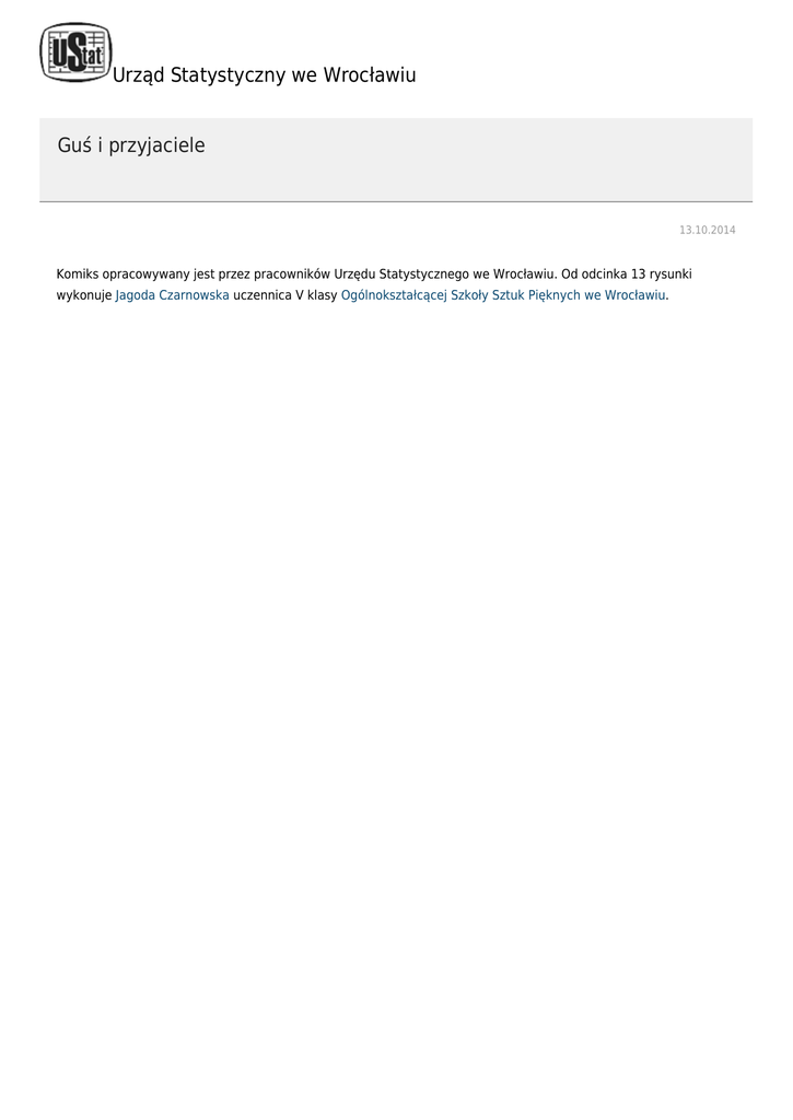 Urząd Statystyczny we Wrocławiu Guś i przyjaciele 13.10.2014 Komiks opracowywany jest przez pracowników Urzędu Statystycznego we Wrocławiu. Od odcinka 13 rysunki wykonuje Jagoda Czarnowska uczennica V klasy Ogólnokształcącej Szkoły Sztuk Pięknych we Wrocławiu.