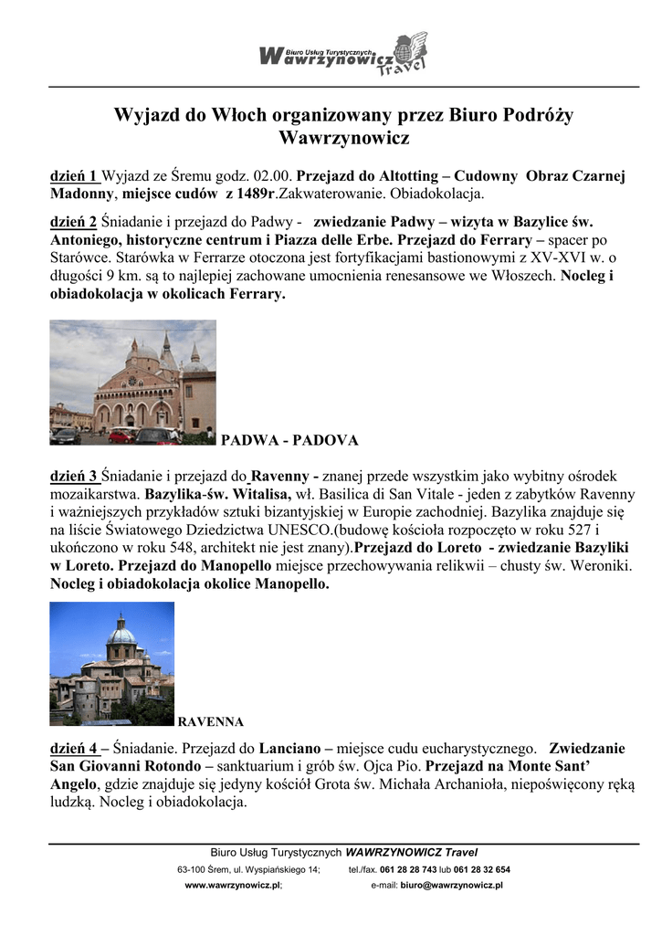 Wyjazd do Włoch organizowany przez Biuro Podróży Wawrzynowicz dzień 1 Wyjazd ze Śremu godz. 02.00. Przejazd do Altotting – Cudowny Obraz Czarnej Madonny, miejsce cudów z 1489r.Zakwaterowanie. Obiadokolacja. dzień 2 Śniadanie i przejazd do Padwy - zwiedzanie Padwy – wizyta w Bazylice św. Antoniego, historyczne centrum i Piazza delle Erbe. Przejazd do Ferrary – spacer po Starówce. Starówka w Ferrarze otoczona jest fortyfikacjami bastionowymi z XV-XVI w. o długości 9 km. są to najlepiej zachowane umocnienia renesansowe we Włoszech. Nocleg i obiadokolacja w okolicach Ferrary. PADWA - PADOVA dzień 3 Śniadanie i przejazd do Ravenny - znanej przede wszystkim jako wybitny ośrodek mozaikarstwa. Bazylika-św. Witalisa, wł. Basilica di San Vitale - jeden z zabytków Ravenny i ważniejszych przykładów sztuki bizantyjskiej w Europie zachodniej. Bazylika znajduje się na liście Światowego Dziedzictwa UNESCO.(budowę kościoła rozpoczęto w roku 527 i ukończono w roku 548, architekt nie jest znany).Przejazd do Loreto - zwiedzanie Bazyliki w Loreto. Przejazd do Manopello miejsce przechowywania relikwii – chusty św. Weroniki. Nocleg i obiadokolacja okolice Manopello. RAVENNA dzień 4 – Śniadanie. Przejazd do Lanciano – miejsce cudu eucharystycznego. Zwiedzanie San Giovanni Rotondo – sanktuarium i grób św. Ojca Pio. Przejazd na Monte Sant’ Angelo, gdzie znajduje się jedyny kościół Grota św. Michała Archanioła, niepoświęcony ręką ludzką. Nocleg i obiadokolacja. Biuro Usług Turystycznych WAWRZYNOWICZ Travel 63-100 Śrem, ul. Wyspiańskiego 14; www.wawrzynowicz.pl; tel./fax. 061 28 28 743 lub 061 28 32 654 e-mail: [email protected] SAN GIOVANNI ROTONDO dzień 5– Śniadanie. Przejazd do miejscowości Pietrelcina - miejsca urodzenia Świętego Ojca Pio, przejazd do Piana Romana - miejsce gdzie po raz pierwszy Ojciec Pio otrzymał stygmaty. Przejazd na Monte Cassino – wizyta na Cmentarzu Żołnierzy Polskich. Przejazd na nocleg okolice Rzymu. Obiadokolacja PIETRELCINA dzień 6 Śniadanie. Watykan. Bogate zbiory Muzeów Watykańskich, uważane za jedną z najważniejszych kolekcji świata, unikatowa Kaplica Sykstyńska ozdobiona wspaniałymi freskami Michała Anioła, Anioł Pański - majestatyczny Plac św. Piotra ze słynną kolumnadą Berniniego, przepiękna Bazylika św. Piotra - jedna z najważniejszych świątyń chrześcijaństwa, zbudowana nad grobem św. Piotra Apostoła oraz Kaplica św. Sebastiana, w której został pochowany bł. Jan Paweł II. Bazylika św. Pawła za Murami – miejsce pochówku św. Pawła. Nocleg okolice Rzymu. Obiadokolacja. RZYM - ROMA dzień 7 Śniadanie. Bazylika św. Jana na Lateranie - katedra biskupa Rzymu. Katakumby rozległe podziemne nekropolie, otoczone często mgłą tajemnicy i legend zawsze wzbudzały w ludziach ciekawość i lęk, dla wielu chrześcijan były i są materialnym świadectwem życia Kościoła w pierwszych wiekach jego istnienia. Spacer po barokowym centrum niewielki Plac Hiszpański wraz z uroczą fontanną Barcaccia oraz znane z włoskich pokazów mody Schody Hiszpańskie, Plac di Trevi z zadziwiającą Biuro Usług Turystycznych WAWRZYNOWICZ Travel 63-100 Śrem, ul. Wyspiańskiego 14; www.wawrzynowicz.pl; tel./fax. 061 28 28 743 lub 061 28 32 654 e-mail: [email protected] Fontanną di Trevi uważaną za najpiękniejszą fontannę świata oraz pełen artystów Plac Navona, na którym znajduje się symboliczna Fontanna Czterech Rzek. Nocleg i obiadokolacja w okolicach Asyżu. ASYŻ - ASSISI dzień 8 Śniadanie. Asyż – zwiedzanie Bazylika św. Franciszka, Stare Miasto. Przejazd do miejscowości Cascia - znajduje się tu Sanktuarium świętej Ryty, patronki spraw trudnych i beznadziejnych. Nocleg i obiadokolacja w okolicach Asyżu. dzień 9 Śniadanie. Przejazd do Florencji - zwiedzanie z przewodnikiem; Plac Michała Anioła, Stare Miasto, Kościół Santa Croce , Most Złotników. Zakwaterowanie Lido di Jesolo. Obiadokolacja. FLORENCJA - FIRENZE dzień 10 (czwartek) Śniadanie. Wyjazd do Polski. Biuro Usług Turystycznych WAWRZYNOWICZ Travel 63-100 Śrem, ul. Wyspiańskiego 14; www.wawrzynowicz.pl; tel./fax. 061 28 28 743 lub 061 28 32 654 e-mail: [email protected] Koszt pielgrzymki 2.100 zł/os + 120 Euro na wstępy Cena pielgrzymki obejmuje: - przejazd autokarem 50 os klasy lux (klimatyzacja, bar, dvd, toaleta) - opieka licencjonowanego pilota - 9 noclegów w hotelach, pokoje 2,3,4 os z łazienkami - 9 śniadań kontynentalnych ( w sytuacji wczesnych wyjazdów prowiant) - 9 obiadokolacji - opłaty wjazdowe do miast - ubezpieczenie NNW i KL - opłaty parkingowe ZGŁOSZENIA: Przy Parafii Duch Święty ks. proboszcz Mariusz Matecki kom;601-643-979 I rata – przy zapisie - 700 zł/os II rata – 31.01.13 – 700- zł/os III rata – 15.04.13 – 700 zł/os Przy zgłoszeniu należy podać dane osobowe: imię i nazwisko, adres zamieszkania, numer pesel, nr dowodu osobistego lub paszportu. Biuro Usług Turystycznych WAWRZYNOWICZ Travel 63-100 Śrem, ul. Wyspiańskiego 14; www.wawrzynowicz.pl; tel./fax. 061 28 28 743 lub 061 28 32 654 e-mail: [email protected]