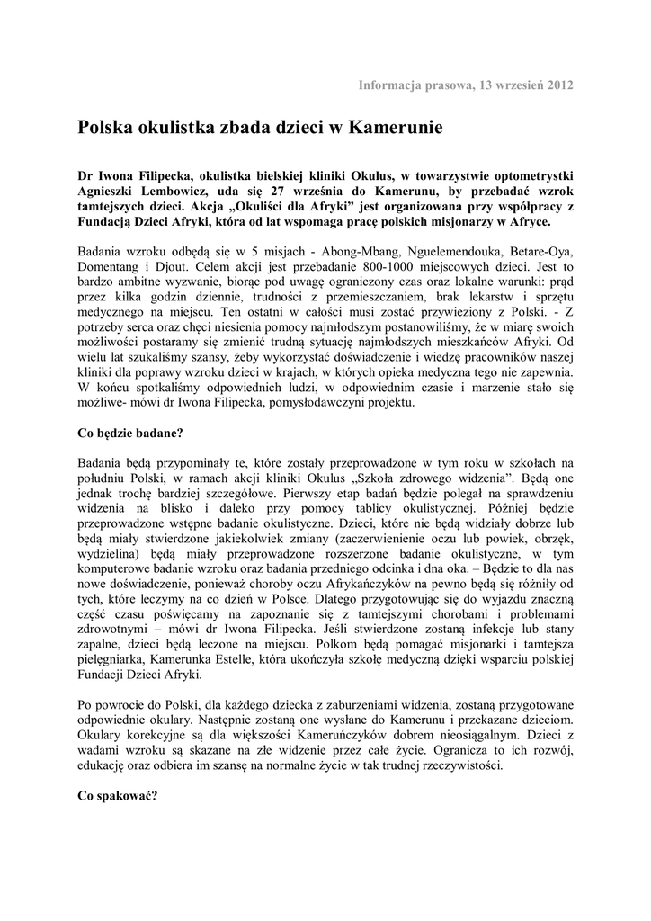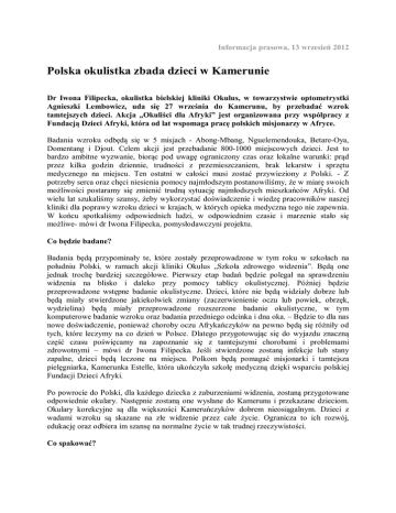Informacja prasowa, 13 wrzesień 2012 Polska okulistka zbada dzieci w Kamerunie Dr Iwona Filipecka, okulistka bielskiej kliniki Okulus, w towarzystwie optometrystki Agnieszki Lembowicz, uda się 27 września do Kamerunu, by przebadać wzrok tamtejszych dzieci. Akcja „Okuliści dla Afryki” jest organizowana przy współpracy z Fundacją Dzieci Afryki, która od lat wspomaga pracę polskich misjonarzy w Afryce. Badania wzroku odbędą się w 5 misjach - Abong-Mbang, Nguelemendouka, Betare-Oya, Domentang i Djout. Celem akcji jest przebadanie 800-1000 miejscowych dzieci. Jest to bardzo ambitne wyzwanie, biorąc pod uwagę ograniczony czas oraz lokalne warunki: prąd przez kilka godzin dziennie, trudności z przemieszczaniem, brak lekarstw i sprzętu medycznego na miejscu. Ten ostatni w całości musi zostać przywieziony z Polski. - Z potrzeby serca oraz chęci niesienia pomocy najmłodszym postanowiliśmy, że w miarę swoich możliwości postaramy się zmienić trudną sytuację najmłodszych mieszkańców Afryki. Od wielu lat szukaliśmy szansy, żeby wykorzystać doświadczenie i wiedzę pracowników naszej kliniki dla poprawy wzroku dzieci w krajach, w których opieka medyczna tego nie zapewnia. W końcu spotkaliśmy odpowiednich ludzi, w odpowiednim czasie i marzenie stało się możliwe- mówi dr Iwona Filipecka, pomysłodawczyni projektu. Co będzie badane? Badania będą przypominały te, które zostały przeprowadzone w tym roku w szkołach na południu Polski, w ramach akcji kliniki Okulus „Szkoła zdrowego widzenia”. Będą one jednak trochę bardziej szczegółowe. Pierwszy etap badań będzie polegał na sprawdzeniu widzenia na blisko i daleko przy pomocy tablicy okulistycznej. Później będzie przeprowadzone wstępne badanie okulistyczne. Dzieci, które nie będą widziały dobrze lub będą miały stwierdzone jakiekolwiek zmiany (zaczerwienienie oczu lub powiek, obrzęk, wydzielina) będą miały przeprowadzone rozszerzone badanie okulistyczne, w tym komputerowe badanie wzroku oraz badania przedniego odcinka i dna oka. – Będzie to dla nas nowe doświadczenie, ponieważ choroby oczu Afrykańczyków na pewno będą się różniły od tych, które leczymy na co dzień w Polsce. Dlatego przygotowując się do wyjazdu znaczną część czasu poświęcamy na zapoznanie się z tamtejszymi chorobami i problemami zdrowotnymi – mówi dr Iwona Filipecka. Jeśli stwierdzone zostaną infekcje lub stany zapalne, dzieci będą leczone na miejscu. Polkom będą pomagać misjonarki i tamtejsza pielęgniarka, Kamerunka Estelle, która ukończyła szkołę medyczną dzięki wsparciu polskiej Fundacji Dzieci Afryki. Po powrocie do Polski, dla każdego dziecka z zaburzeniami widzenia, zostaną przygotowane odpowiednie okulary. Następnie zostaną one wysłane do Kamerunu i przekazane dzieciom. Okulary korekcyjne są dla większości Kameruńczyków dobrem nieosiągalnym. Dzieci z wadami wzroku są skazane na złe widzenie przez całe życie. Ogranicza to ich rozwój, edukację oraz odbiera im szansę na normalne życie w tak trudnej rzeczywistości. Co spakować? Wyjazd do egzotycznego kraju, jakim jest Kamerun wiąże się z wieloma tygodniami przygotowań. Kilka tygodni przed wyjazdem należy przeprowadzić niezbędne szczepienia – m.in. na żółtą febrę, błonicę, tężec, cholerę, czy też wirusowe zapalenie wątroby A i B. Trzeba też kupić leki na malarię, specjalne ubrania „antykomarowe” oraz repelenty zapobiegające ugryzieniom komarów, które przenoszą groźne choroby – Co ciekawe komary przenoszące malarię gryzą od zmierzchu do rana, więc od godz. 16 długi rękaw i długie spodnie są obowiązkowe – tłumaczy dr Iwona Filipecka. Lista rzeczy osobistych będzie jednak ograniczona. Linie lotnicze zezwalają na zabranie tylko 46 kg bagażu i 12 kg bagażu podręcznego. To bardzo niewiele jeśli planuje się otwarcie gabinetu okulistycznego w kraju, gdzie są duże problemy z zakupem podstawowych leków. – Specjalistyczne urządzenia, narzędzia i leki stanowić będą 95 proc. całego naszego bagażu – mówi okulistka z Kliniki Okulus. W Polsce niegroźne, w Afryce powodują ślepotę O tym, że poziom higieny i służby zdrowia w krajach afrykańskich, jest na bardzo niskim poziomie nie trzeba nikogo przekonywać. Często rzeczywistość jest o wiele gorsza od przekazów medialnych i scen z filmów, na podstawie których ludzie budują swoje wyobrażenie o życiu w Afryce. - Zapalenie spojówek może okazać się tam niebezpieczne i spowodować groźne powikłania. Jaglica – choroba, która w Polsce nie istnieje od czasu zakończenia II wojny światowej, w Afryce w XXI wieku dalej jest przyczyną ślepoty. Podobnie jak ślepota rzeczna zabiera wzrok tysiącom ludzi rocznie, a choruje na nią 18 milionów ludzi na świecie. Jest to o tyle frustrujące, że choroby te są absolutnie wyleczalne tłumaczy Iwona Filipecka z bielskiej kliniki, specjalistka chorób oczu. Głód, choroby, brak leków, wody i pożywienia, cierpienieto codzienność mieszkańców Afryki. W dużej części kontynentu opieki zdrowotnej nie ma w ogóle. Większość dzieci nigdy nie miała kontaktu z lekarzem, a o badaniu oczu mało kto słyszał. W samym Kamerunie jest niewielu lekarzy okulistów. Osób zmagających się z chorobami oczu, które można wyleczyć, są tysiące. Lekarze w Afryce Inicjatywa ,,Okuliści dla Afryki” nie jest akcją jednorazową. Klinika Okulus docelowo dąży do stworzenia gabinetu z odpowiednim sprzętem okulistycznym na miejscu. W ten sposób każdy okulista lub optometrysta z Polski lub ze świata, będzie mógł pojechać do Kamerunu i przebadać wzrok dorosłych lub dzieci. W podobny sposób działa akcja ,,Dentysta w Afryce”, której inicjator, doktor Konrad Rylski, zainspirował okulistów z bielskiej kliniki do podjęcia podobnych działań. Doktor Konrad stworzył gabinet stomatologiczny w misji Abong- Mbang. Z pasją i ogromnym zaa