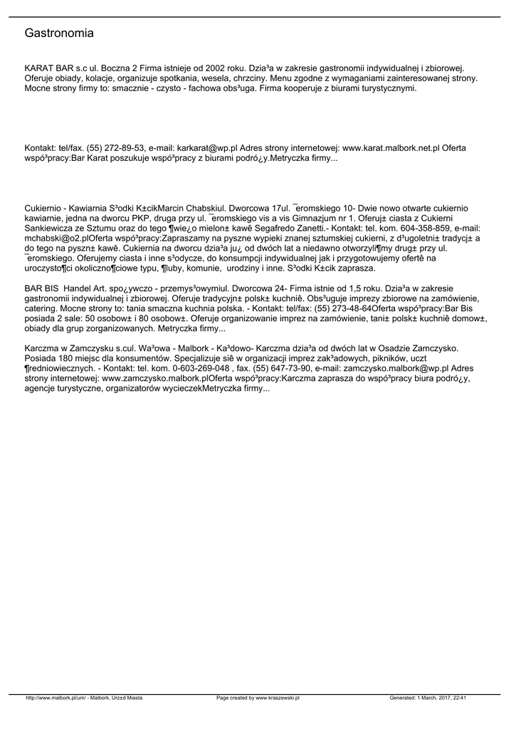 Gastronomia KARAT BAR s.c ul. Boczna 2 Firma istnieje od 2002 roku. Dzia³a w zakresie gastronomii indywidualnej i zbiorowej. Oferuje obiady, kolacje, organizuje spotkania, wesela, chrzciny. Menu zgodne z wymaganiami zainteresowanej strony. Mocne strony firmy to: smacznie - czysto - fachowa obs³uga. Firma kooperuje z biurami turystycznymi. Kontakt: tel/fax. (55) 272-89-53, e-mail: [email protected] Adres strony internetowej: www.karat.malbork.net.pl Oferta wspó³pracy:Bar Karat poszukuje wspó³pracy z biurami podró¿y.Metryczka firmy... Cukiernio - Kawiarnia S³odki K±cikMarcin Chabskiul. Dworcowa 17ul. ¯eromskiego 10- Dwie nowo otwarte cukiernio kawiarnie, jedna na dworcu PKP, druga przy ul. ¯eromskiego vis a vis Gimnazjum nr 1. Oferuj± ciasta z Cukierni Sankiewicza ze Sztumu oraz do tego ¶wie¿o mielon± kawê Segafredo Zanetti.- Kontakt: tel. kom. 604-358-859, e-mail: [email protected] wspó³pracy:Zapraszamy na pyszne wypieki znanej sztumskiej cukierni, z d³ugoletni± tradycj± a do tego na pyszn± kawê. Cukiernia na dworcu dzia³a ju¿ od dwóch lat a niedawno otworzyli¶my drug± przy ul. ¯eromskiego. Oferujemy ciasta i inne s³odycze, do konsumpcji indywidualnej jak i przygotowujemy ofertê na uroczysto¶ci okoliczno¶ciowe typu, ¶luby, komunie, urodziny i inne. S³odki K±cik zaprasza. BAR BIS Handel Art. spo¿ywczo - przemys³owymiul. Dworcowa 24- Firma istnie od 1,5 roku. Dzia³a w zakresie gastronomii indywidualnej i zbiorowej. Oferuje tradycyjn± polsk± kuchniê. Obs³uguje imprezy zbiorowe na zamówienie, catering. Mocne strony to: tania smaczna kuchnia polska. - Kontakt: tel/fax: (55) 273-48-64Oferta wspó³pracy:Bar Bis posiada 2 sale: 50 osobow± i 80 osobow±. Oferuje organizowanie imprez na zamówienie, tani± polsk± kuchniê domow±, obiady dla grup zorganizowanych. Metryczka firmy... Karczma w Zamczysku s.cul. Wa³owa - Malbork - Ka³dowo- Karczma dzia³a od dwóch lat w Osadzie Zamczysko. Posiada 180 miejsc dla konsumentów. Specjalizuje siê w organizacji imprez zak³adowych, pikników, uczt ¶redniowiecznych. - Kontakt: tel. kom. 0-603-269-048 , fax. (55) 647-73-90, e-mail: [email protected] Adres strony internetowej: www.zamczysko.malbork.plOferta wspó³pracy:Karczma zaprasza do wspó³pracy biura podró¿y, agencje turystyczne, organizatorów wycieczekMetryczka firmy... http://www.malbork.pl/um/ - Malbork, Urz±d Miasta Page created by www.kraszewski.pl Generated: 1 March, 2017, 22:41