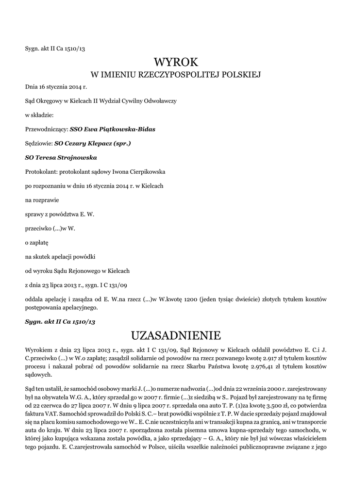 Sygn. akt II Ca 1510/13 WYROK W IMIENIU RZECZYPOSPOLITEJ POLSKIEJ Dnia 16 stycznia 2014 r. Sąd Okręgowy w Kielcach II Wydział Cywilny Odwoławczy w składzie: Przewodniczący: SSO Ewa Piątkowska-Bidas Sędziowie: SO Cezary Klepacz (spr.) SO Teresa Strojnowska Protokolant: protokolant sądowy Iwona Cierpikowska po rozpoznaniu w dniu 16 stycznia 2014 r. w Kielcach na rozprawie sprawy z powództwa E. W. przeciwko (...)w W. o zapłatę na skutek apelacji powódki od wyroku Sądu Rejonowego w Kielcach z dnia 23 lipca 2013 r., sygn. I C 131/09 oddala apelację i zasądza od E. W.na rzecz (...)w W.kwotę 1200 (jeden tysiąc dwieście) złotych tytułem kosztów postępowania apelacyjnego. Sygn. akt II Ca 1510/13 UZASADNIENIE Wyrokiem z dnia 23 lipca 2013 r., sygn. akt I C 131/09, Sąd Rejonowy w Kielcach oddalił powództwo E. C.i J. C.przeciwko (...) w W.o zapłatę; zasądził solidarnie od powodów na rzecz pozwanego kwotę 2.917 zł tytułem kosztów procesu i nakazał pobrać od powodów solidarnie na rzecz Skarbu Państwa kwotę 2.976,41 zł tytułem kosztów sądowych. Sąd ten ustalił, że samochód osobowy marki J. (...)o numerze nadwozia (...)od dnia 22 września 2000 r. zarejestrowany był na obywatela W.G. A., który sprzedał go w 2007 r. firmie (...)z siedzibą w S.. Pojazd był zarejestrowany na tę firmę od 22 czerwca do 27 lipca 2007 r. W dniu 9 lipca 2007 r. sprzedała ona auto T. P. (1)za kwotę 3.500 zł, co potwierdza faktura VAT. Samochód sprowadził do Polski S. C.– brat powódki wspólnie z T. P. W dacie sprzedaży pojazd znajdował się na placu komisu samochodowego we W.. E. C.nie uczestniczyła ani w transakcji kupna za granicą, ani w transporcie auta do kraju. W dniu 23 lipca 2007 r. sporządzona została pisemna umowa kupna-sprzedaży tego samochodu, w której jako kupująca wskazana została powódka, a jako sprzedający – G. A., który nie był już wówczas właścicielem tego pojazdu. E. C.zarejestrowała samochód w Polsce, uiściła wszelkie należności publicznoprawne związane z jego sprowadzeniem zza granicy, a w dniu 14 września 2007 r. darowała na rzecz swojego ojca J. C.udział do 1/2 we współwłasności tego pojazdu. W dniu 3 kwietnia 2008 r. powódka zawarła z pozwanym umowę ubezpieczenia autocasco wskazanego samochodu na okres od 3 kwietnia 2008 r. do 2 kwietnia 2009 r. Suma ubezpieczenia ustalona została na kwotę 44.000 zł. Dnia 8 czerwca 2008 r. pojazd ten został skradziony. Dochodzenie w sprawie zostało umorzone prawomocnym postanowieniem Policji z dnia 20 czerwca 2009 r. w sprawie RSD 76/08, zatwierdzonym przez prokuratora – wobec niewykrycia sprawców przestępstwa. Decyzją Prezydenta Miasta K.z dnia 23 października 2008 r., nr (...), pojazd ten został wyrejestrowany. Jego wartość rynkowa w dacie powstania szkody wynosiła 37.500 zł. Powódka zgłosiła pozwanemu kradzież samochodu. W toku postępowania likwidacyjnego ubezpieczyciel wystąpił do firmy (...), której właścicielką jest A. U.z prośbą o sprawdzenie pochodzenia samochodu, uzyskując informację, iż sprzedającym pojazd we W.nie była osoba wskazana w umowie z dnia 23 lipca 2007 r., ale firma (...). Sprzedawca pojazdu przesłał tej firmie kopię faktury oraz kopię paszportu T. P., którym legitymował się w chwili zawarcia umowy. Po przeprowadzeniu postępowania likwidacyjnego, pismem z dnia 19 listopada 2008 r. pozwany odmówił powódce wypłaty odszkodowania, powołując się na § 8 ust. 3 pkt 6 ogólnych warunków ubezpieczenia pojazdów autocasco, zgodnie z którym ubezpieczeniem nie są objęte szkody w pojeździe wprowadzonym nielegalnie w polski obszar celny, tj. wtedy, gdy pojazd nie został dostarczony lub zgłoszony do miejsca odprawy celnej albo w zgłoszeniu celnym lub innym dokumencie podano nieprawdziwe informacje dotyczące pojazdu. Ubezpieczyciel podniósł, że umowa kupnasprzedaży a 23 lipca 2007 r. zawarta między powódką a A. G.została sfałszowana. Sąd pierwszej instancji, uznając, że samochód powódki został skradziony, a tym samym powstała szkoda objęta ochroną autocasco udzieloną przez pozwanego, przyjął, że nieprawdziwa była podana zakładowi ubezpieczeń przez powódkę informacja o przysługującym jej prawie własności pojazdu. Zdaniem Sądu, umowa z dnia 23 lipca 2007 r. została sfałszowana, bowiem w tej dacie G. A. nie był właścicielem samochodu. Oceniając skuteczność tej umowy, Sąd uznał, że na podstawie art. 24 § 2 ustawy z dnia 12 listopada 1965 r. – Prawo prywatne międzynarodowe, zastosowanie mają przepisy prawa włoskiego, w szczególności Kodeksu cywilnego (Codice Civile), przyjętego Dekretem Królewskim z dnia 16 marca 1942 r. W świetle tych przepisów powódka, jako nabywca rzeczy, podlegającej wpisowi do rejestru publicznego, od osoby już uprzednio w rejestrze takim ujawnionej, może nabyć własność wyłącznie w drodze zasiedzenia zgodnie włoskim porządkiem prawnym. Nabycie pojazdu od osoby innej niż figurująca w publicznym rejestrze nie może być poczytane za nabycie w dobrej wierze, a zatem obowiązuje 10letni termin zasiedzenia. Skoro umowę zawarto w lipcu 2007 r., to powódka mogłaby stać się właścicielem nabytego na jej podstawie od nieuprawnionego samochodu dopiero w 2017 r. Sąd uznał również, mając na względzie przepis art. 169 § 1 k.c., że umowa darowizny na rzecz J. C. udziału do 1/2 we współwłasności samochodu, dokonana w dniu 14 września 2007 r. przez E. C., nie doszła do skutku, bowiem nie została spełniona przesłanka objęcia rzeczy w posiadanie przez nabywcę. Jak wynika z zeznań powodów, umowa ta miała na celu wyłącznie uzyskanie przez powódkę zniżek ubezpieczeniowych, nie było zaś jej istotą uzyskanie przez ojca powódki uprawnienia do współkorzystania z pojazdu. Wszystkie te okoliczności wskazują, że przekazana przez ubezpieczających informacja o przysługującym im prawie własności pojazdu była 