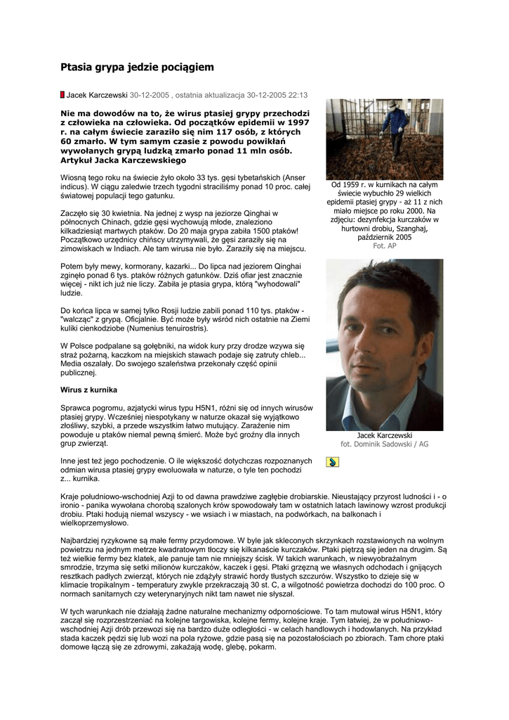 Ptasia grypa jedzie pociągiem Jacek Karczewski 30-12-2005 , ostatnia aktualizacja 30-12-2005 22:13 Nie ma dowodów na to, że wirus ptasiej grypy przechodzi z człowieka na człowieka. Od początków epidemii w 1997 r. na całym świecie zaraziło się nim 117 osób, z których 60 zmarło. W tym samym czasie z powodu powikłań wywołanych grypą ludzką zmarło ponad 11 mln osób. Artykuł Jacka Karczewskiego Wiosną tego roku na świecie żyło około 33 tys. gęsi tybetańskich (Anser indicus). W ciągu zaledwie trzech tygodni straciliśmy ponad 10 proc. całej światowej populacji tego gatunku. Zaczęło się 30 kwietnia. Na jednej z wysp na jeziorze Qinghai w północnych Chinach, gdzie gęsi wychowują młode, znaleziono kilkadziesiąt martwych ptaków. Do 20 maja grypa zabiła 1500 ptaków! Początkowo urzędnicy chińscy utrzymywali, że gęsi zaraziły się na zimowiskach w Indiach. Ale tam wirusa nie było. Zaraziły się na miejscu. Od 1959 r. w kurnikach na całym świecie wybuchło 29 wielkich epidemii ptasiej grypy - aż 11 z nich miało miejsce po roku 2000. Na zdjęciu: dezynfekcja kurczaków w hurtowni drobiu, Szanghaj, październik 2005 Fot. AP Potem były mewy, kormorany, kazarki... Do lipca nad jeziorem Qinghai zginęło ponad 6 tys. ptaków różnych gatunków. Dziś ofiar jest znacznie więcej - nikt ich już nie liczy. Zabiła je ptasia grypa, którą "wyhodowali" ludzie. Do końca lipca w samej tylko Rosji ludzie zabili ponad 110 tys. ptaków "walcząc" z grypą. Oficjalnie. Być może były wśród nich ostatnie na Ziemi kuliki cienkodziobe (Numenius tenuirostris). W Polsce podpalane są gołębniki, na widok kury przy drodze wzywa się straż pożarną, kaczkom na miejskich stawach podaje się zatruty chleb... Media oszalały. Do swojego szaleństwa przekonały część opinii publicznej. Wirus z kurnika Sprawca pogromu, azjatycki wirus typu H5N1, różni się od innych wirusów ptasiej grypy. Wcześniej niespotykany w naturze okazał się wyjątkowo złośliwy, szybki, a przede wszystkim łatwo mutujący. Zarażenie nim powoduje u ptaków niemal pewną śmierć. Może być groźny dla innych grup zwierząt. Jacek Karczewski fot. Dominik Sadowski / AG Inne jest też jego pochodzenie. O ile większość dotychczas rozpoznanych odmian wirusa ptasiej grypy ewoluowała w naturze, o tyle ten pochodzi z... kurnika. Kraje południowo-wschodniej Azji to od dawna prawdziwe zagłębie drobiarskie. Nieustający przyrost ludności i - o ironio - panika wywołana chorobą szalonych krów spowodowały tam w ostatnich latach lawinowy wzrost produkcji drobiu. Ptaki hodują niemal wszyscy - we wsiach i w miastach, na podwórkach, na balkonach i wielkoprzemysłowo. Najbardziej ryzykowne są małe fermy przydomowe. W byle jak skleconych skrzynkach rozstawionych na wolnym powietrzu na jednym metrze kwadratowym tłoczy się kilkanaście kurczaków. Ptaki piętrzą się jeden na drugim. Są też wielkie fermy bez klatek, ale panuje tam nie mniejszy ścisk. W takich warunkach, w niewyobrażalnym smrodzie, trzyma się setki milionów kurczaków, kaczek i gęsi. Ptaki grzęzną we własnych odchodach i gnijących resztkach padłych zwierząt, których nie zdążyły strawić hordy tłustych szczurów. Wszystko to dzieje się w klimacie tropikalnym - temperatury zwykle przekraczają 30 st. C, a wilgotność powietrza dochodzi do 100 proc. O normach sanitarnych czy weterynaryjnych nikt tam nawet nie słyszał. W tych warunkach nie działają żadne naturalne mechanizmy odpornościowe. To tam mutował wirus H5N1, który zaczął się rozprzestrzeniać na kolejne targowiska, kolejne fermy, kolejne kraje. Tym łatwiej, że w południowowschodniej Azji drób przewozi się na bardzo duże odległości - w celach handlowych i hodowlanych. Na przykład stada kaczek pędzi się lub wozi na pola ryżowe, gdzie pasą się na pozostałościach po zbiorach. Tam chore ptaki domowe łączą się ze zdrowymi, zakażają wodę, glebę, pokarm. Wkrótce wirus wydostał się z kurników i zaczął zabijać dzikie ptaki. Fakt ten, do tej pory przemilczany przez nasze media, może mieć dramatyczne znaczenie dla wszystkich dzikich ptaków. Dla ludzi i całej Ziemi. Martwe ptaki nie latają Od czasu wykrycia wirusa przed ośmiu laty potwierdzono tylko trzy przypadki H5N1 u dzikich ptaków. W południowo--wschodniej Azji znaleziono zwłoki mewy srebrzystej, sokoła wędrownego i kleszczaka indyjskiego (bliskiego krewnego naszych bocianów). Wszystkie trzy ptaki przed śmiercią miały kontakt z drobiem hodowlanym. Zabójcza wersja ptasiej grypy wciąż się rozprzestrzeniała, ale trzymała się kurników. Przełom nastąpił w tym roku. Również przełom medialny. W północnych Chinach, a później w Mongolii i Kazachstanie znaleziono martwe dzikie ptaki zarażone wirusem typu H5N1. Było ich na tyle dużo, że wreszcie można było obwołać "winnego" - dzikie ptactwo. Odkąd ludzie wprowadzili H5N1 do natury, nie można wykluczyć, że dzikie ptaki miały swój udział w rozprzestrzenianiu grypy, ale ich rola była znikoma. Jedno jest pewne: zarażone ptaki nie są w stanie polecieć daleko, martwe - nie latają. Nie można natomiast nie docenić roli człowieka w rozprzestrzenianiu epidemii. Niewyobrażalnie przepełnione fermy na wolnym powietrzu, tłoczne targowiska, ciągła wymiana handlowa, gdzie w obrocie jest zarówno żywy drób, wszelkie jego przetwory, jak i martwy inwentarz - zjadają go świnie, nawozi się nim pola, przerabia na mączkę... Bardzo podobny scenariusz mieliśmy zaledwie kilka lat temu - wtedy nazywał się chorobą szalonych krów. Tymczasem statystyki pokazują, że jest coraz gorzej. Od 1959 r. w kurnikach na całym świecie wybuchło 29 wielkich epidemii. 21 z nich miało miejsce po roku 1990. Aż 11 - po 2000! Tam, gdzie dotarł H5N1, władze zarządzały wybijanie stad hodowlanych. Taka polityka nie zawsze jednak spotyka się z akceptacją hodowców. Rosyjskie "Nowosti" 