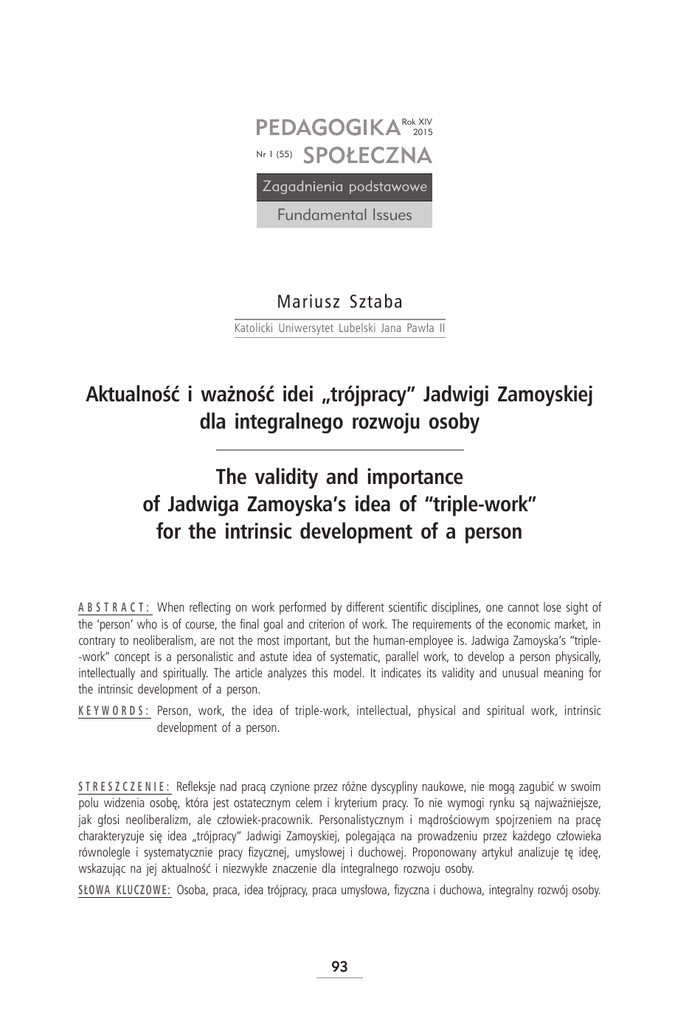 Rok XIV 2015 Nr 1 (55) Fundamental Issues Mariusz Sztaba Katolicki Uniwersytet Lubelski Jana Pawła II Aktualność i ważność idei „trójpracy” Jadwigi Zamoyskiej dla integralnego rozwoju osoby The validity and importance of Jadwiga Zamoyska’s idea of “triple-work” for the intrinsic development of a person A B S T R A C T : When reflecting on work performed by different scientific disciplines, one cannot lose sight of the ‘person’ who is of course, the final goal and criterion of work. The requirements of the economic market, in contrary to neoliberalism, are not the most important, but the human-employee is. Jadwiga Zamoyska’s “triple-work” concept is a personalistic and astute idea of systematic, parallel work, to develop a person physically, intellectually and spiritually. The article analyzes this model. It indicates its validity and unusual meaning for the intrinsic development of a person. K E Y W O R D S : Person, work, the idea of triple-work, intellectual, physical and spiritual work, intrinsic development of a person. S T R E S Z C Z E N I E : Refleksje nad pracą czynione przez różne dyscypliny naukowe, nie mogą zagubić w swoim polu widzenia osobę, która jest ostatecznym celem i kryterium pracy. To nie wymogi rynku są najważniejsze, jak głosi neoliberalizm, ale człowiek-pracownik. Personalistycznym i mądrościowym spojrzeniem na pracę charakteryzuje się idea „trójpracy” Jadwigi Zamoyskiej, polegająca na prowadzeniu przez każdego człowieka równolegle i systematycznie pracy fizycznej, umysłowej i duchowej. Proponowany artykuł analizuje tę ideę, wskazując na jej aktualność i niezwykłe znaczenie dla integralnego rozwoju osoby. SŁOWA KLUCZOWE: Osoba, praca, idea trójpracy, praca umysłowa, fizyczna i duchowa, integralny rozwój osoby. 93 Mariusz Sztaba Praca jest ważnym aspektem życia i działania człowieka. Jednak jak wykazuje historia, w ciągu dziejów była (i nadal jest) fałszowana i narażona na wiele niebezpieczeństw. Wydaje się, że tak jak po 1989 r. w Polsce wyraźnie mówiono o potrzebie „pracy nad pracą”1 w związku z końcem ustroju komunistycznego2, tak dzisiaj w dobie globalizmu i związanego z nim swoistego zawirowania wokół pracy3, należy podjąć na nowo tę samą ideę w kontekście wychowania do pracy i przez pracę. Współczesny, interdyscyplinarny namysł nad pracą powinien służyć rozwiązaniu problemu, który można wyrazić pytaniem: czy, kiedy i jaka praca autentycznie służy integralnemu rozwojowi osoby? Badacze omawianego zjawiska zdając sobie sprawę z funkcji przedmiotowej, społecznej i ekonomicznej pracy (Kalinowski i in. 2005, s. 9–44), szczególną uwagę powinni poświęcać funkcji podmiotowej pracy, pamiętając o podstawowej zasadzie, że „pierwszą podstawową wartością pracy jest sam człowiek – jej podmiot. Wiąże się z tym od razu bardzo ważny wniosek natury etycznej: o ile prawdą jest, że człowiek jest przeznaczony i powołany do pracy, to jednak nade wszystko praca jest «dla człowieka», a nie człowiek «dla pracy»” (Jan Paweł II 1981, nr 6). W rozwiązywaniu powyżej zasygnalizowanego problemu pomocną i wielce inspirującą jest idea „trójpracy” Jadwigi Zamoyskiej, którą prezentuje poniższy artykuł4. Na początku zostanie ukazana chrześcijańska inspira 1 Po raz pierwszy użył tego sformułowania ks. Józef Tischner we wrześniu 1981 roku, podczas Mszy św. odbywającej się w hali „Olivia”, w ramach pierwszego zjazdu „Solidarności”, podkreślając wówczas, że „kluczem do niepodległości Polski jest praca nad pracą”. Szczególną pracę nad pracą w Polsce podjął Jan Paweł II podczas pielgrzymek do Ojczyzny w roku 1983 i 1987, kiedy to wielokrotnie uczył o godności pracy i człowieka pracy, mówiąc o „ewangelii pracy”. Samego zaś wyrażenia „praca nad pracą” Papież użył 11 czerwca 1987 r. podczas homilii w Szczecinie, wygłoszonej na Mszy w intencji rodzin. 2 Chociaż ustrój komunistyczny deklarował się jako oparty na pracy i sama praca była główną kategorią dla filozofów marksistowskich, to paradoksalnie w żadnym innym ustroju nie nastąpiła taka deprecjacja pracy i alienacja człowieka przez nią, jak w komunizmie (Gałkowski 2012, s. 125–126). 3 Współczesne społeczeństwo jest nazywane społeczeństwem pracy. Jednak pod wpływem technologii informatycznych i telekomunikacyjnych oraz globalnych sił rynkowych, wartość rynkowa pracy ludzkiej zmniejsza się. Widoczne są także procesy odstandaryzowania pracy zarobkowej, jej czasu i miejsca. Pojawiają się nowe formy zatrudnienia (wynajmowanie pracowników, job-sharing, korzystanie z usług osoby samozatrudnionej, korzystanie z osoby wykonującej prace w domu, zatrudnienie na podstawie umowy stażowej itd.) i nietypowe systemy czasu pracy (skrócony tydzień pracy, system pracy weekendowej). W dobie globalizmu dochodzi do przestrzennego i czasowego rozdzielenia procesów pracy i produkcji (Bogaj 2007, s. 53–56). 4 W artykule stosuję zamiennie pojęcia „trójpraca” i „potrójna praca”, gdyż są tożsame, co do zakresu i treści. 94 Aktualność i ważność idei „trójpracy” Jadwigi Zamoyskiej... cja analizowanej idei. Kolejno czytelnik zapozna się z ogólną koncepcją pracy w myśli omawianej Autorki, ze szczególnym uwzględnieniem jej personalistycznego i mądrościowego charakteru. Następnie zostanie poddana analizie treść i zakres pojęcia „trójpraca”. Całość refleksji dopełnią pedagogiczne wnioski i postulaty. Chrześcijańska inspiracja idei „trójpracy” Wielki wpływ na wydobycie różnorodnych funkcji pracy, ukazujących jej wieloaspektowość i osobową wartość oraz godność, ma społeczna nauka Kościoła oraz naukowy namysł nad nią w postaci katolickiej nauki społecznej (Papieska Rada Iustitia et Pax 2005, nr 255–322)5. Od początku chrześcijaństwa, prawie każdy liczący 