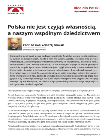Idee dla Polski obywatelski thinkletter Polska nie jest czyjąś własnością, a naszym wspólnym dziedzictwem PROF. DR HAB. ANDRZEJ NOWAK Uniwersytet Jagielloński Zamiast koncentrować się na budowie wspólnoty Polaków, wielu z nas funkcjonuje w swoich podwspólnotach. Każda z nich ma własną gazetę, telewizję oraz portale internetowe. Ze swoimi pobratymcami rozumiemy się w pół słowa, a kto nie z nami, ten przeciwko nam. Wiemy doskonale, co dla Polski jest najlepsze, będąc głuchymi na opinie innych. Tymczasem Polska nie jest czyjąś własnością – nie ma właściciela Polski i nikt nie mówi w jej imieniu. Jest ona dziedzictwem, które dostaliśmy od tych, którzy byli tu przed nami. To, co pozostawimy po sobie przyszłym pokoleniom, zależy tylko i wyłącznie od nas. Będzie to w dużej mierze wynikało z używanego przez nas języka. Czy nadal będziemy go nasączali złymi emocjami oraz pogardą dla drugiej strony? Czy nie boimy się, że różnica między nami doprowadzi kiedyś do przejścia od złych słów do złych czynów? Tekst przemówienia wygłoszonego podczas XI Kongresu Obywatelskiego, 5 listopada 2016 r. To, jak budować wspólnotę Polaków, jest dziś tematem niezwykle palącym. Niewiele jest w Polsce miejsc, w których wspólnota ponad podziałami jeszcze istnieje. Przeciwnie – sami siebie zamykamy w grupach integracji, podwspólnotach, tworzymy coś na wzór gett. Jedno getto czyta jedną gazetę, drugie inną. Jedno getto ma jeden portal, drugie inny. Jedno getto ma jedną telewizję, drugie inną. To, co zmieniło się w stosunku do sytuacji sprzed 20 lat, to to, że można dziś doskonale funkcjonować w swoim getcie, mając do czynienia ze stereotypowym, wrogim oczywiście obrazem drugiego getta. Satysfakcjonuje nas to. W takich warunkach język wspólnoty jest nam do niczego niepotrzebny – tworzymy przecież podwspólnotę, w której rozumiemy się świetnie w pół słowa. Wiemy, że ci drudzy są paskudni, gorsi od nas i nie ma co się trudzić rozmową z nimi. Paradoksalnie w sukurs tej przykrej sytuacji przyszła nowoczesność. Dwie dekady temu w telewizji było raptem kilka programów publicystyczno‑informacyjnych, które oglądaliśmy wszyscy, strona 1/4 www.kongresobywatelski.pl Idee dla Polski obywatelski thinkletter niezależnie od opcji politycznej. Odnosiliśmy się do nich krytycznie, ale tworzyło to jeden kanon. Teraz to się zmieniło i choć pluralistyczne media zapewniają nam różnorodność opinii, to rodzą też niebezpieczeństwo zamykania nas, izolowania w pewnych wewnętrznych wspólnotach, które nie są tożsame z budowaną na tej ziemi od kilkudziesięciu pokoleń wspólnotą Polaków. Cóż zatem zrobić, aby spróbować zasypać przepaść, jaką sami sobie wykopaliśmy? Postawiłbym co najmniej kilka warunków. Pierwszym z nich jest przyjęcie do wiadomości, że Polska nie jest czyjąś własnością. Nie ma właściciela Polski i nikt nie mówi w jej imieniu. Żadna partia, żadna gazeta ani żadna telewizja. Polska jest bowiem dziedzictwem. A my możemy się okazać godni tego dziedzictwa, jeżeli uznamy je za pewne zadanie oraz przystaniemy na to, że inni nasi rodacy są takimi samymi jak my dziedzicami i także mogą się tego zadania godnie podjąć. ““ Polska nie jest czyjąś własnością. Nie ma właściciela Polski i nikt nie mówi w jej imieniu. Żadna partia, żadna gazeta ani żadna telewizja. Polska jest dziedzictwem, o które powinniśmy dbać my wszyscy. Po drugie, skoro Polska jest dziedzictwem, to znaczy, że była budowana historycznie przez wiele, wiele pokoleń. Dostaliśmy ją w powiernictwo od tych, którzy byli przed nami, a teraz nasza kolej na dołożenie swojej cegiełki. Pamiętajmy przy tym, że właściciel posiadający pełnię praw właścicielskich może robić, co chce – to zbudować i naprawić, to wyrzucić i podeptać. Dziedzic tak postępować nie może, bo ma świadomość, że to, co ma, dostał w spadku po rodzicach, dziadkach i wielu pokoleniach wstecz. Rozumie, że jego przodkowie wykonali wielką pracę, którą on powinien kontynuować i przekazać później dalej. Po trzecie, jeśli mamy nasze zadanie związane z dziedzictwem Polski dobrze realizować, powinniśmy być świadomi pewnej istotnej zasady obowiązującej w republikach: Tantum intende in Republica, quantum tuis civibus probavi possis – „Tyle zamierzaj w Rzeczypospolitej, ile swoich obywateli możesz przekonać”. Oznacza to nie więcej niż tyle, że przemocą, lekceważeniem, podejściem „państwo jest moje, więc mogę zrobić z nim wszystko, co chcę”, niczego nie osiągniemy. Możemy zrobić tylko tyle, do czego uda nam się przekonać pozostałych obywateli. Nie zdołamy tego uczynić bez odpowiedzialnego używania języka. W trakcie rozmów nigdy nikogo osobiście nie obrażajmy, nie uderzajmy w jego godność. Wszak walczymy o sprawę, a nie z ludźmi. Tę rzecz czasem bardzo trudno jest nam rozróżnić. Warto o tym pamiętać – ten drugi człowiek, z którym się spotykamy, ma swoją osobistą godność. Jeżeli atakuję go, bądź też jego godność, to niszczę możliwość porozumienia. To, o co walczę, na pewno na tym nie zyska. strona 2/4 www.kongresobywatelski.pl Idee dla Polski obywatelski thinkletter ““ Ten drugi człowiek, z którym się spotykamy, ma swoją osobistą godność. Jeżeli atakuję go, bądź też jego godność, to niszczę możliwość porozumienia. To, o co walczę, na pewno na tym nie zyska. Podejmując rozmowę, pamiętajmy też o własnych ograniczeniach. Nie lubimy mówić o własnych błędach, wolimy przywoływać cudze. Dlatego jeśli przyznajemy się do słabości albo dopuszczamy ich możliwość, mówmy o nich zawsze w pierwszej osobie liczby pojedynczej. Nigdy my, ani wy – tylko, co ja zrobiłem źle. W innym wypadku może to zabrzmieć nieautentyczne. Bo gdy ktoś powie: „My, Polacy, robimy okropne rzeczy”, to czy będzie 