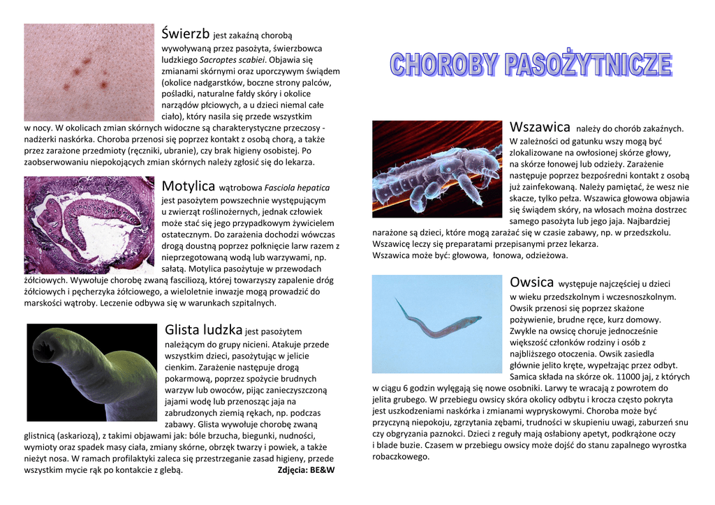 Świerzb jest zakaźną chorobą wywoływaną przez pasożyta, świerzbowca ludzkiego Sacroptes scabiei. Objawia się zmianami skórnymi oraz uporczywym świądem (okolice nadgarstków, boczne strony palców, pośladki, naturalne fałdy skóry i okolice narządów płciowych, a u dzieci niemal całe ciało), który nasila się przede wszystkim w nocy. W okolicach zmian skórnych widoczne są charakterystyczne przeczosy nadżerki naskórka. Choroba przenosi się poprzez kontakt z osobą chorą, a także przez zarażone przedmioty (ręczniki, ubranie), czy brak higieny osobistej. Po zaobserwowaniu niepokojących zmian skórnych należy zgłosić się do lekarza. Motylica wątrobowa Fasciola hepatica jest pasożytem powszechnie występującym u zwierząt roślinożernych, jednak człowiek może stać się jego przypadkowym żywicielem ostatecznym. Do zarażenia dochodzi wówczas drogą doustną poprzez połknięcie larw razem z nieprzegotowaną wodą lub warzywami, np. sałatą. Motylica pasożytuje w przewodach żółciowych. Wywołuje chorobę zwaną fasciliozą, której towarzyszy zapalenie dróg żółciowych i pęcherzyka żółciowego, a wieloletnie inwazje mogą prowadzić do marskości wątroby. Leczenie odbywa się w warunkach szpitalnych. Glista ludzka jest pasożytem należącym do grupy nicieni. Atakuje przede wszystkim dzieci, pasożytując w jelicie cienkim. Zarażenie następuje drogą pokarmową, poprzez spożycie brudnych warzyw lub owoców, pijąc zanieczyszczoną jajami wodę lub przenosząc jaja na zabrudzonych ziemią rękach, np. podczas zabawy. Glista wywołuje chorobę zwaną glistnicą (askariozą), z takimi objawami jak: bóle brzucha, biegunki, nudności, wymioty oraz spadek masy ciała, zmiany skórne, obrzęk twarzy i powiek, a także nieżyt nosa. W ramach profilaktyki zaleca się przestrzeganie zasad higieny, przede wszystkim mycie rąk po kontakcie z glebą. Zdjęcia: BE&W Wszawica należy do chorób zakaźnych. W zależności od gatunku wszy mogą być zlokalizowane na owłosionej skórze głowy, na skórze łonowej lub odzieży. Zarażenie następuje poprzez bezpośredni kontakt z osobą już zainfekowaną. Należy pamiętać, że wesz nie skacze, tylko pełza. Wszawica głowowa objawia się świądem skóry, na włosach można dostrzec samego pasożyta lub jego jaja. Najbardziej narażone są dzieci, które mogą zarażać się w czasie zabawy, np. w przedszkolu. Wszawicę leczy się preparatami przepisanymi przez lekarza. Wszawica może być: głowowa, łonowa, odzieżowa. Owsica występuje najczęściej u dzieci w wieku przedszkolnym i wczesnoszkolnym. Owsik przenosi się poprzez skażone pożywienie, brudne ręce, kurz domowy. Zwykle na owsicę choruje jednocześnie większość członków rodziny i osób z najbliższego otoczenia. Owsik zasiedla głównie jelito kręte, wypełzając przez odbyt. Samica składa na skórze ok. 11000 jaj, z których w ciągu 6 godzin wylęgają się nowe osobniki. Larwy te wracają z powrotem do jelita grubego. W przebiegu owsicy skóra okolicy odbytu i krocza często pokryta jest uszkodzeniami naskórka i zmianami wypryskowymi. Choroba może być przyczyną niepokoju, zgrzytania zębami, trudności w skupieniu uwagi, zaburzeń snu czy obgryzania paznokci. Dzieci z reguły mają osłabiony apetyt, podkrążone oczy i blade buzie. Czasem w przebiegu owsicy może dojść do stanu zapalnego wyrostka robaczkowego. Toksoplazmoza Toxoplasma gondii to pierwotniak, którego żywicielem pośrednim jest człowiek, a żywicielami ostatecznymi są koty domowe. Człowiek zaraża się oocystami wydalonymi z kałem przez koty. Oocysty powszechnie występują w glebie poprzez którą zanieczyszczają warzywa oraz owoce. Zakażenie następuje także przez zjedzenie surowego bądź niedogotowanego mięsa. U zdrowych osób, wskutek powstania specyficznych przeciwciał, infekcja ulega samoistnemu wygaszeniu. Choroba może mieć ciężki przebieg u osób z obniżoną odpornością, na przykład w przebiegu AIDS. Jest szczególnie groźna dla rozwijającego się płodu, do infekcji dochodzi przez łożysko. Przyjmuje się, że do zakażenia płodu dochodzi tylko wtedy, gdy kobieta ciężarna choruje w ciąży po raz pierwszy i nie wytworzyła jeszcze odporności. Do zakażeń dochodzi u 50% nieleczonych matek. Ryzyko zakażenia płodu rośnie wraz z czasem trwania ciąży. Tasiemiec jest przyczyną pasożytniczego zakażenia przewodu pokarmowego człowieka. Tasiemczyca jest chorobą odzwierzęcą, do zakażenia dochodzi poprzez spożycie mięsa zawierającego tzw. wągry, czyli postacie przetrwalnikowe pasożyta. Zakażenie może przebiegać bezobjawowo, może jednak objawiać się bólami brzucha, nudnościami, ogólnym osłabieniem, brakiem apetytu i chudnięciem. Dolegliwości te najczęściej występują u zakażonych dzieci. Człony tasiemca mogą być okresowo zauważalne w kale, jako cienkie, prostokątne, cieliste płatki. W celu uniknięcia zakażenia należy spożywać tylko przebadane weterynaryjnie mięso, uważać z jedzeniem surowego i niedogotowanego mięsa oraz przestrzegać ogólnych zasad higieny. Lamblioza Giardia lamblia należy do kosmopolitycznych pierwotniaków z grupy wiciowców. U człowieka pasożytuje w jelicie cienkim, pęcherzyku żółciowym, drogach żółciowych lub w wyrostku robaczkowym. Wywołuje lambliozę, jedną z najczęstszych chorób pasożytniczych u dzieci. Objawami występowania lamblii w organizmie są najczęściej dolegliwości żołądkowo-jelitowe, w postaci nudności, bólów żołądka lub w okolic pęcherzyka żółciowego. U dzieci mogą występować także zaburzenia trawienia i biegunki na zmianę z zaparciami. Zdarzają się również krótkotrwałe gorączki oraz wysypki alergiczne. Zdarza się jednak, że zakażenie przebiega bezobjawowo. O rodzaju leczenia musi zdecydować lekarz. Malaria (zimnica) jest zakaźną, tropikalną chorobą pasożytniczą wywoływaną przez jednokomórkowe p