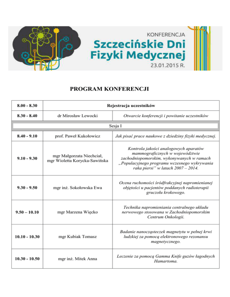 PROGRAM KONFERENCJI 8.00 - 8.30 8.30 - 8.40 Rejestracja uczestników dr Mirosław Lewocki Otwarcie konferencji i powitanie uczestników Sesja I prof. Paweł Kukołowicz Jak pisać prace naukowe z dziedziny fizyki medycznej. mgr Małgorzata Niechciał, mgr Wioletta Korycka-Sawińska Kontrola jakości analogowych aparatów mammograficznych w województwie zachodniopomorskim, wykonywanych w ramach „Populacyjnego programu wczesnego wykrywania raka piersi” w latach 2007 – 2014. mgr inż. Sokołowska Ewa Ocena ruchomości śródfrakcyjnej napromienianej objętości u pacjentów poddanych radioterapii gruczołu krokowego. 9.50 – 10.10 mgr Marzena Więcko Technika napromieniania centralnego układu nerwowego stosowana w Zachodniopomorskim Centrum Onkologii. 10.10 - 10.30 mgr Kubiak Tomasz Badanie nanocząsteczek magnetytu w pełnej krwi ludzkiej za pomocą elektronowego rezonansu magnetycznego. 10.30 - 10.50 mgr inż. Mitek Anna Leczenie za pomocą Gamma Knife guzów łagodnych Hamartoma. 8.40 - 9.10 9.10 - 9.30 9.30 - 9.50 10.50 – 11.10 Przerwa kawowa Sesja II 11.10 - 11.40 prof. Krzyminiewski Ryszard Pulsoksymetria wysokiej rozdzielczości sygnałowej (HSR-PW) – nieinwazyjna metoda diagnostyczna chorób układu krążenia. 11.40 - 12.00 dr Dobosz Bernadeta Badanie funkcjonalizowanych nanocząstek metodą elektronowego rezonansu paramagnetycznego. 12.00 - 12.20 12.20 - 12.40 12.40 - 13.00 Brazevic Sabina mgr Szuflitowska Beata dr Staroń Waldemar 13.00 - 13.20 Zmiany w rejestracji EKG u chorych na cukrzycę zakwalifikowanych do operacji pomostowania aortalno-wieńcowego. Zastosowanie właściwości elektrycznych komórek nowotworowych w diagnostyce i monitorowaniu leczenia. Rozkłady dyspersyjne powierzchni obiektów występujących w prawidłowym płynie mózgowordzeniowym. Przerwa na lunch Sesja III 13.20 - 13.50 13.50 - 14.10 14.10 - 14.30 prof. Czerski Konrad Statystyczne efekty reperacji komórek uszkodzonych w wyniku naświetlenia promieniowaniem jonizującym. mgr inż. Pawałowski Bartosz Dozymetryczna weryfikacja właściwości płytki osłonnej oraz bolusa wykorzystywanych w radioterapii śródoperacyjnej. mgr Łukowiak Magdalena Ocena wpływu małych dawek – nieterapeutycznych, na czynność bioelektryczną mózgu u pacjentów napromienianych w rejonie głowy i szyi. Doniesienie wstępne. 14.30 - 14.50 mgr inż. Depciuch Joanna Wykorzystanie spektroskopii Ramana i spektroskopii w zakresie podczerwieni do obrazowania wpływu cynku na równowagę fosfolopidowo-białkową u osobników cierpiących na zaburzenia afektywne. 14.50 – 15.10 dr Maculewicz Łukasz Prezentacja firmy Elekta 15.10 - 15.30 Przerwa kawowa Sesja IV 15.30 - 15.50 15.50 – 16.10 16.10 - 16.30 16.30 – 16.50 17.10 mgr Dąbrowska Edyta Wpływ rotacji gruczołu krokowego na dawki zdeponowane w obszarze tarczowym. mgr Kowalska Agata Porównanie mechanizmów reparacyjnych pojedynczych komórek limfocytów krwi obwodowej poddanych naświetleniu kwantami gamma i protonami. mgr Grzegorz Bielęda mgr Adam Ryczkowski Obliczanie rozkładu dawki w brachyterapii – co czeka nas po TG-43? Struktura danych w archiwum tomoterapeutycznym. Nowe narzędzie do wczytywania i analizy informacji w nim zawartych. Uroczysty obiad